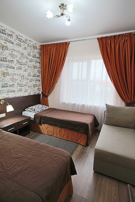 В номере установлены двуспальная кровать, две односпальные кровати и в качестве дополнительного места для пятого человека - раскладная очень комфортная кушетка (полноценное односпальное место).