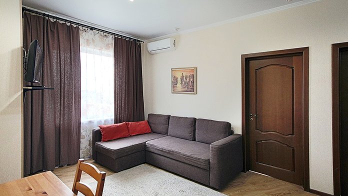 Одна комната - спальня с двуспальной кроватью. Другая комната - спальня с двухярусной кроватью и двуспальным раскладным диваном-кроватью. Третья комната - гостиная-кухня с комфортным кухонным уголком, газовой плитой и двуспальным раскладным диваном-кроватью. В апартаментах имеются: телевизоры в каждой комнате, сплит-системы в каждой комнате, набор посуды, большой холодильник, санузел с ванной. Имеется сушилка для белья. Номер оборудован сетью Wi-Fi.