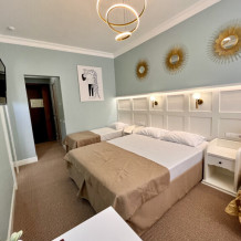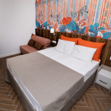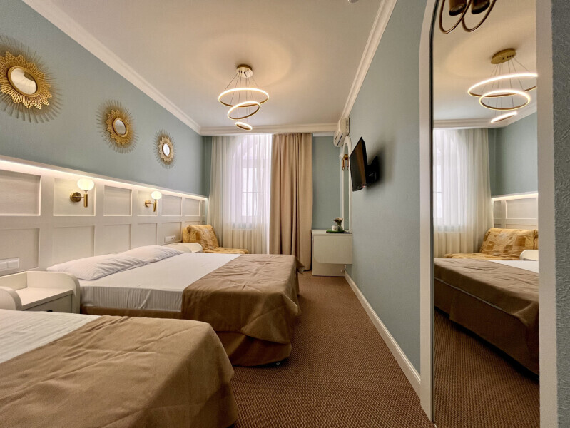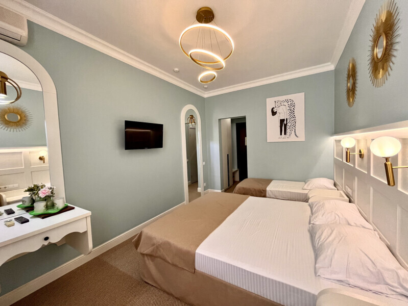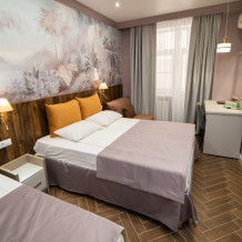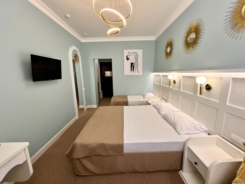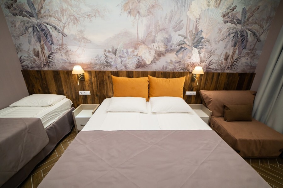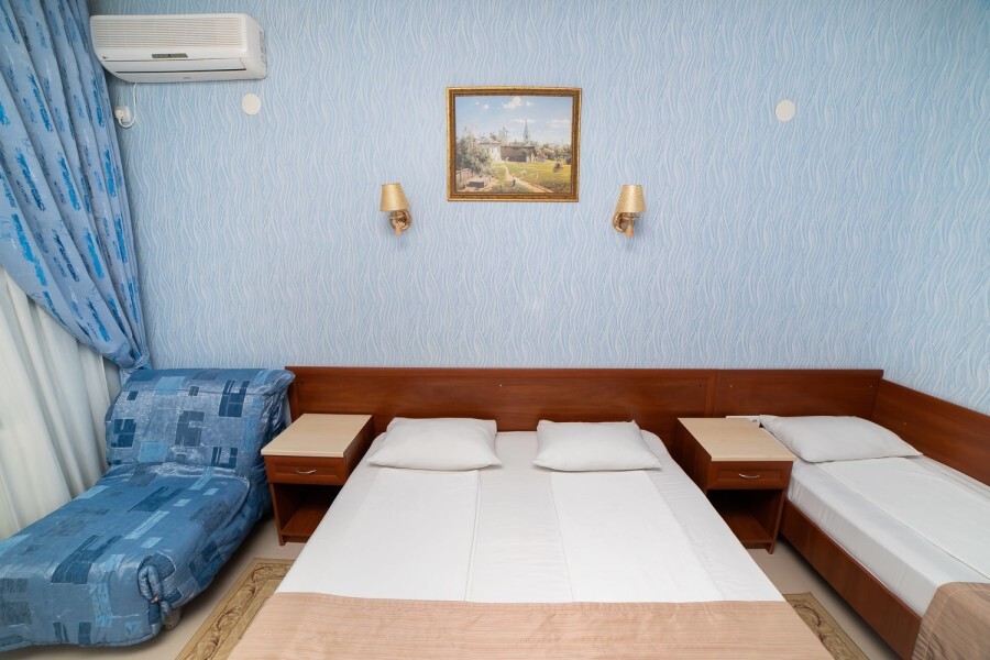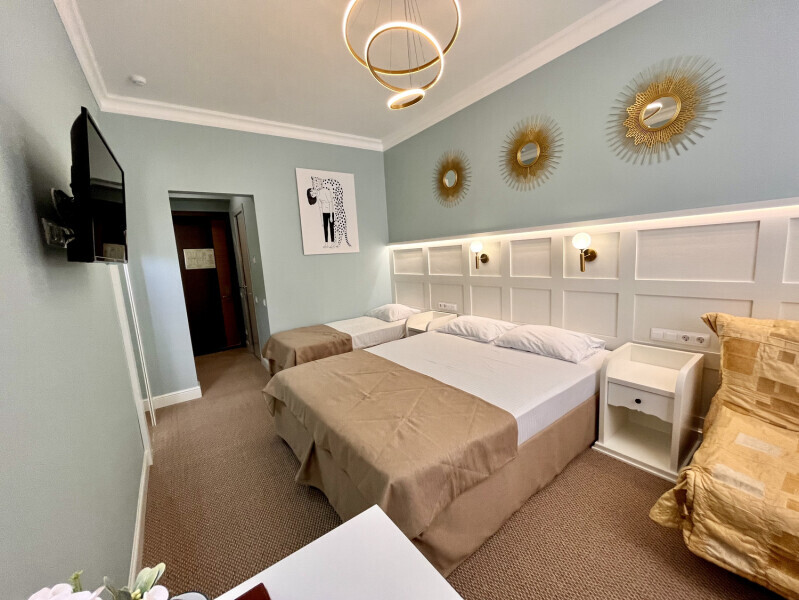 Есть возможность размещения как на 1 двуспальной и 1 односпальной кровати, так и на 3-х односпальных кроватях.