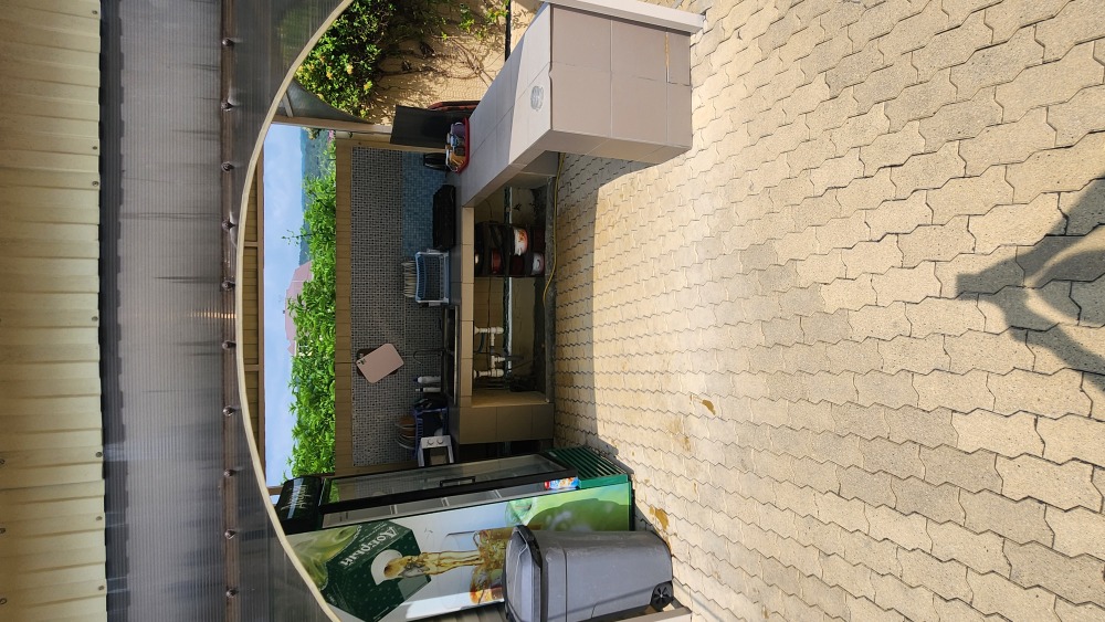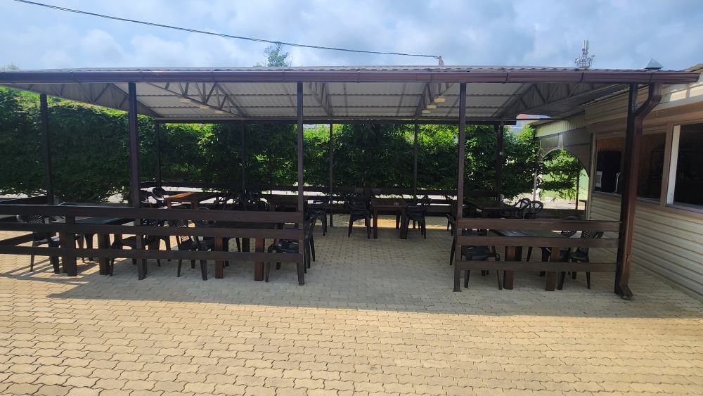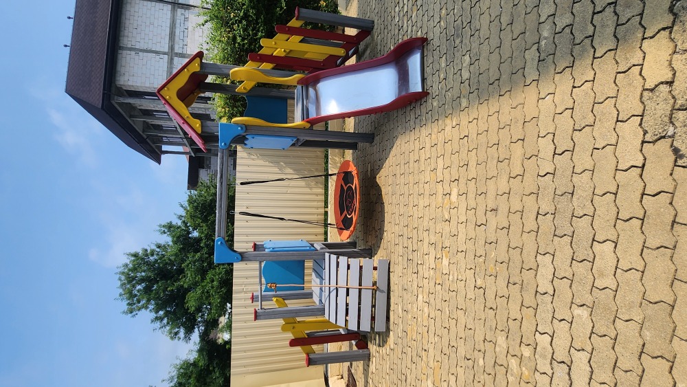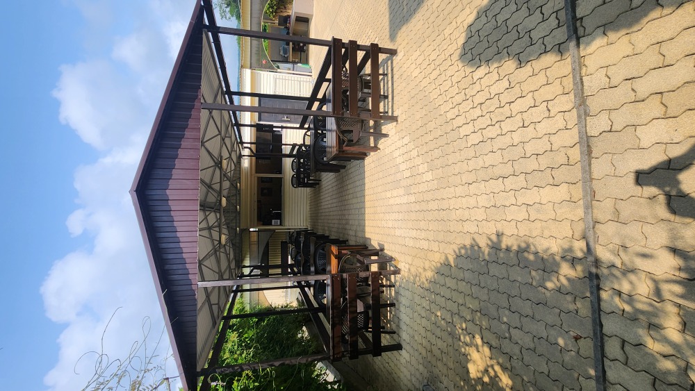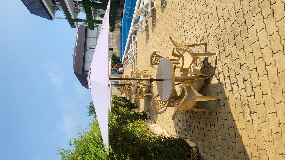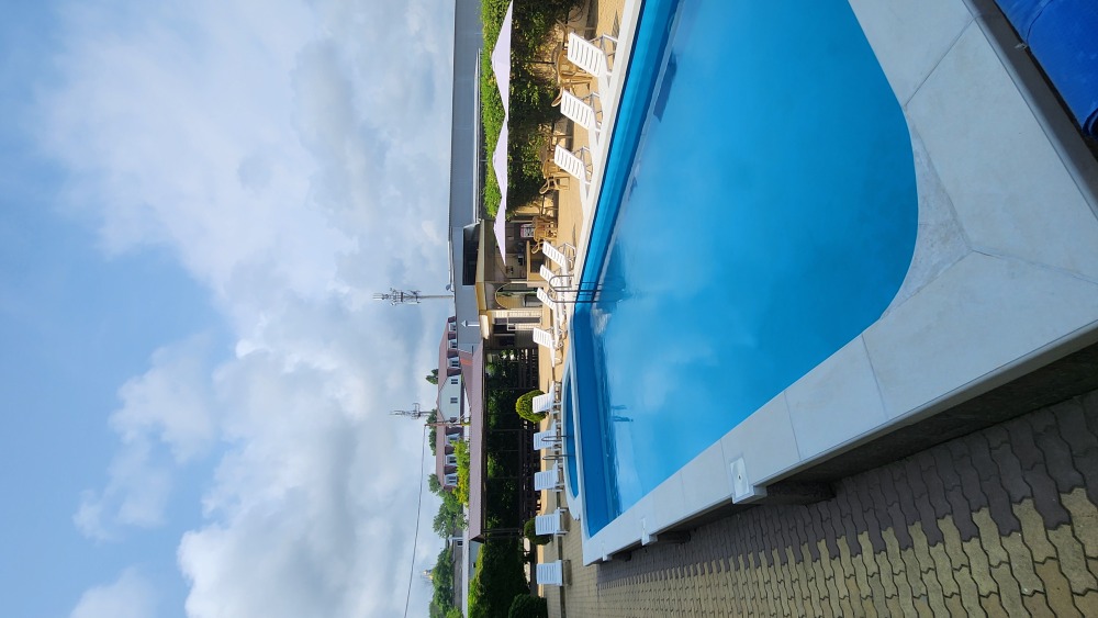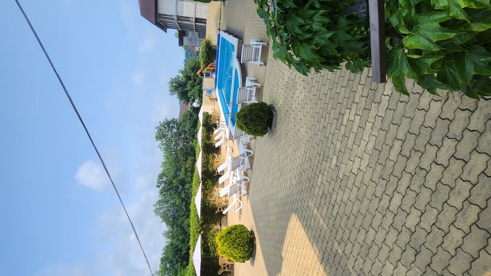 Перед корпусом находится большая территория, уложенная брусчаткой. Здесь основную часть занимает просторный бассейн с детской зоной, вокруг шезлонги и индивидуальные столики с тенистыми зонтами, рядом летнее кафе, зона отдыха с мангалом. Недалеко от бассейна установлен комплекс с горкой для малышей. В отеле работает сауна, поэтому в прохладные дни можно погреться от души. Для самостоятельного приготовления, частный отель предоставляет оборудованную кухню с обеденным залом. В жаркую пагоду работает сплит-система, поэтому здесь всегда комфортная температура для приёма пищи. Туристам, путешествующим на автомобиле, предоставляется парковка во дворе.
