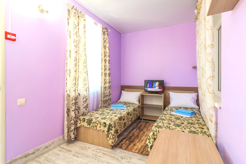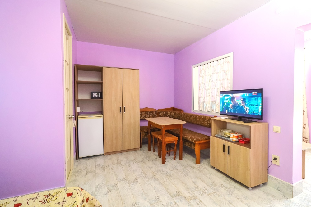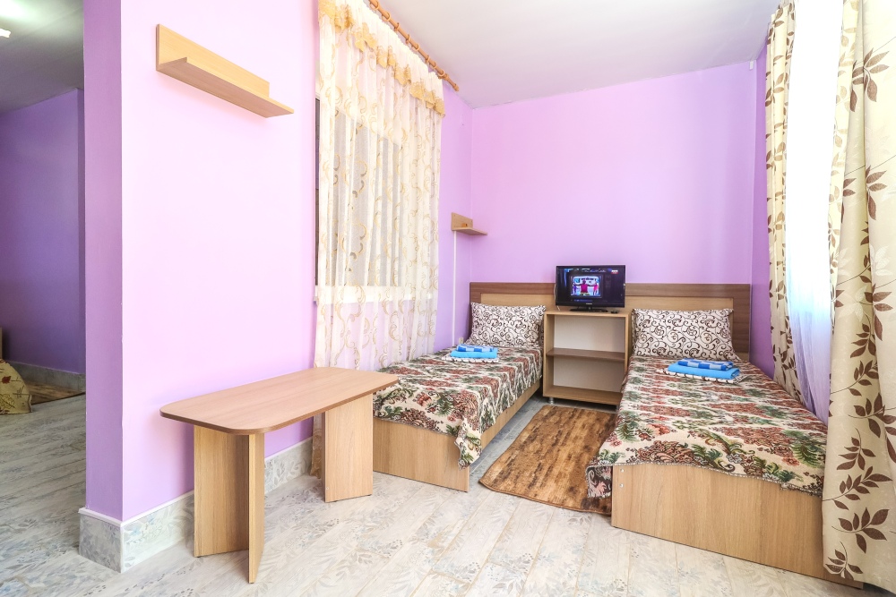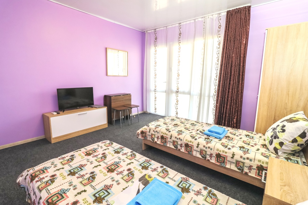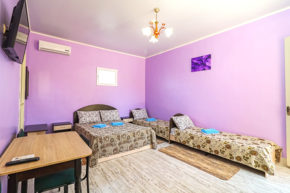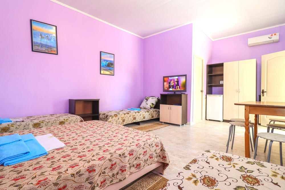 В номере: двуспальная и 2 односпальные кровати с прикроватными тумбочками, напольная вешалка, сейф, зеркало, стол со стульями, бельевой двухстворчатый комбинированный шкаф, жк телевизор, холодильник, санузел (душ, унитаз, раковина, горячая и холодная вода круглосуточно бесперебойно), климат система (кондиционер). В номере предоставляется: комплекты постельного белья, махровые одеяла, полотенца для лица и ног, расходный материал.