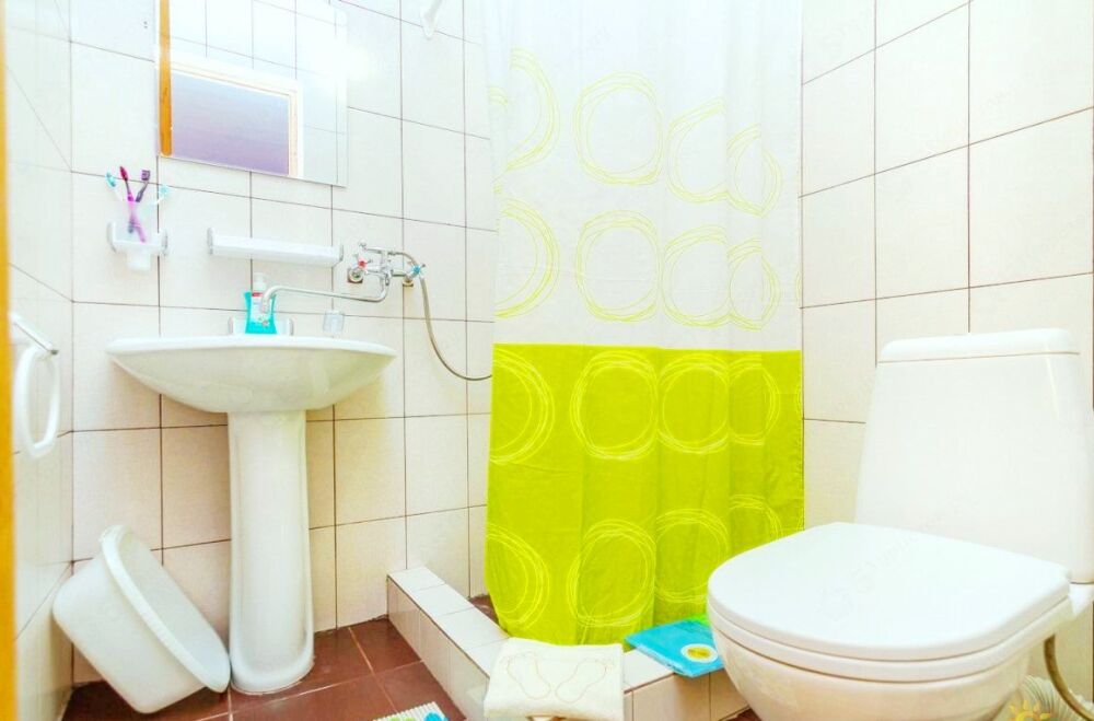 комплект постельного белья, махровые одеяла, полотенца для лица, ног, банное и пляжное; расходный материал (туалетная бумага, жидкое мыло); посуда (чайник, тарелки, стаканы, чашки и столовые приборы).