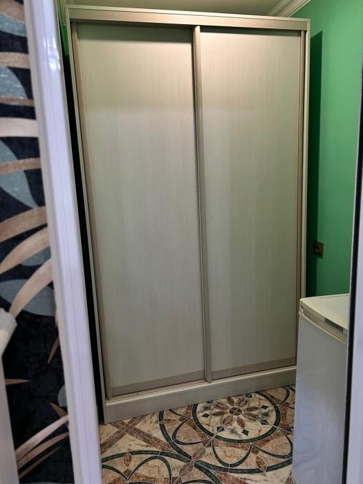 В прихожей стоит шкаф, зеркало во весь рост, гладильная доска, пылесос.