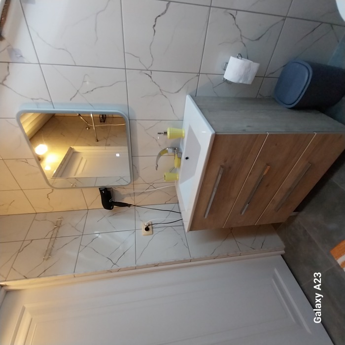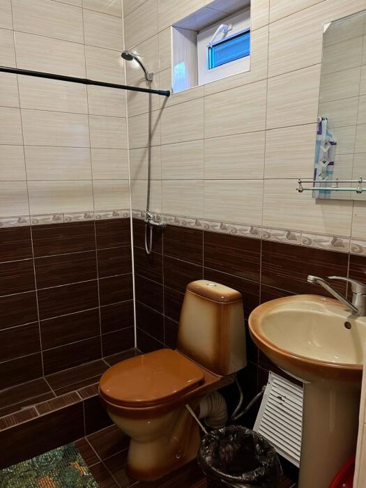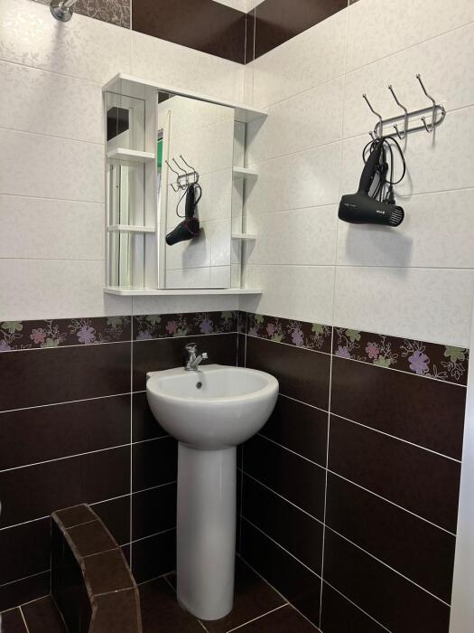 В санузле душ, туалет, зеркало с подсветкой, шкафом раковиной, душ, фен, полотенца банные, для рук, моющее средство для унитаза и раковины.