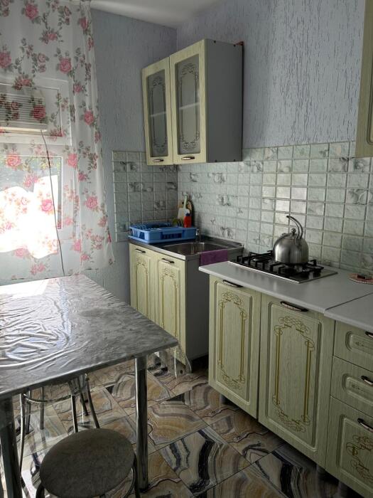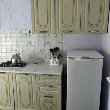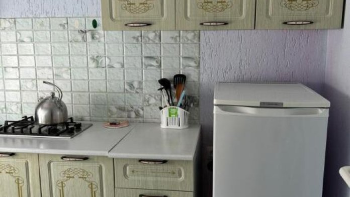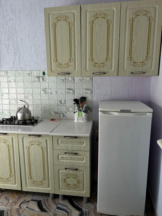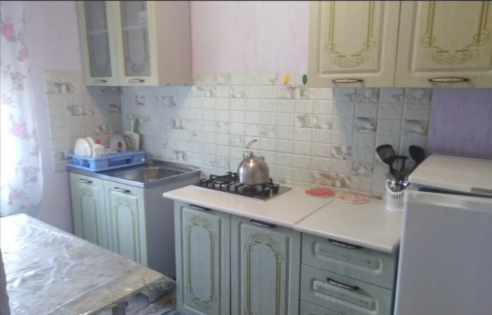 В кухне есть холодильник, микровол.печь, плита газовая, раковина, телевизор, диван, стол, посуда.