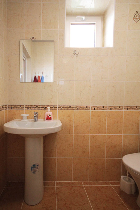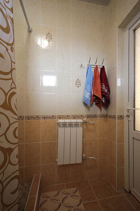 На просторном зеленом дворе гостевого дома стоит каркасный бассейн и удобные шезлонги для принятия солнечных ванн. Рядом с бассейном располагается детская площадка: батут с безопасным ограждением, маленькие качели, горка с лесенкой и скалолазным уклоном. Так же на территории есть несколько столиков, большие качели с навесом, напротив которых построен красивый многоуровневый фонтан.