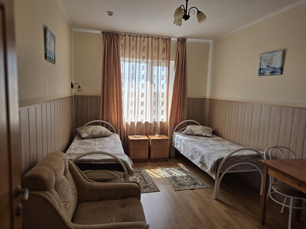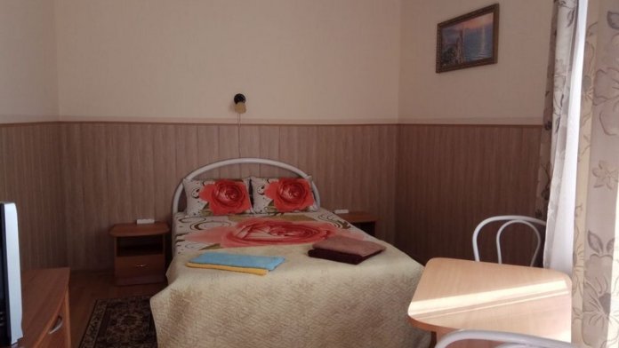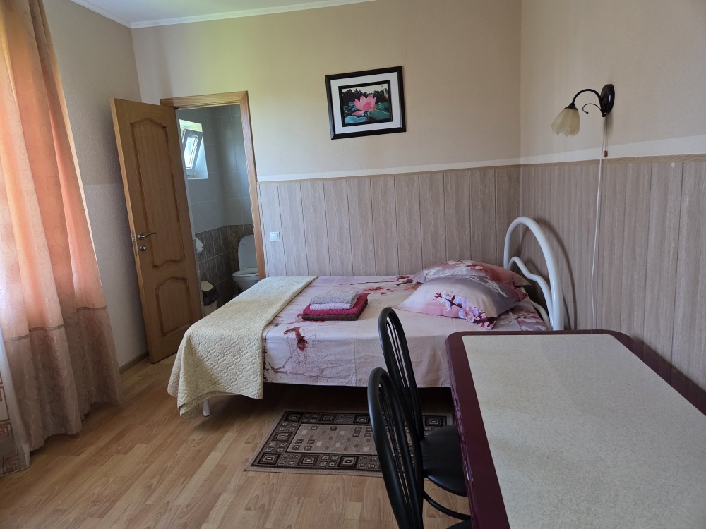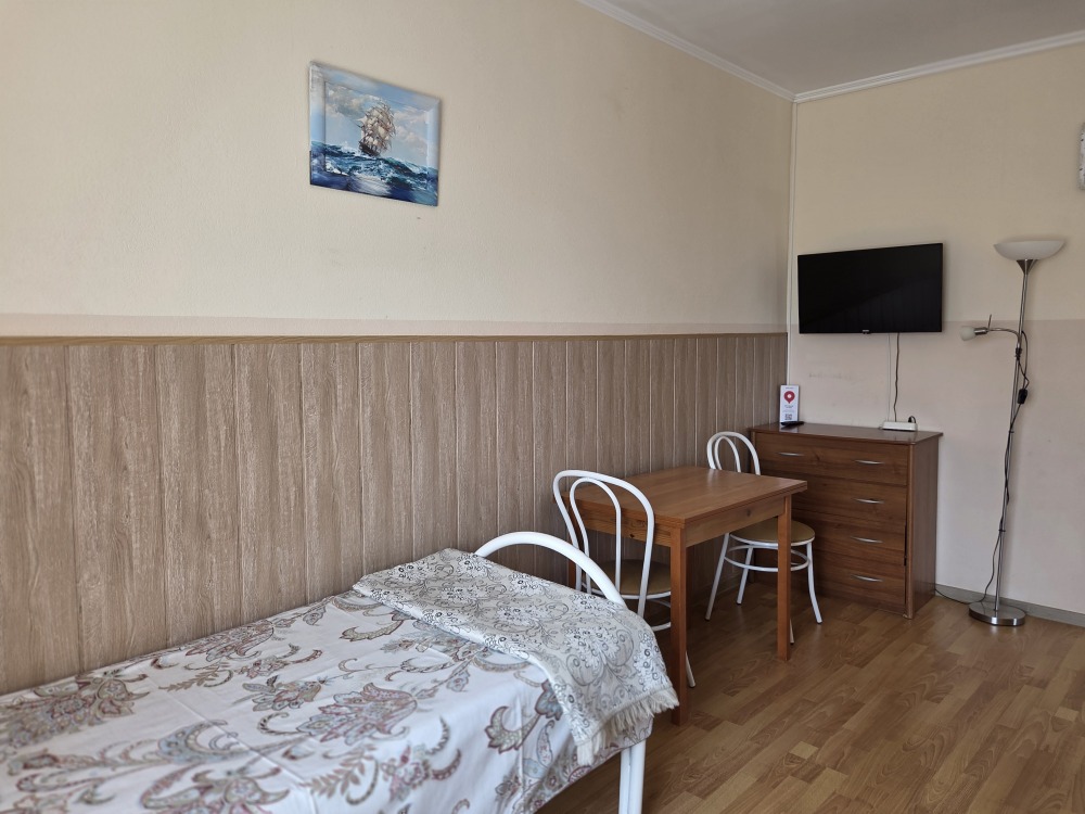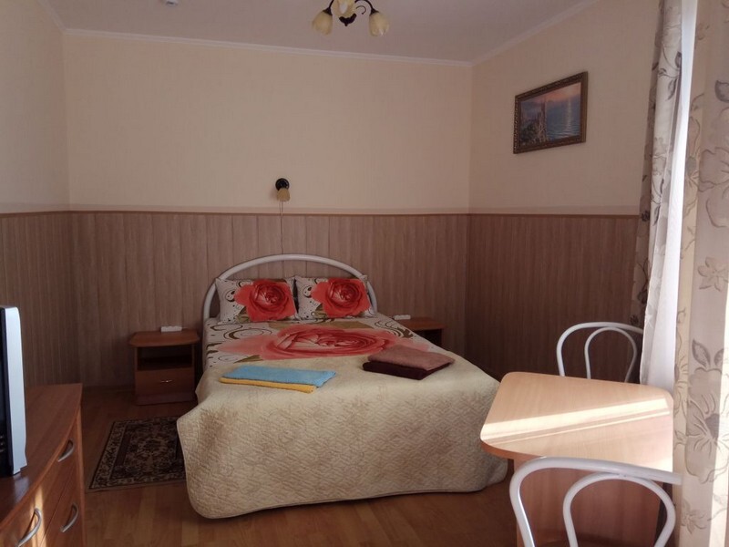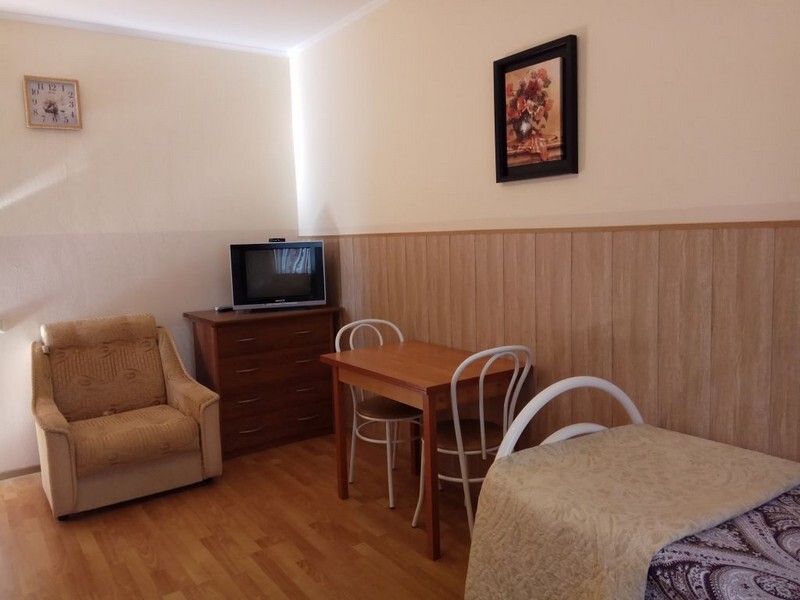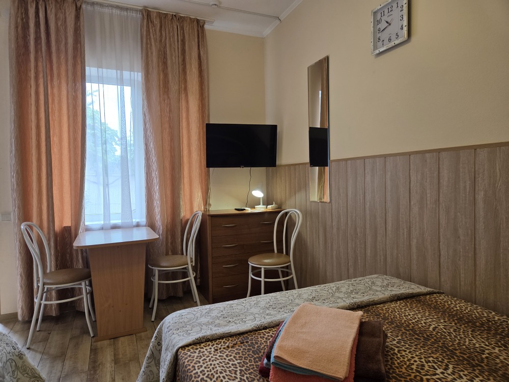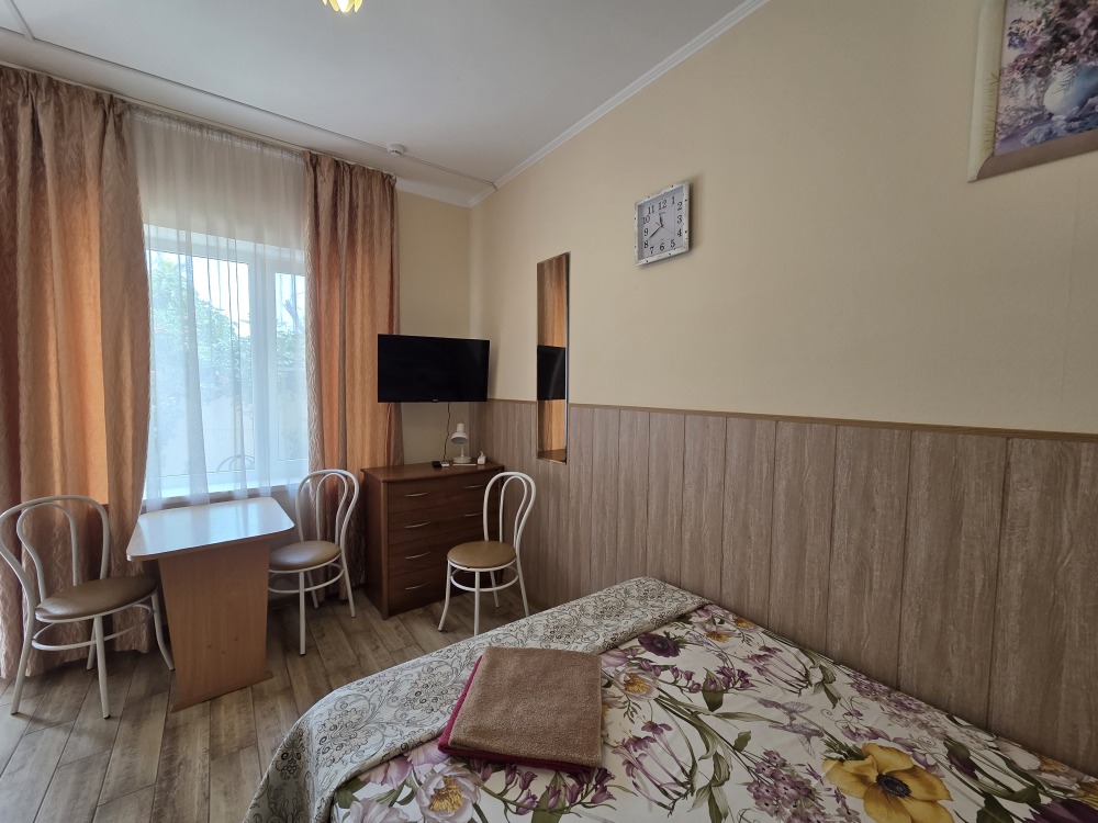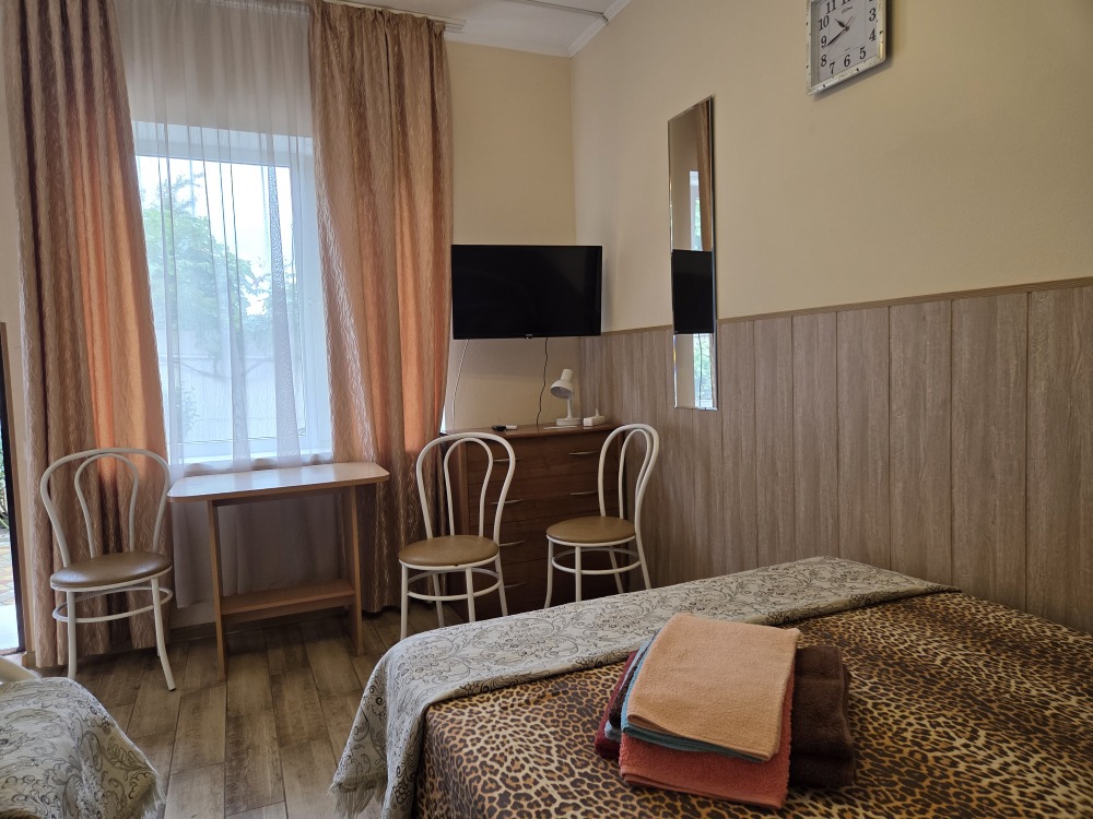 В номере холодильник,телевизор,кондиционер, душ,туалет. Одна 2хспальная кровать и одна односпальная,комод,тумбочка прикроватная,стол и стулья.