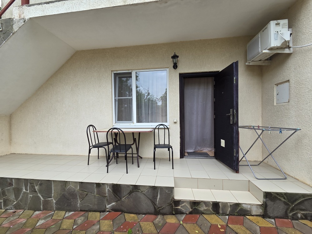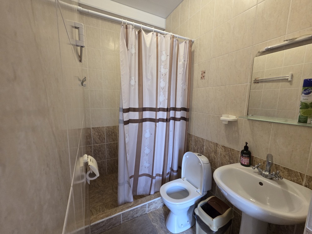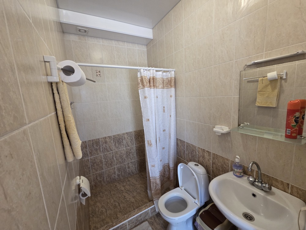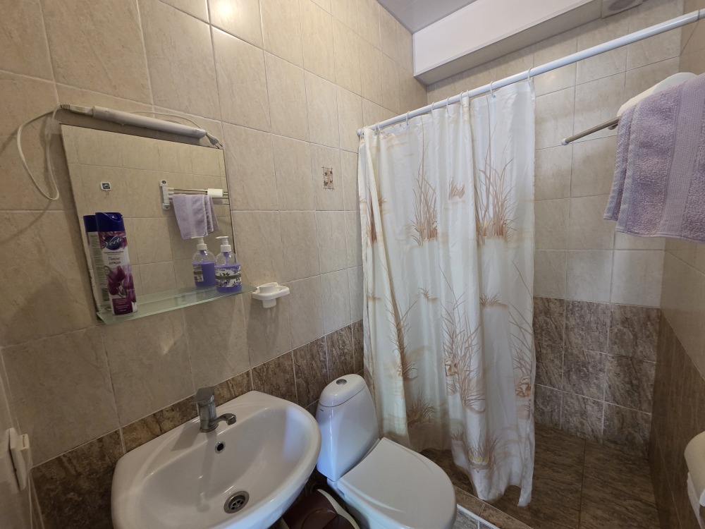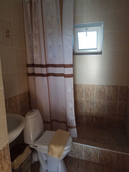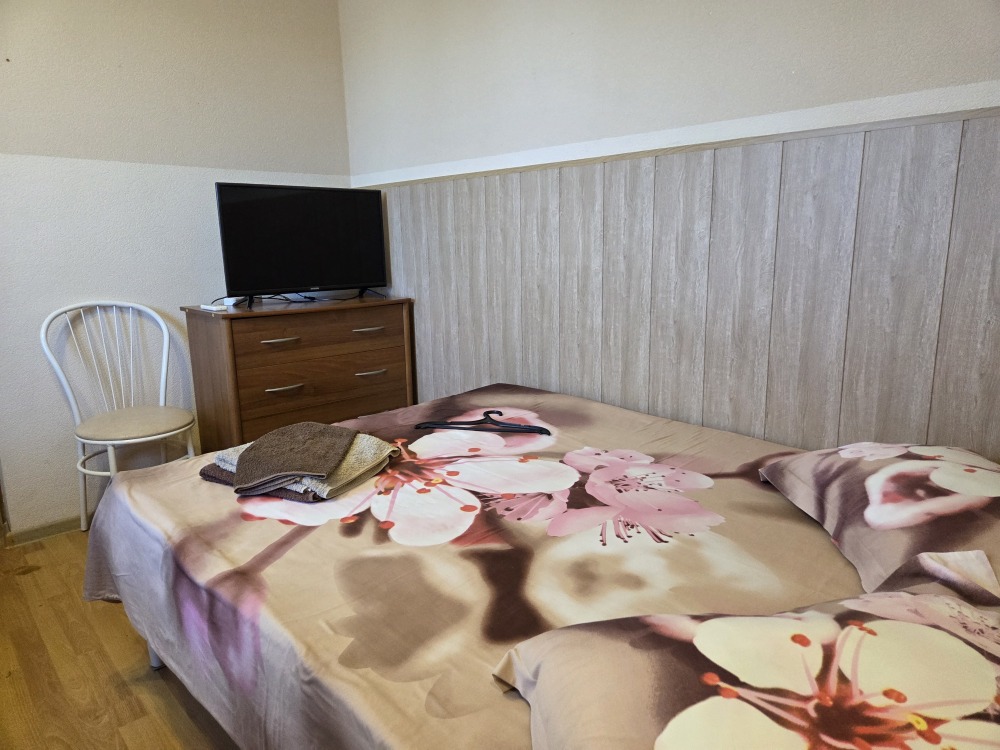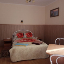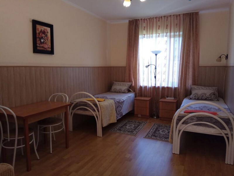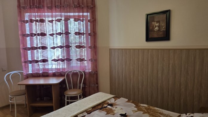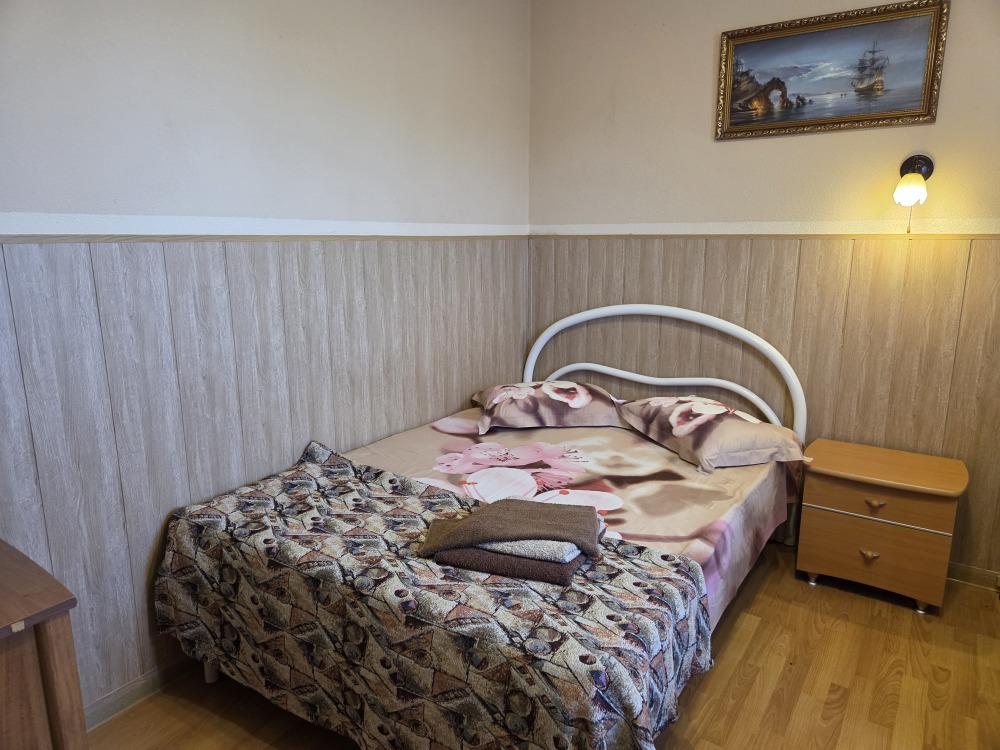 В номере холодильник,телевизор,кондиционер, душ,туалет. Одна 2хспальная кровать и одна односпальная,комод,тумбочка прикроватная,стол и стулья.