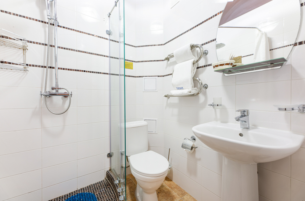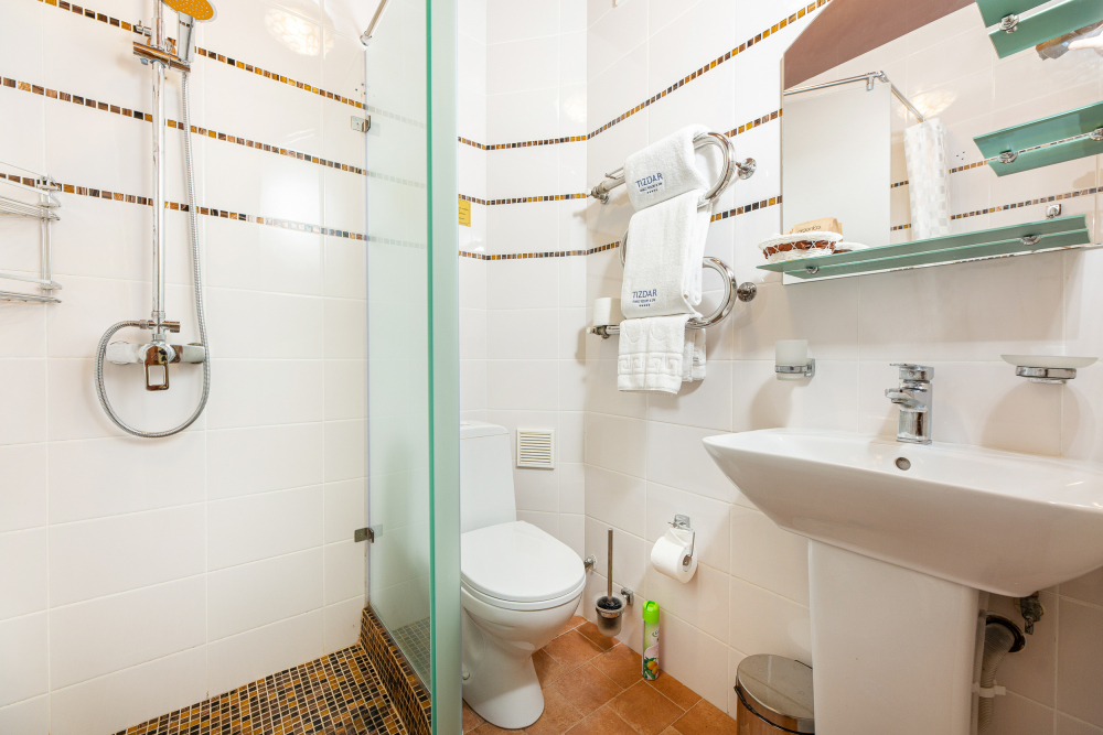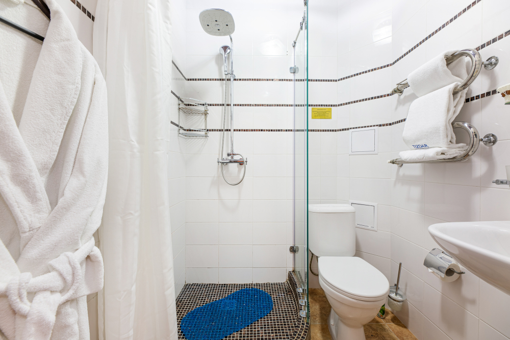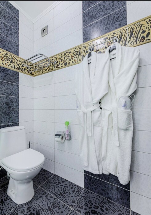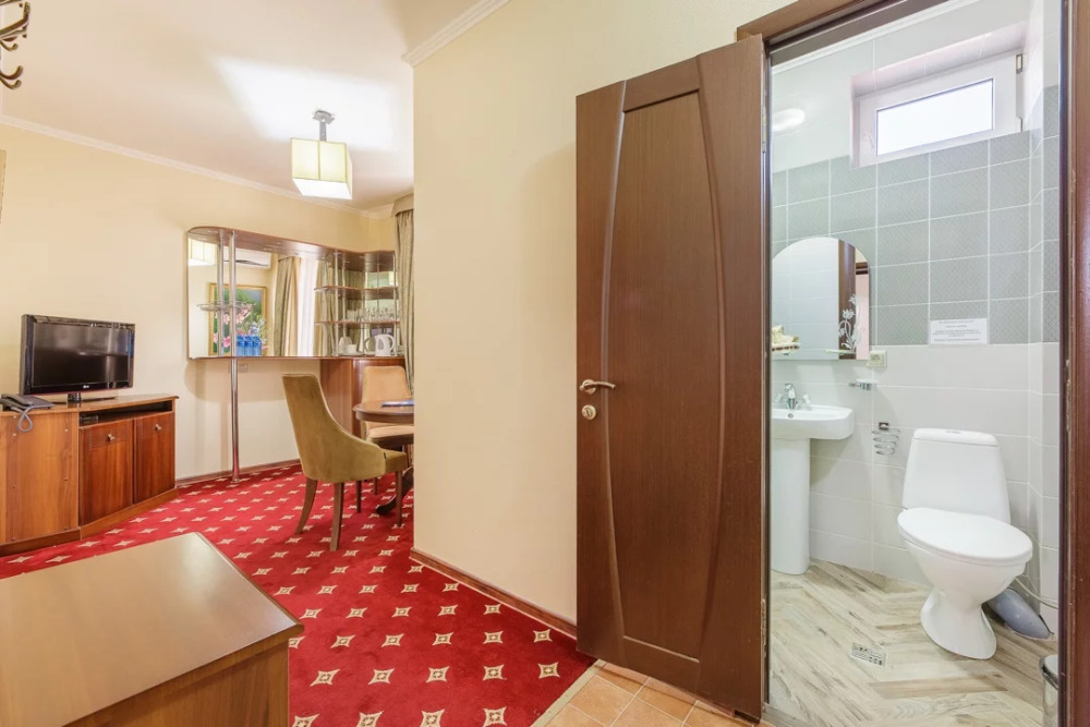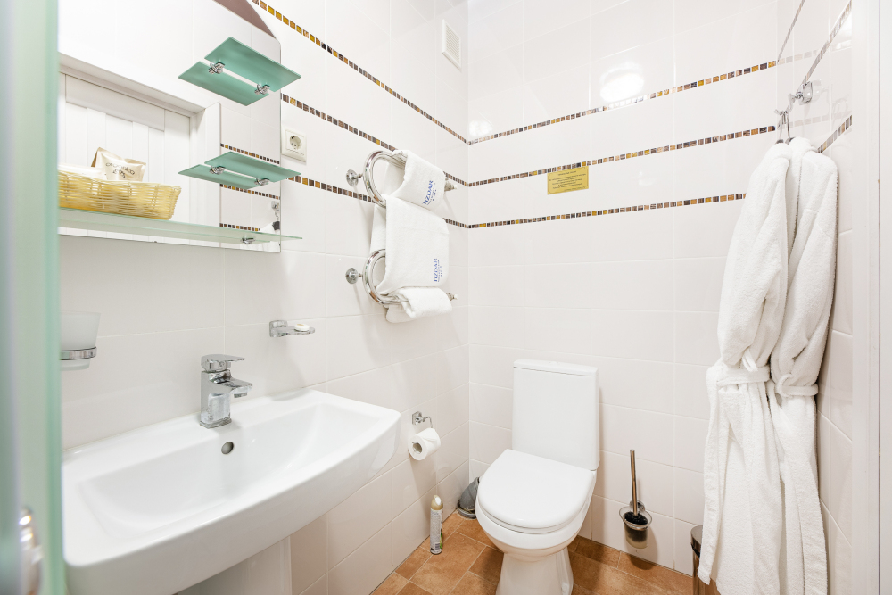 В ванной комнате: душ, косметическое зеркало, фен, банные принадлежности и гостиничная парфюмерия. В данной категории номеров 2 сан. узла.