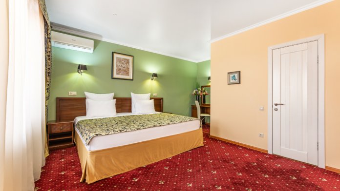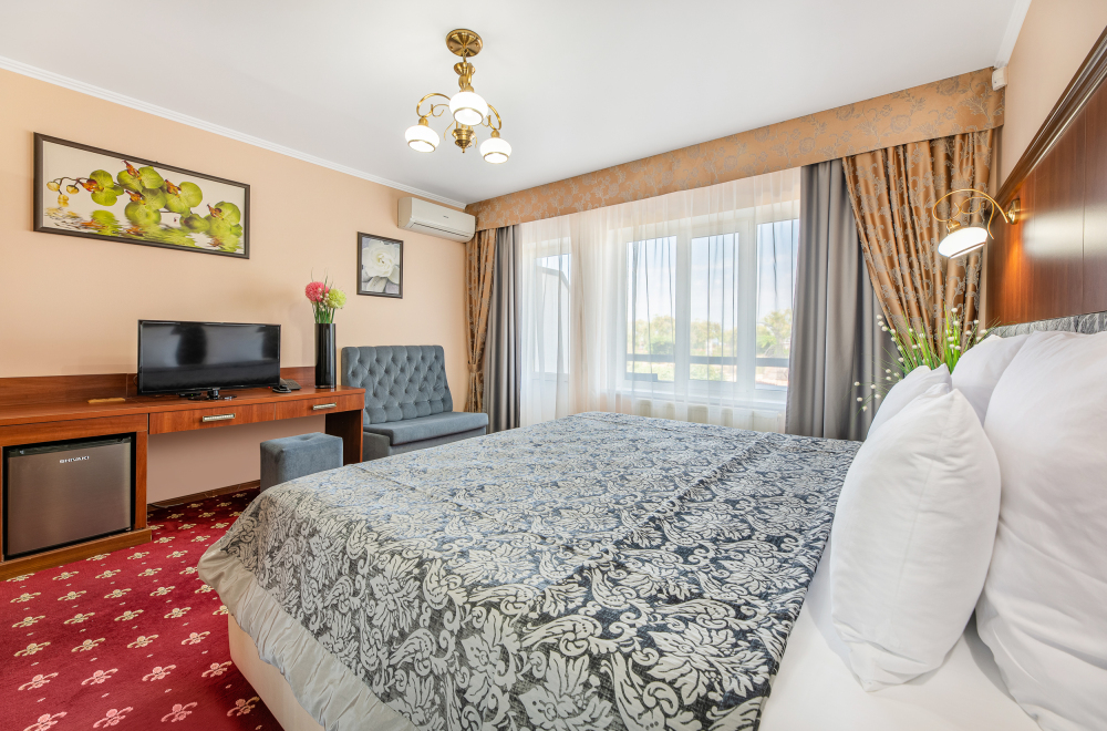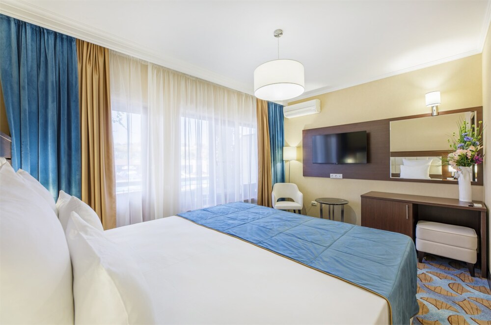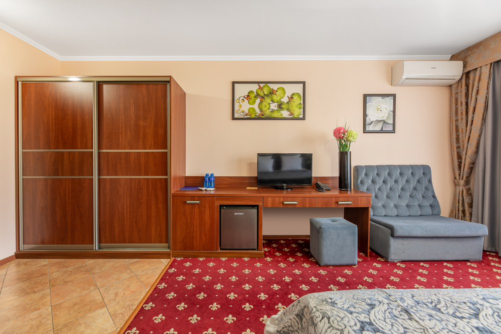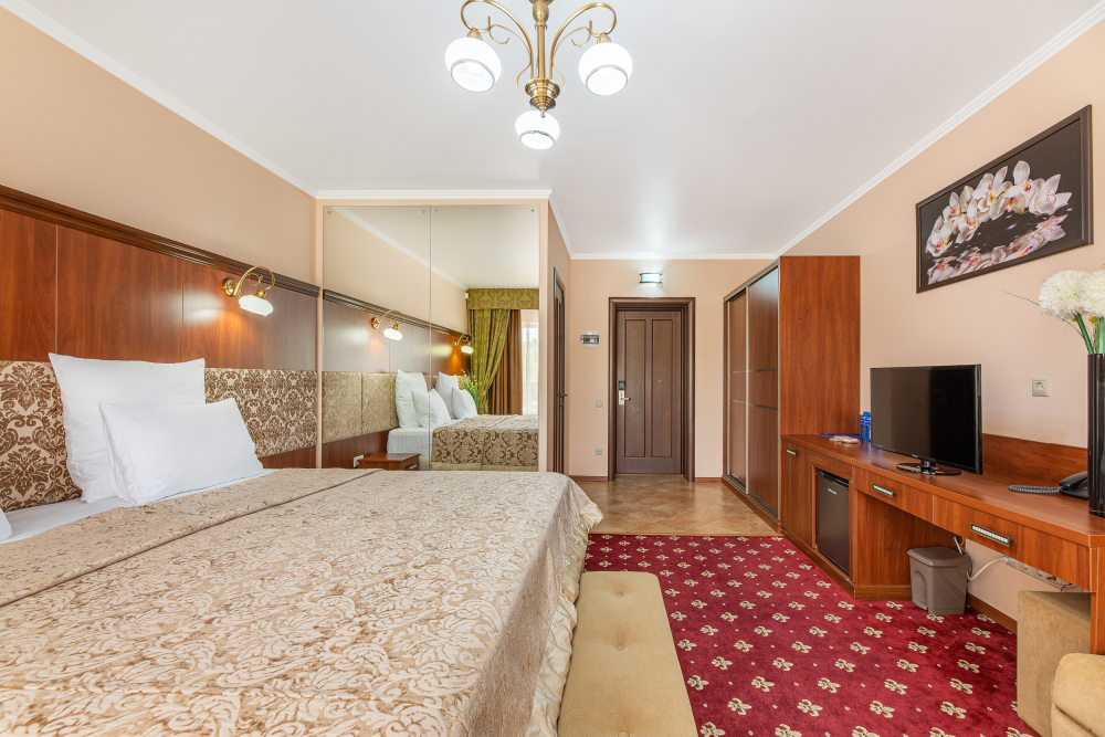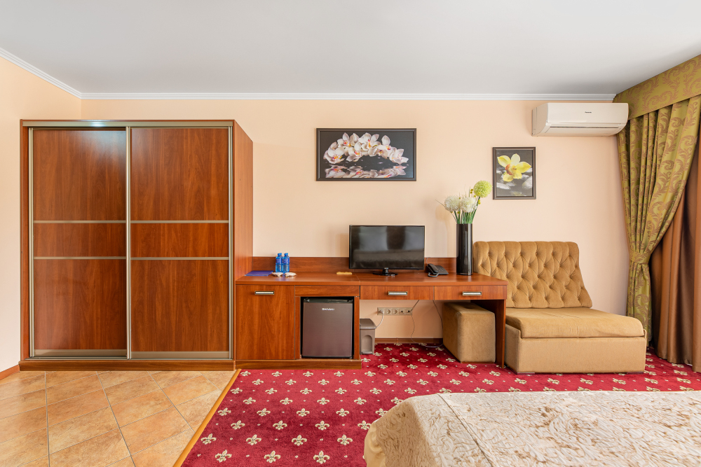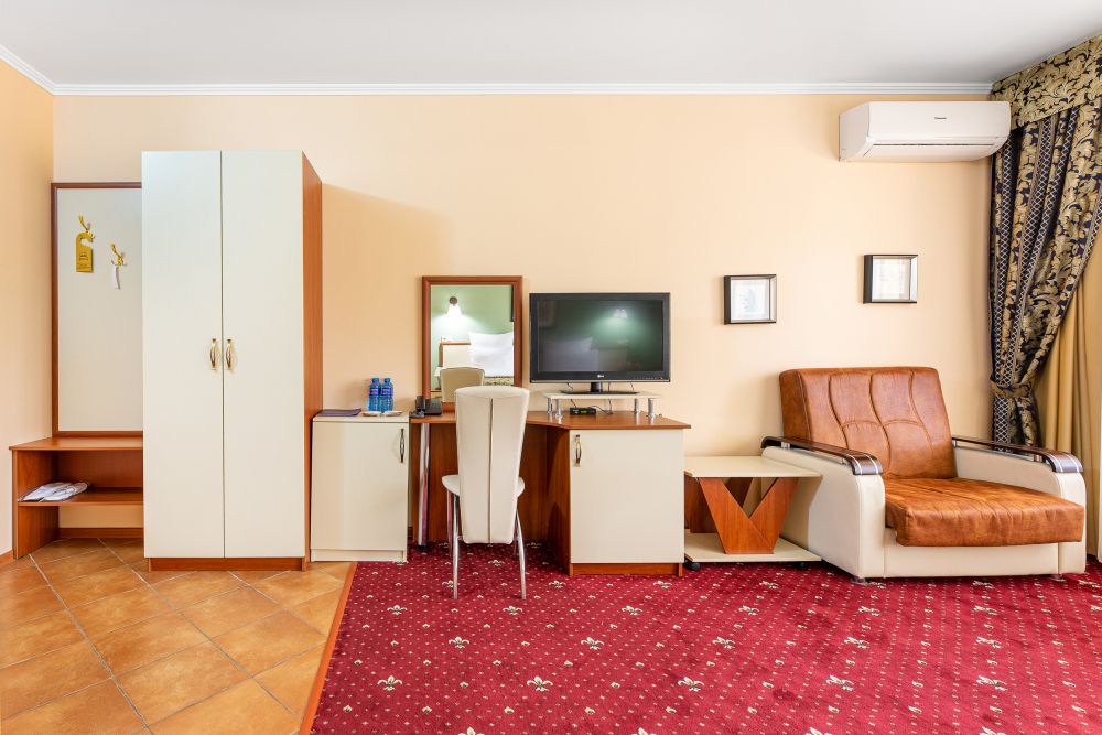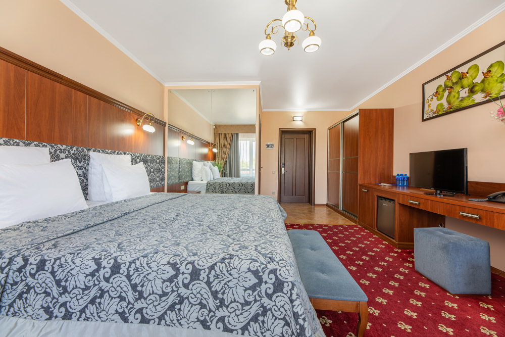 В номере: две односпальные кровати или кровать «King size» (200х200), кресло-кровать, софа, стол, мини-холодильник, телевизор, сейф, телефон, сплит-система, шкаф, балкон или терраса.
