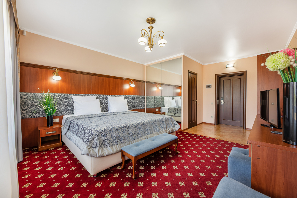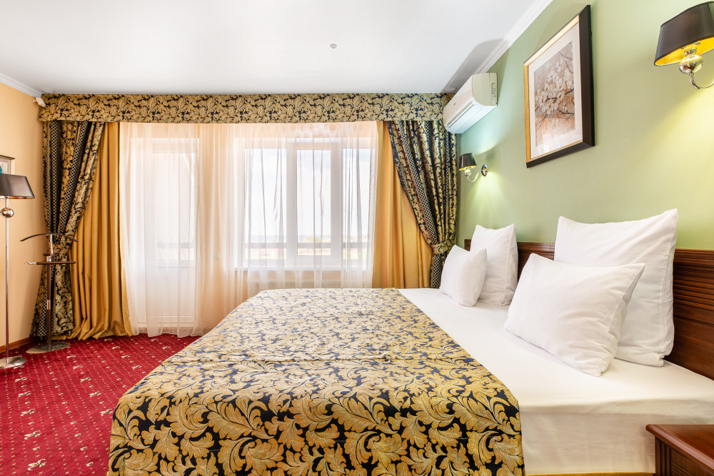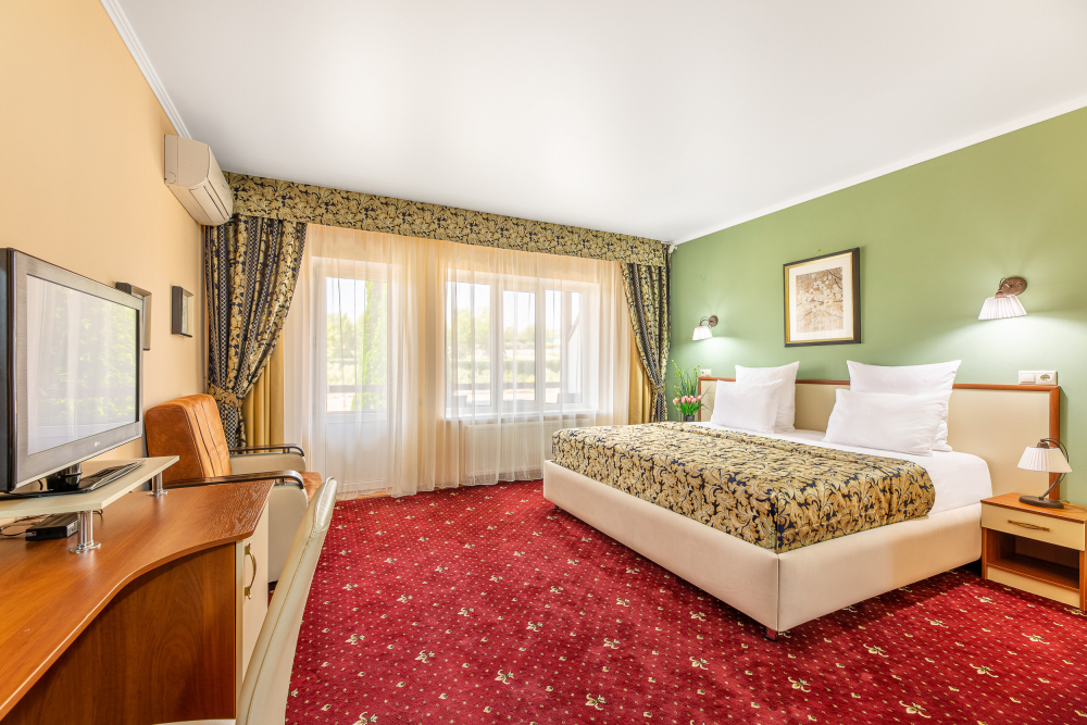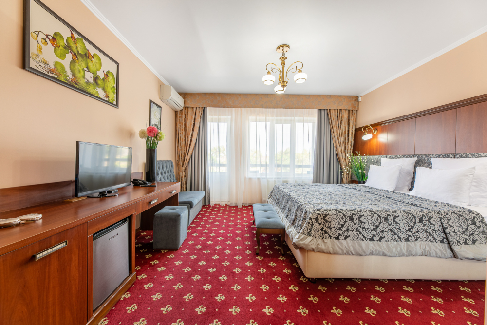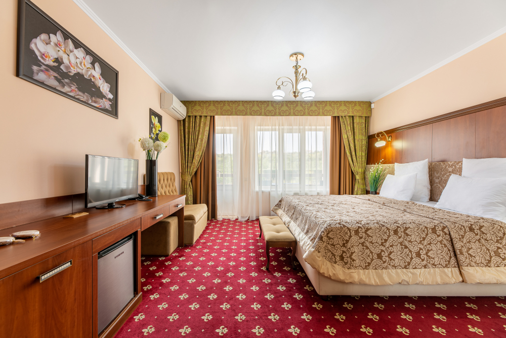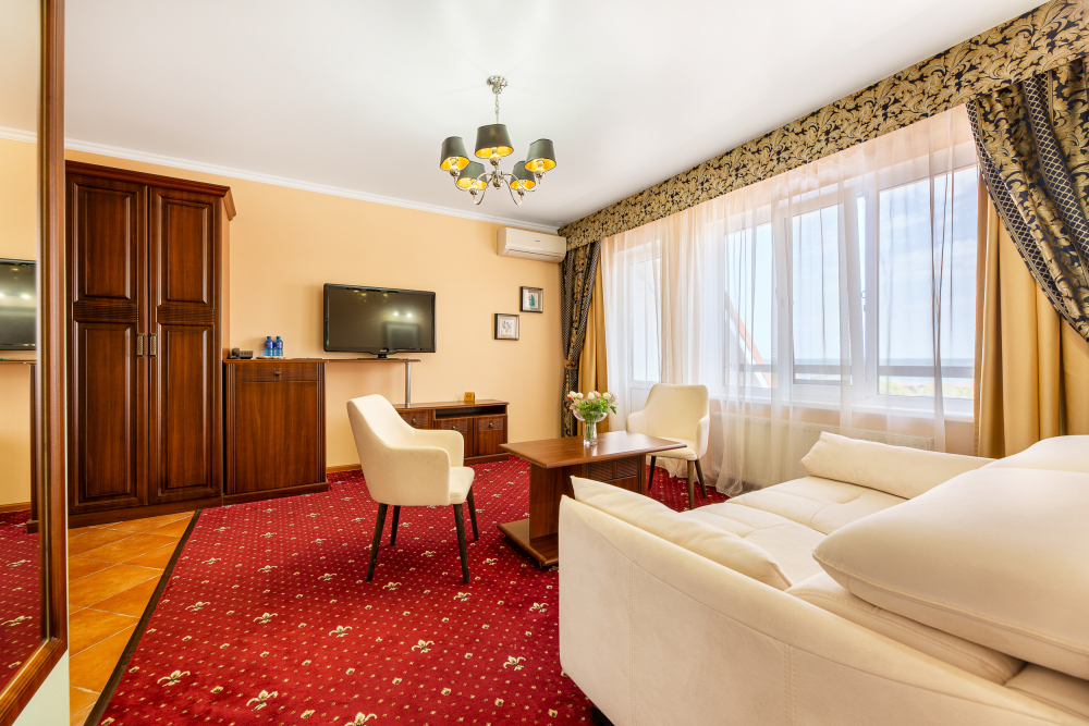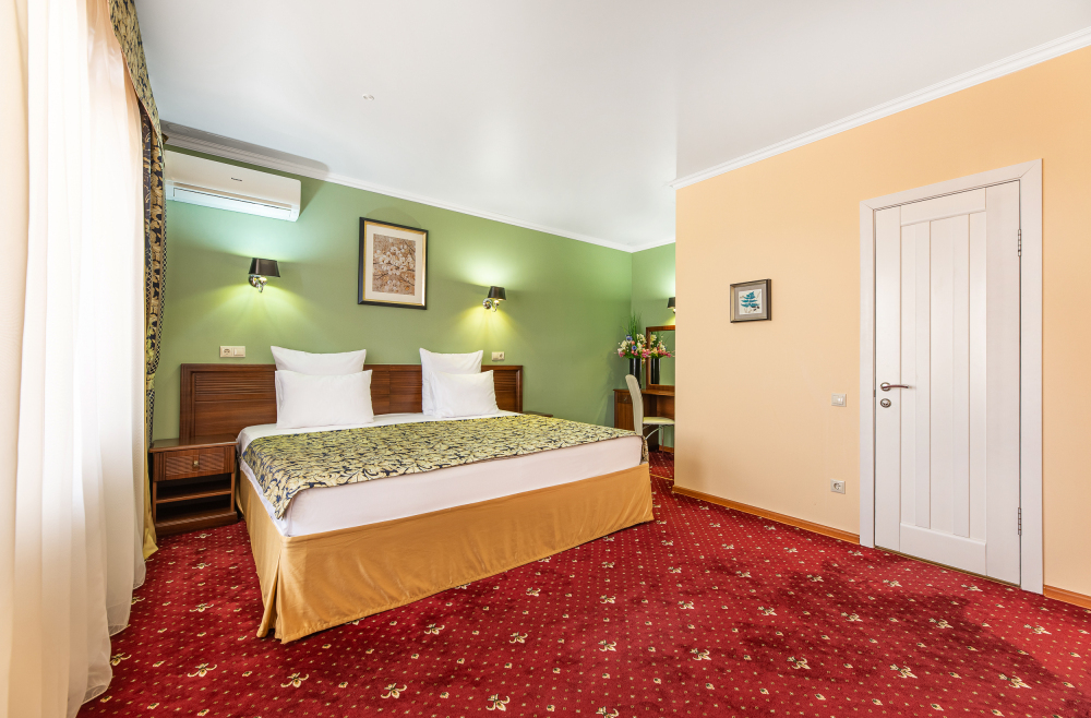 В номере: две односпальные кровати или кровать «King size» (200х200), кресло-кровать, софа, стол, мини-холодильник, телевизор, сейф, телефон, сплит-система, шкаф, балкон или терраса.