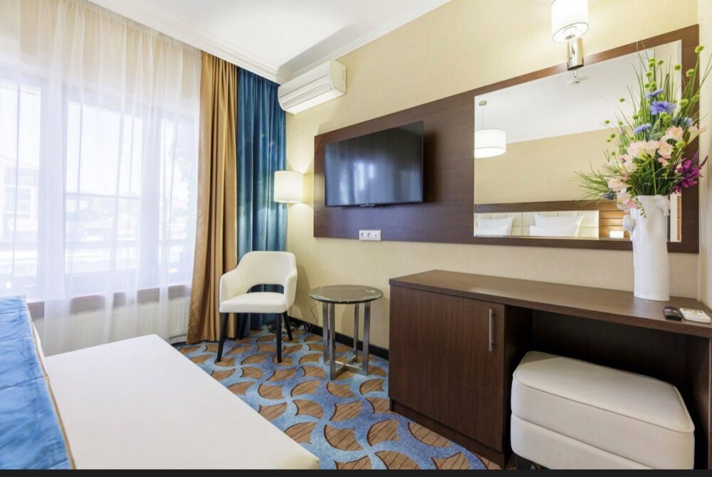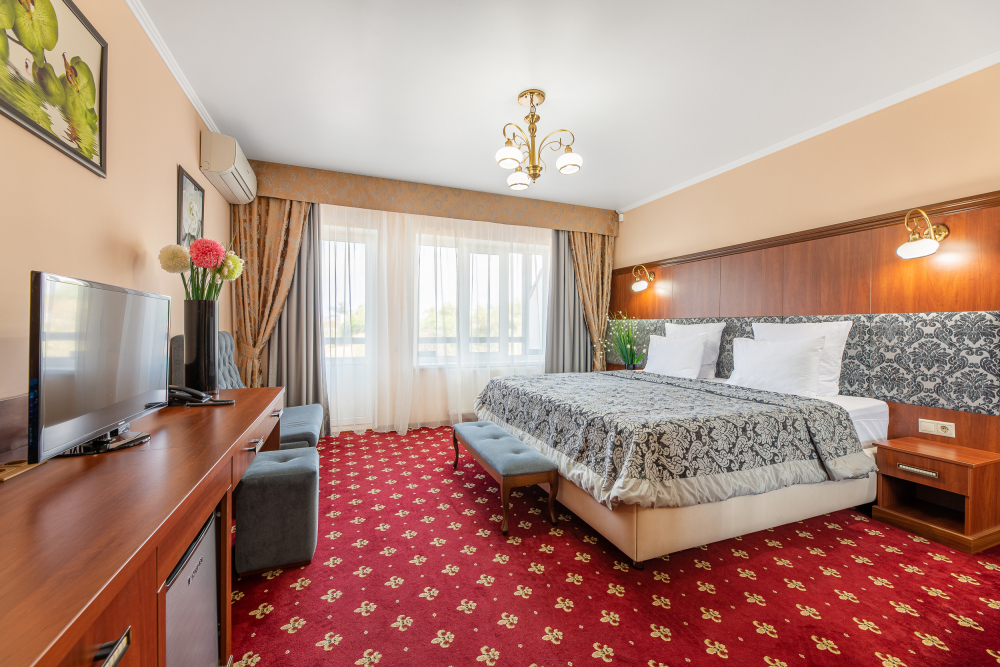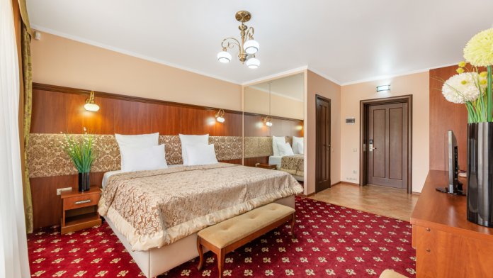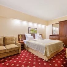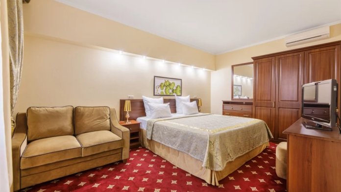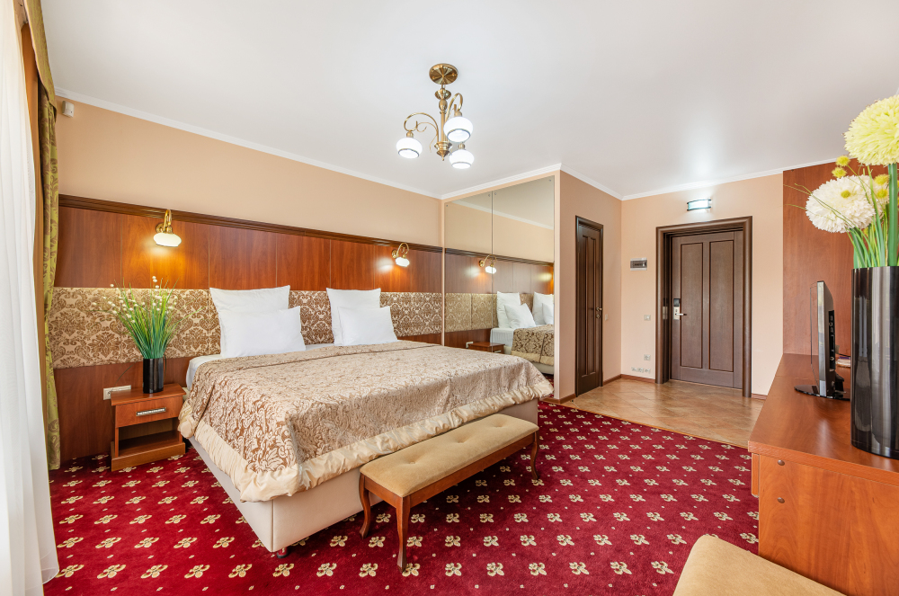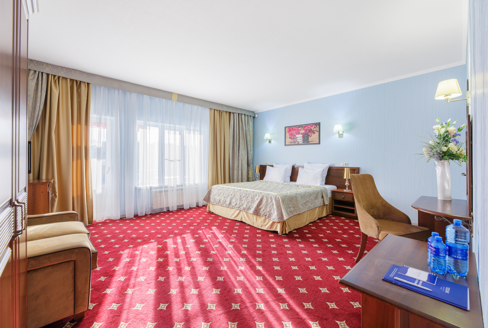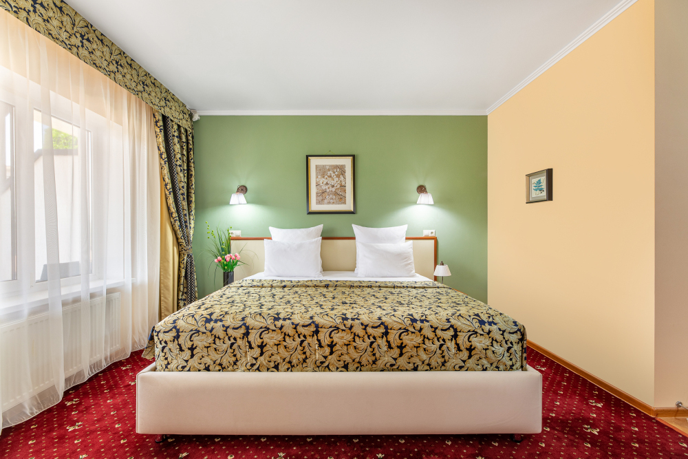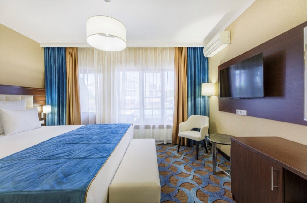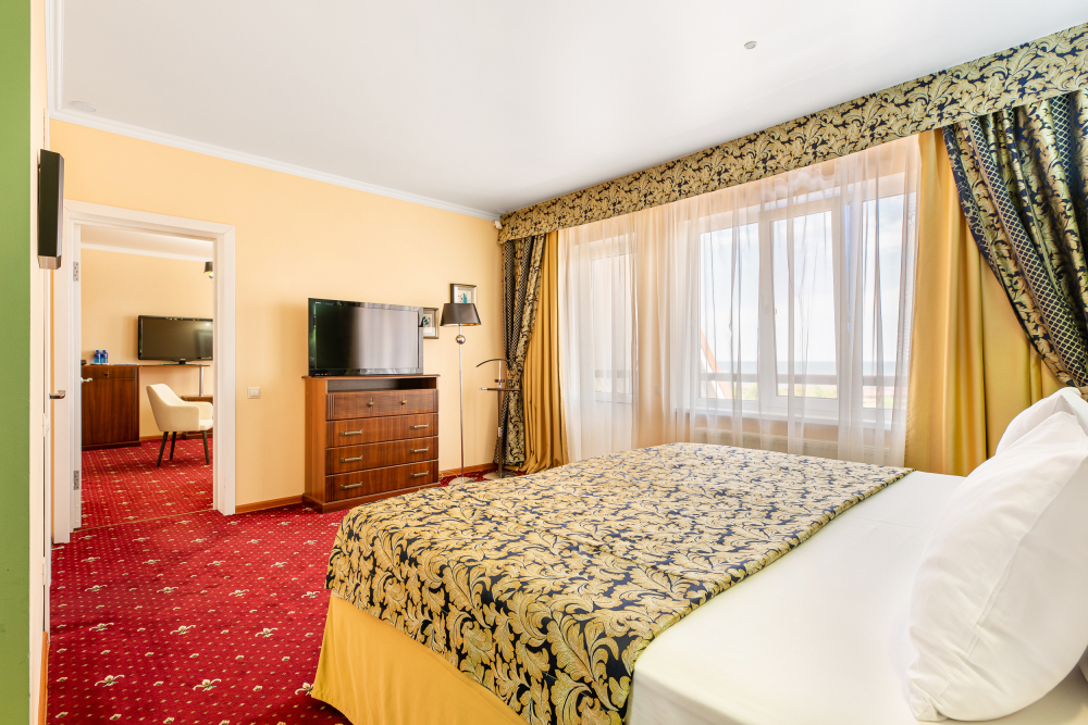 В номере: две односпальные кровати или кровать «King size» (200х200), кресло-кровать, софа, стол, мини-холодильник, телевизор, сейф, телефон, сплит-система, шкаф, балкон или терраса.