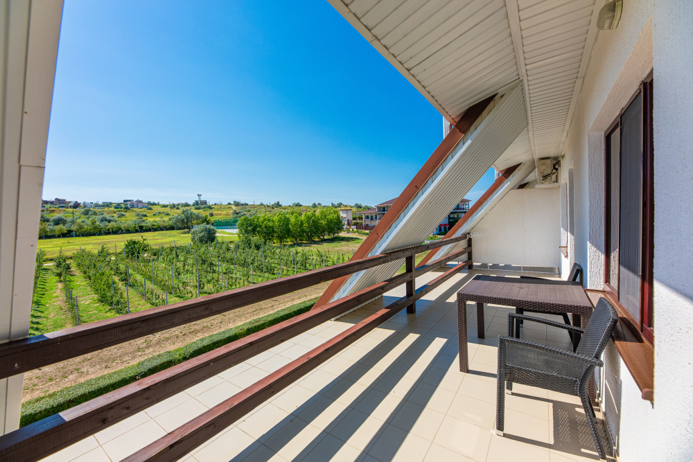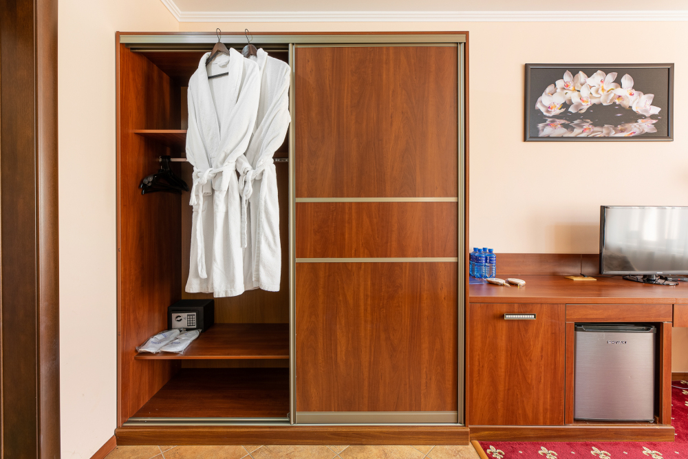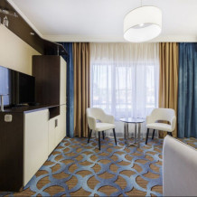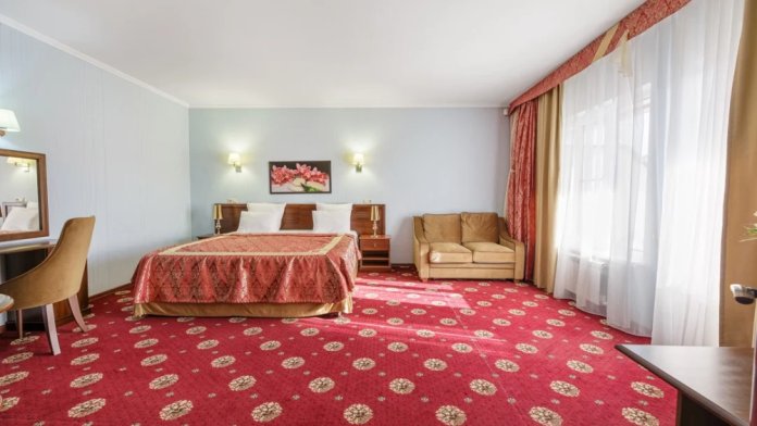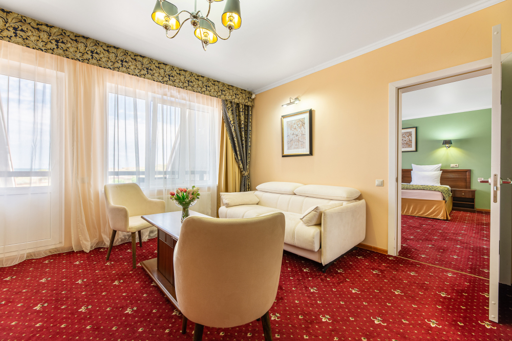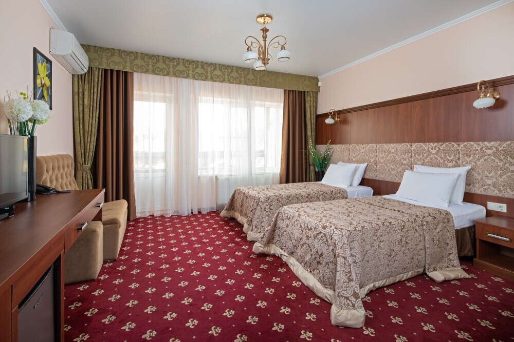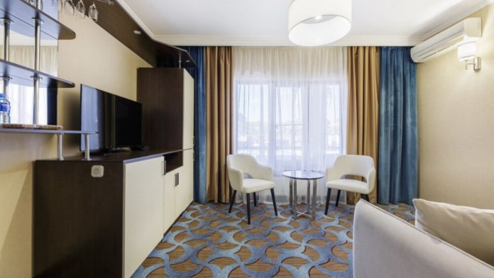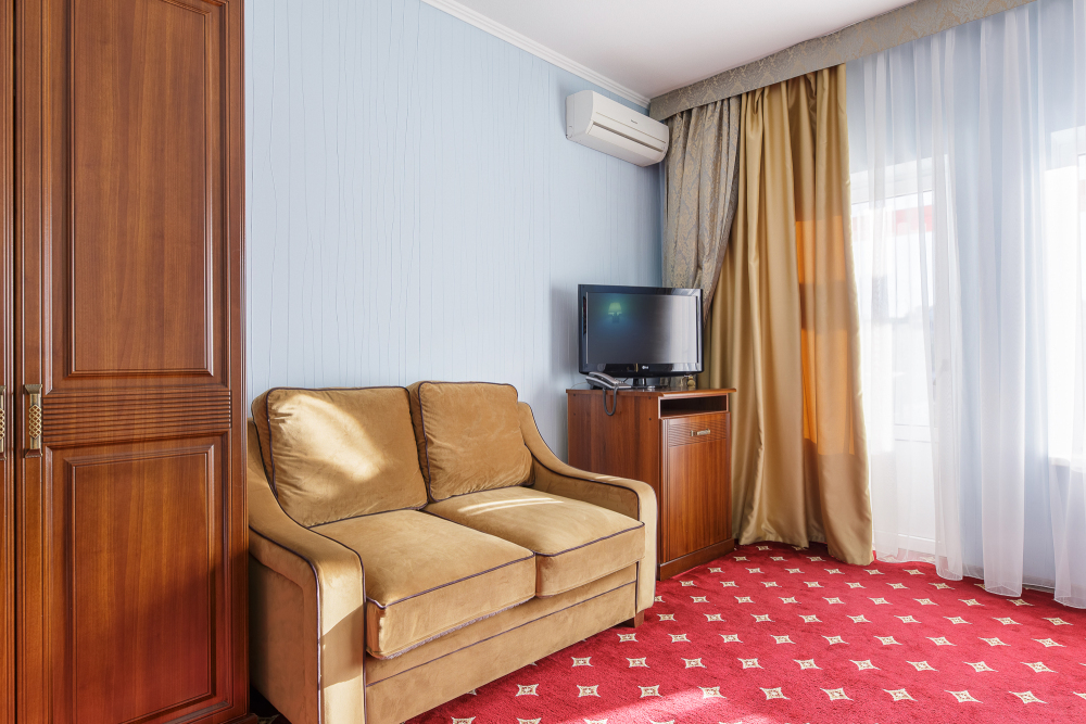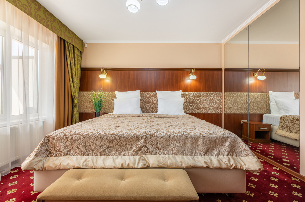 В номере: две односпальные кровати или кровать «King size» (200х200), кресло-кровать, софа, стол, мини-холодильник, телевизор, сейф, телефон, сплит-система, шкаф, балкон или терраса.