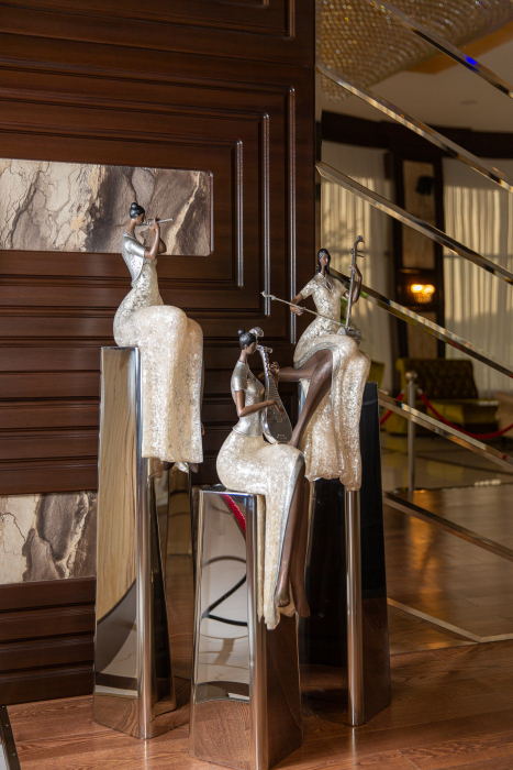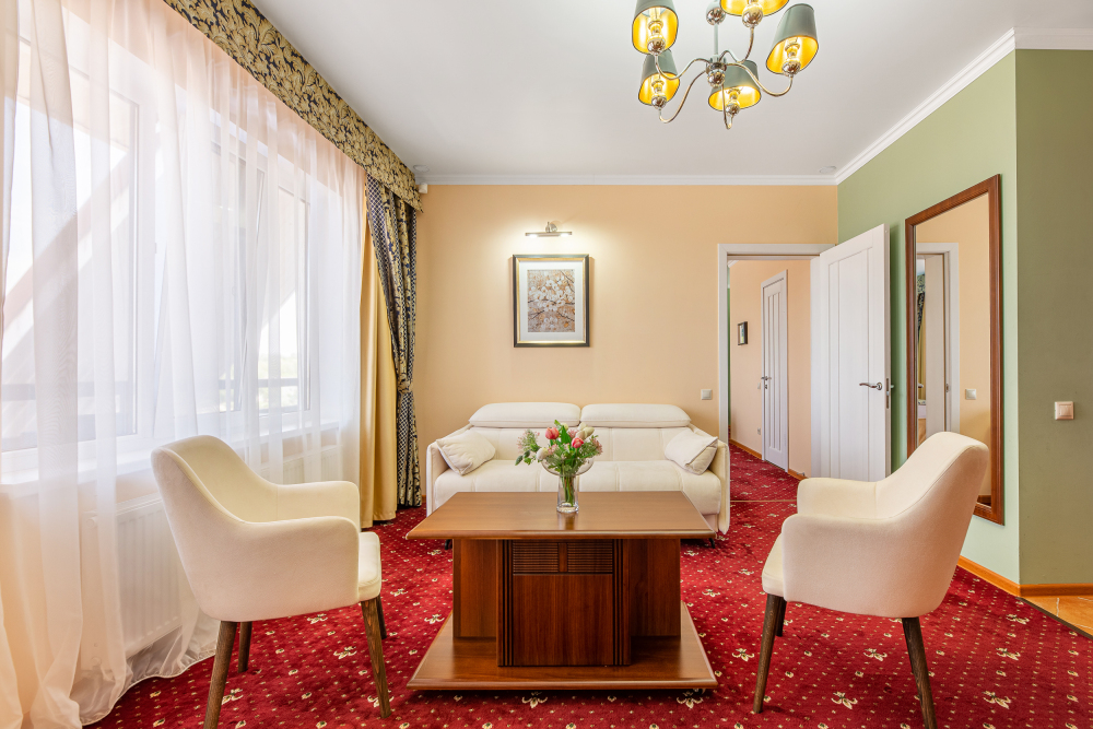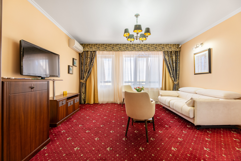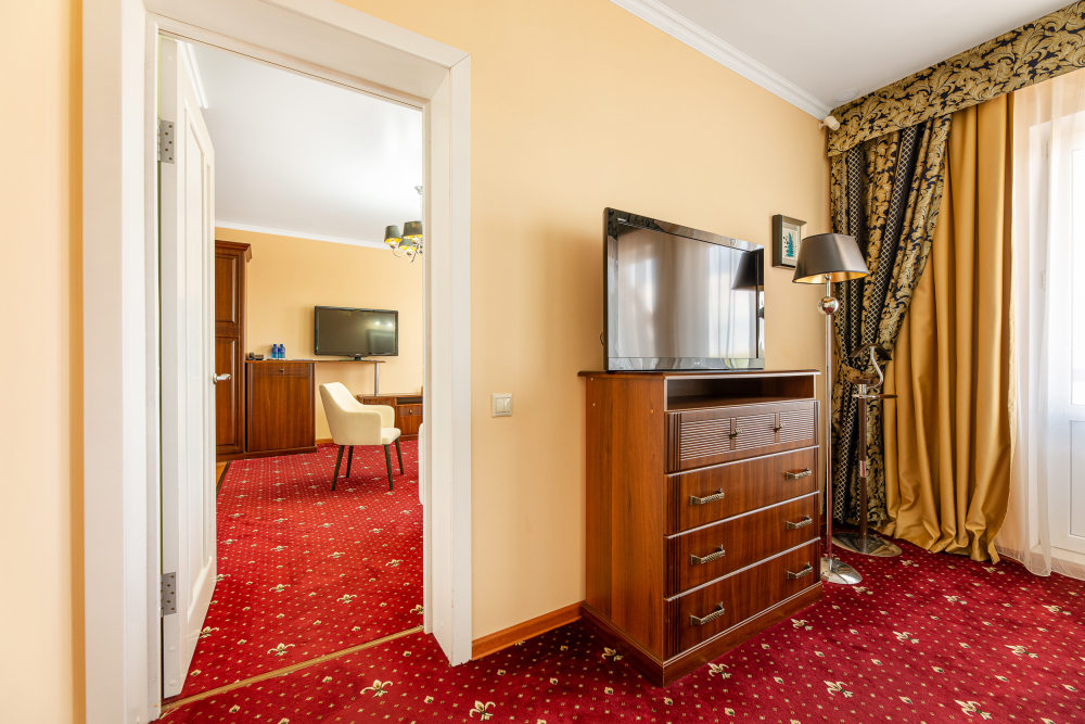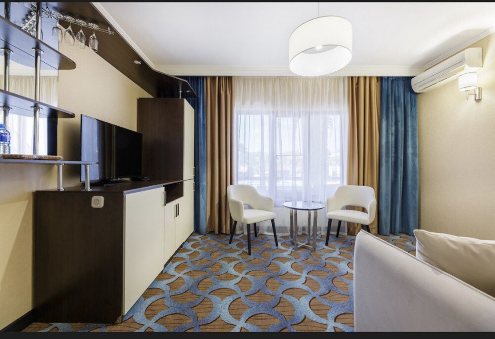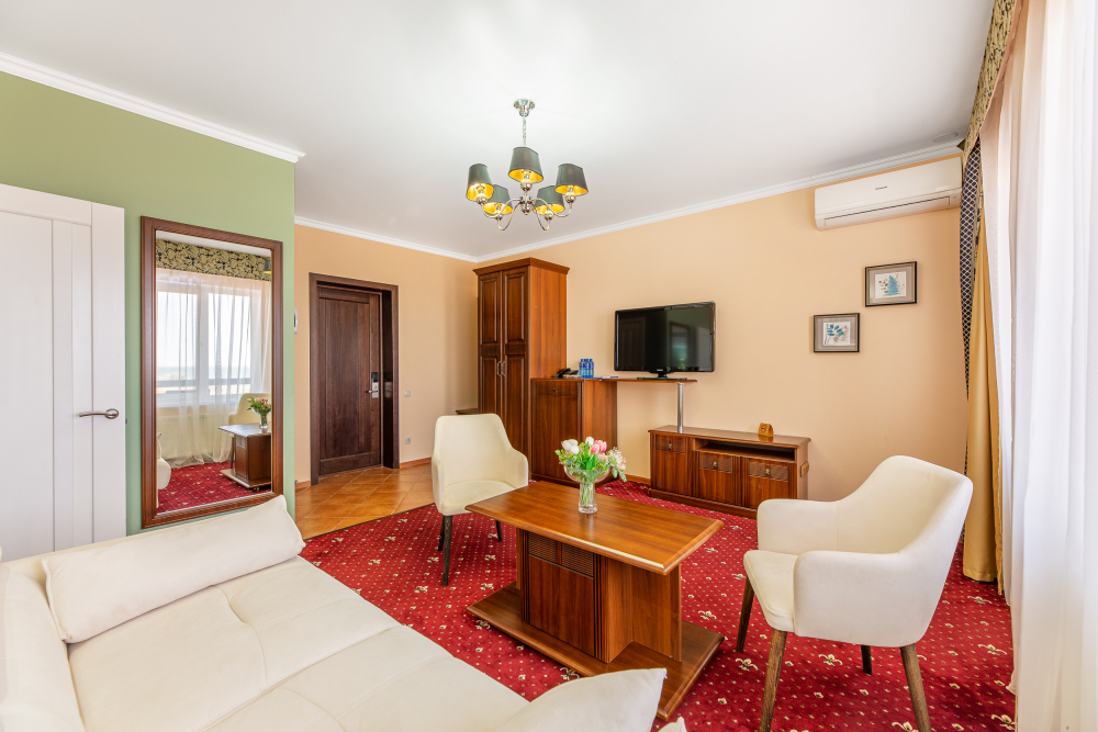 В номере: кровать «King Size» (220х200), диван(160х200), кресло, стол, журнальный столик, комод, косметический столик, стул, мини - холодильник, телевизор (2), сейф, телефон, сплит-система (2), шкаф, чайник, набор, посуды.