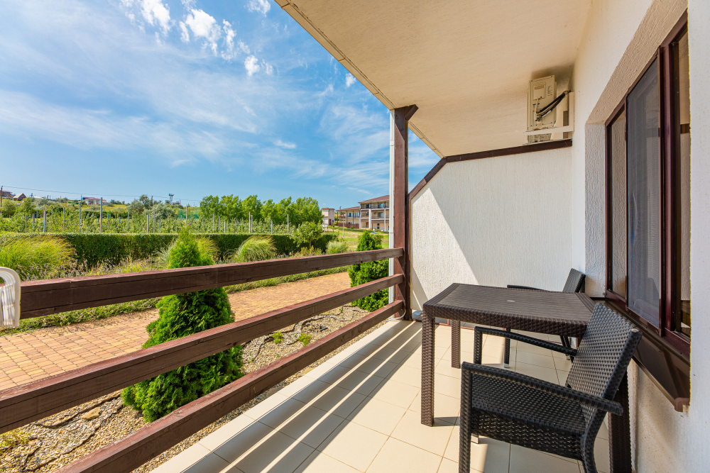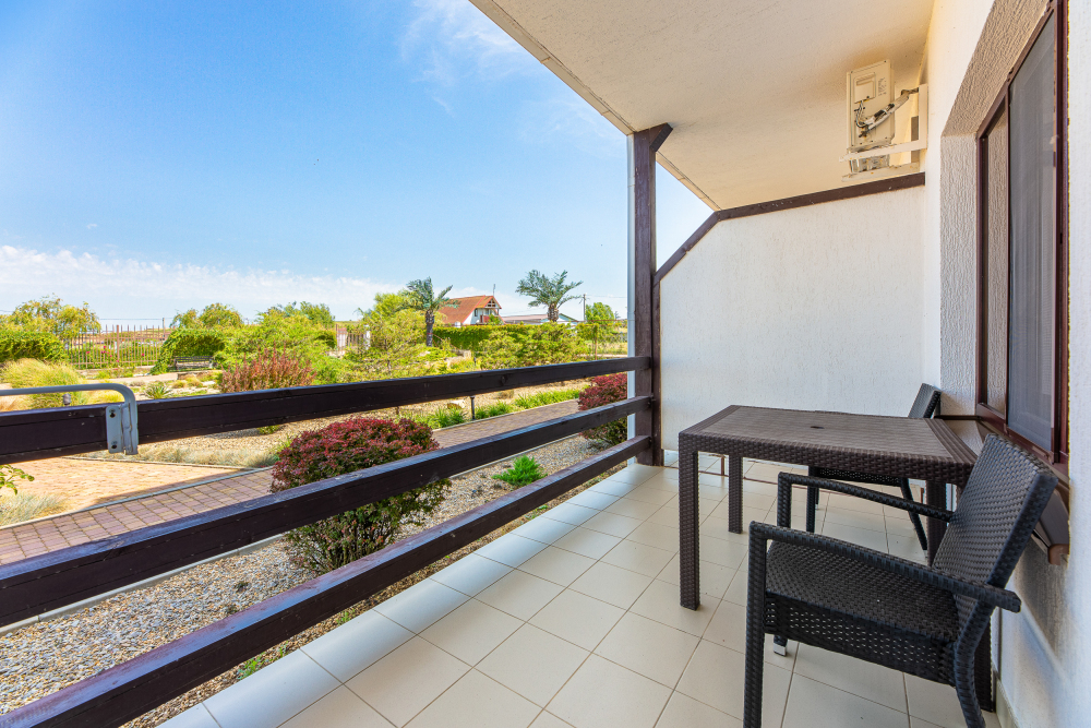 В номере: двуспальная кровать «King Size» (200х200), односпальный диван (140х200), журнальный стол, косметический столик, шкаф, мини-холодильник, жк-телевизор, сейф, сплит-система, телефон, чайник. На балконе: мебель из искусственного ротанга, сушилка для белья.