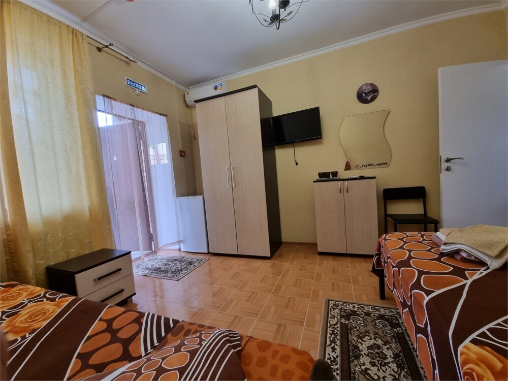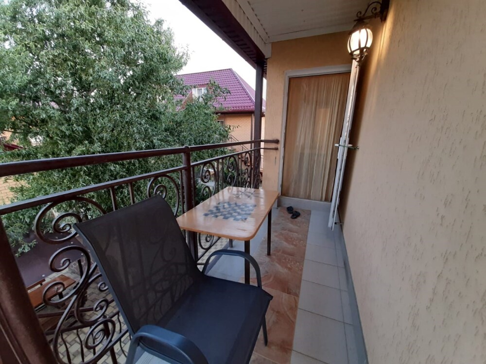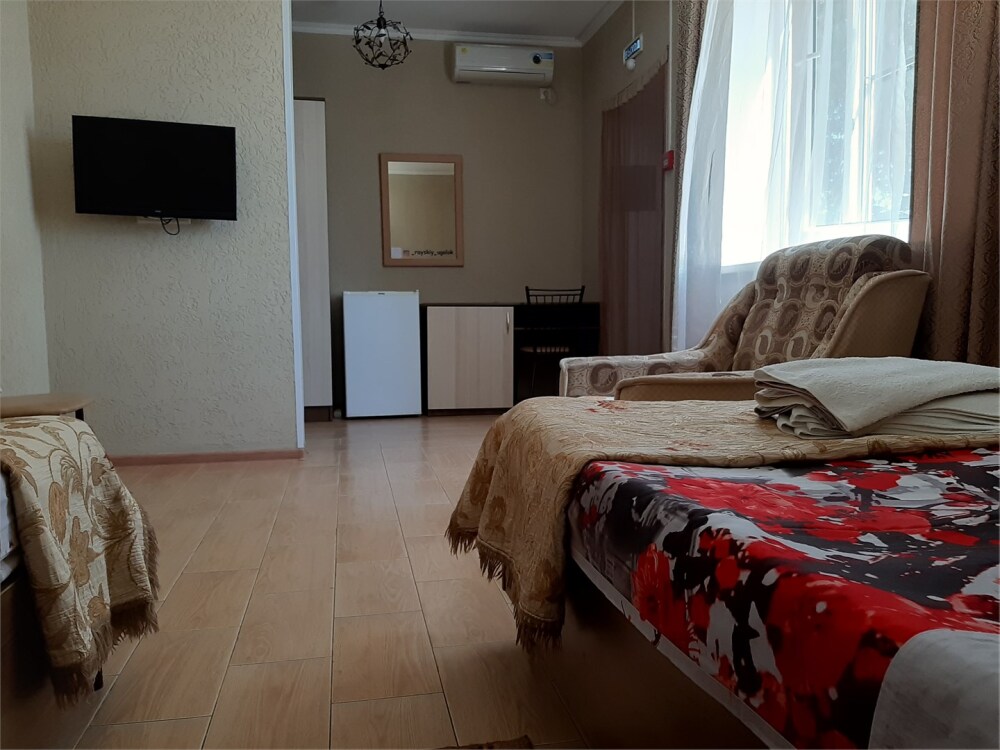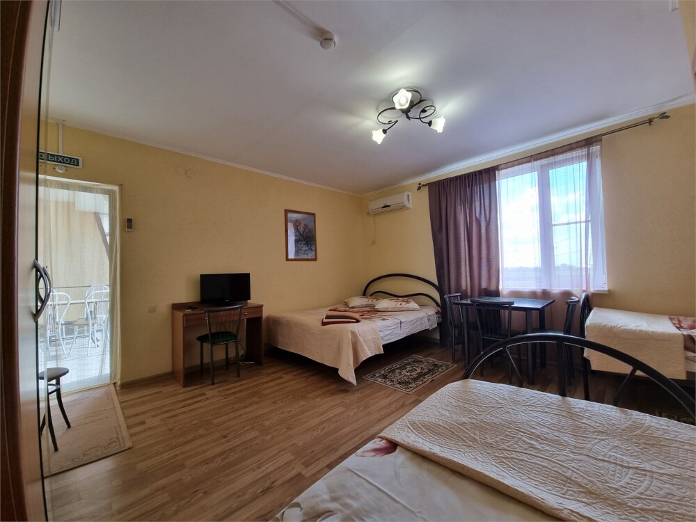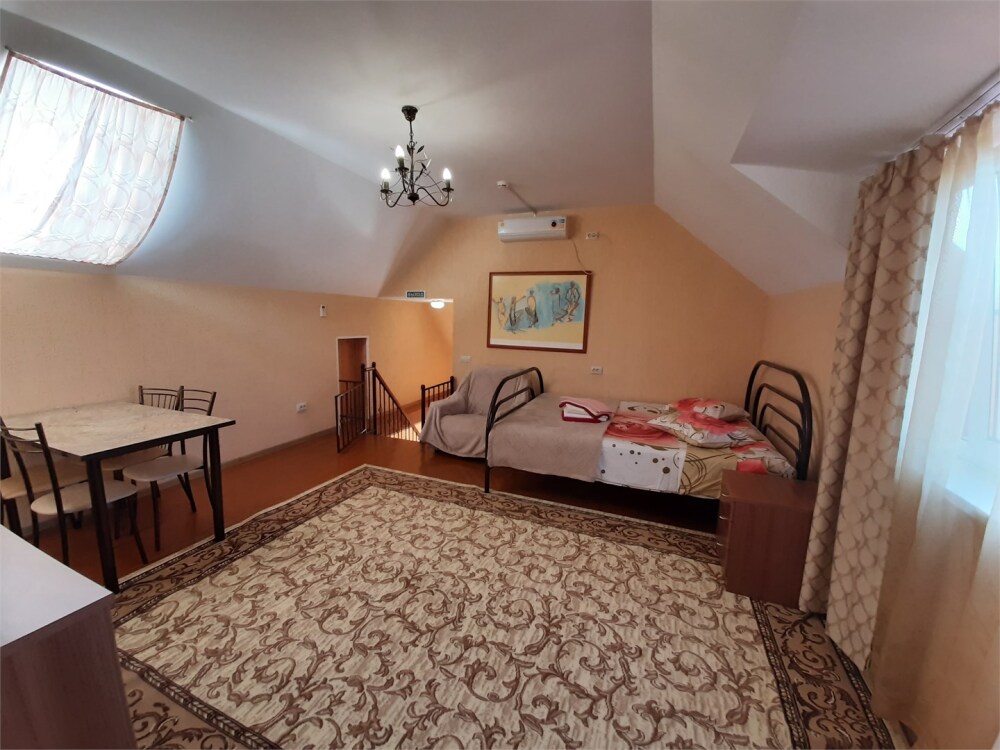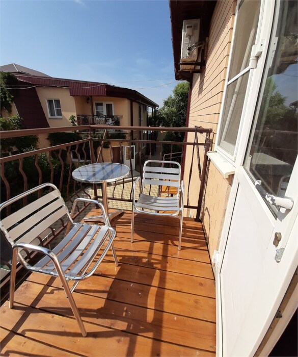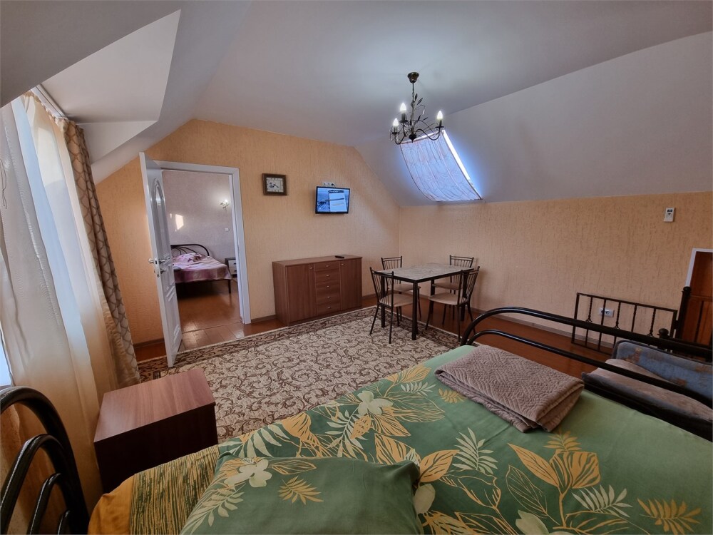 Большой двухкомнатный двухэтажный номер, балкон, сушилка, хол., TV, сплит система, с/у с душем, две двуспальные кровати, одна односпальная кровать, мебель, обеденный стол. Вид на море.