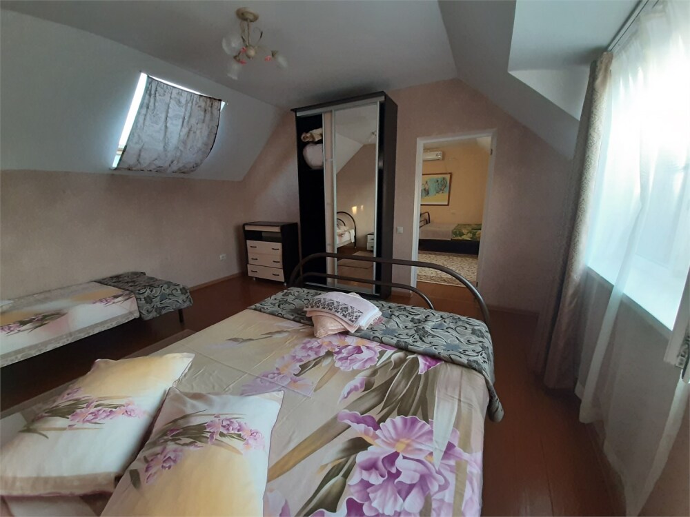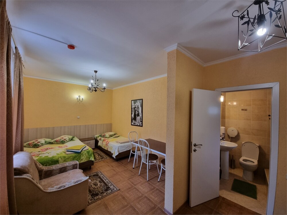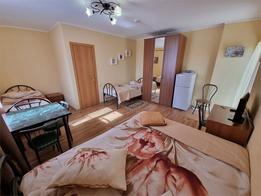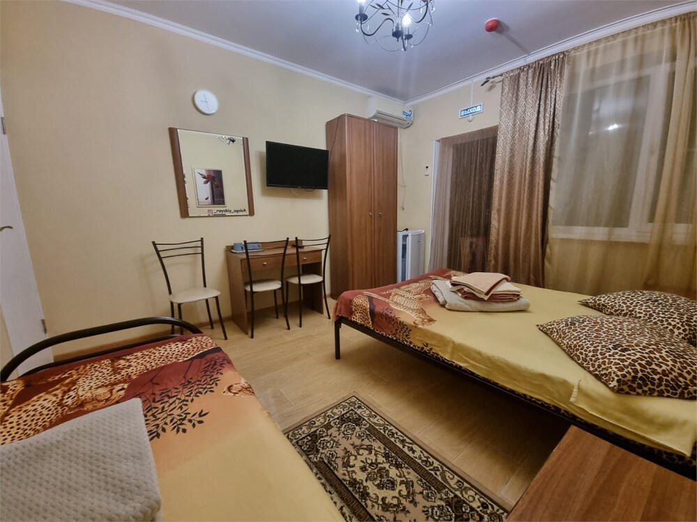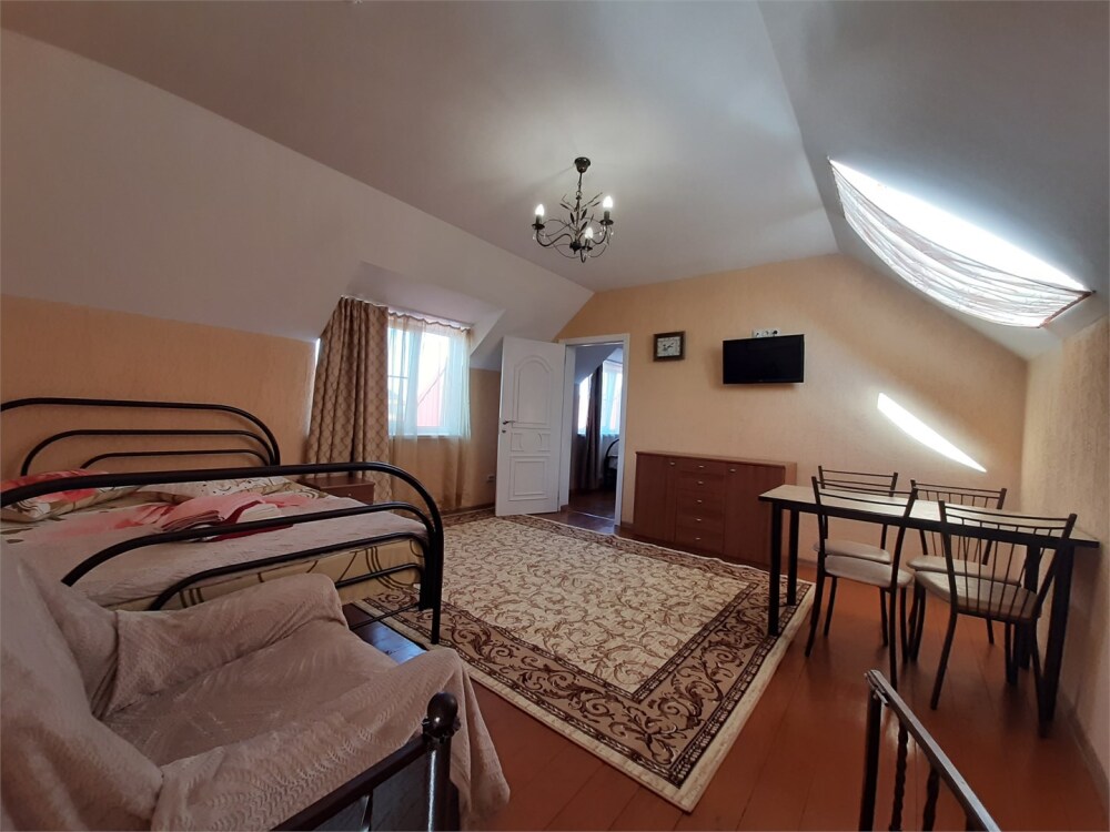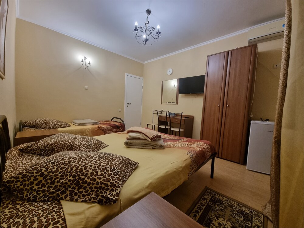 Большой двухкомнатный двухэтажный номер, балкон, сушилка, хол., TV, сплит система, с/у с душем, две двуспальные кровати, одна односпальная кровать, мебель, обеденный стол. Вид на море.