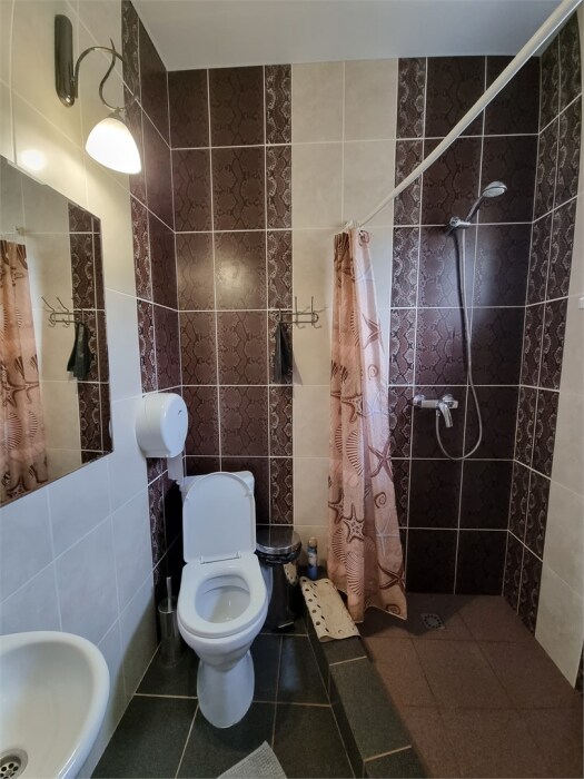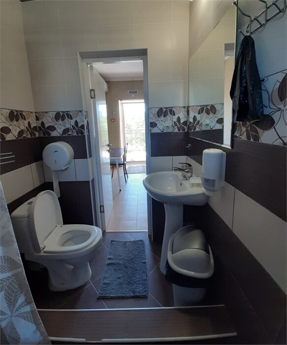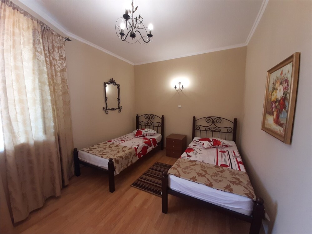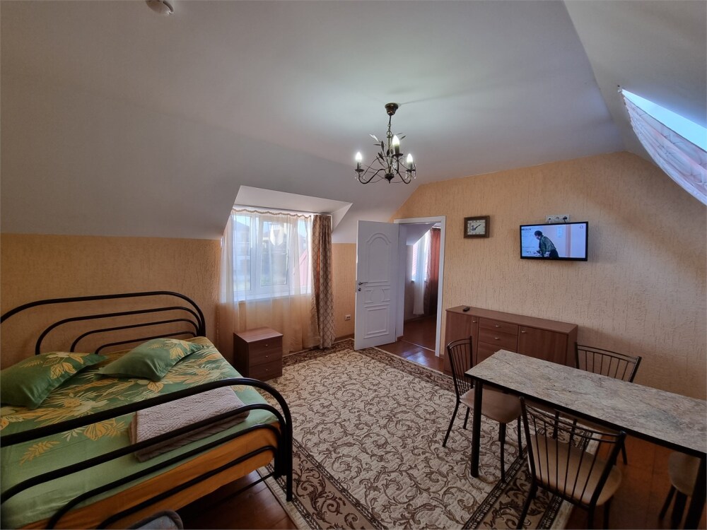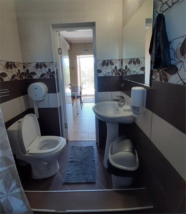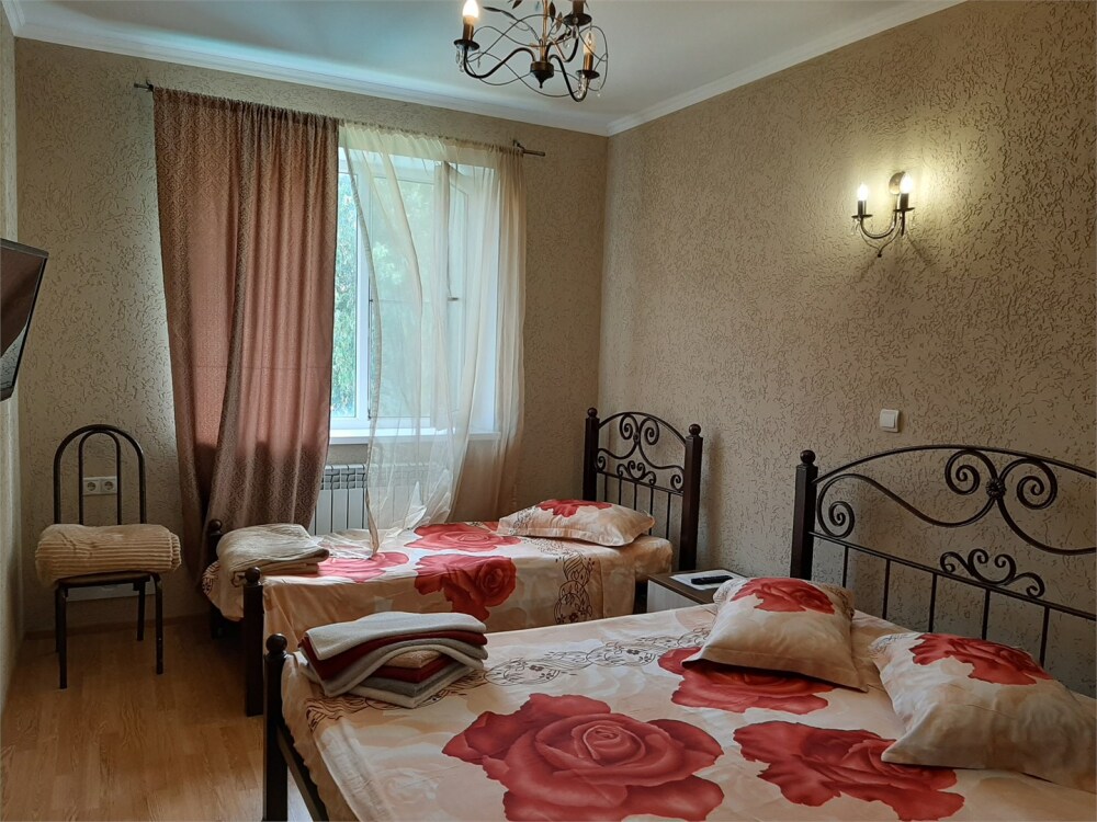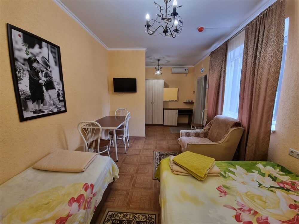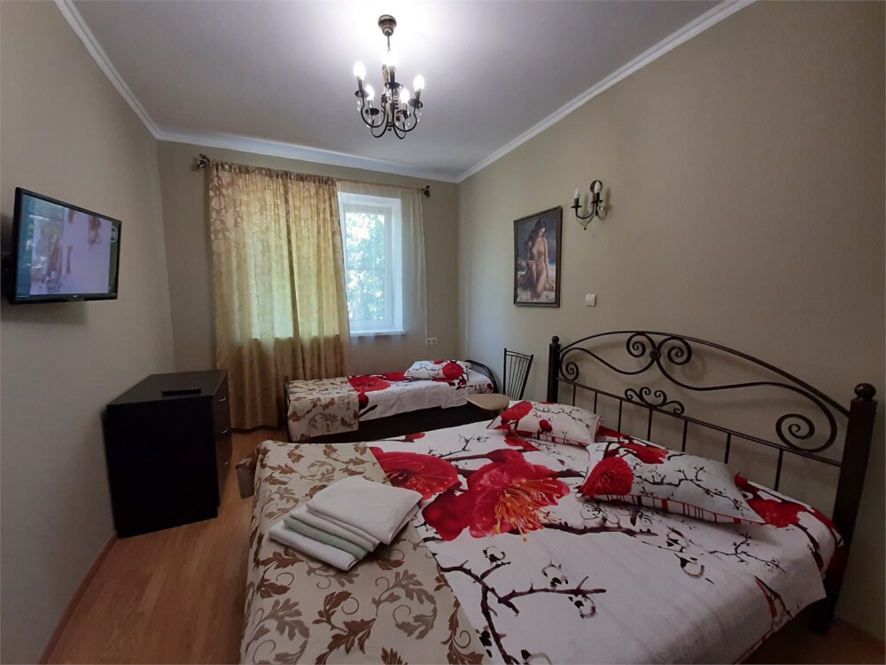 Большой двухкомнатный двухэтажный номер, балкон, сушилка, хол., TV, сплит система, с/у с душем, две двуспальные кровати, одна односпальная кровать, мебель, обеденный стол. Вид на море.