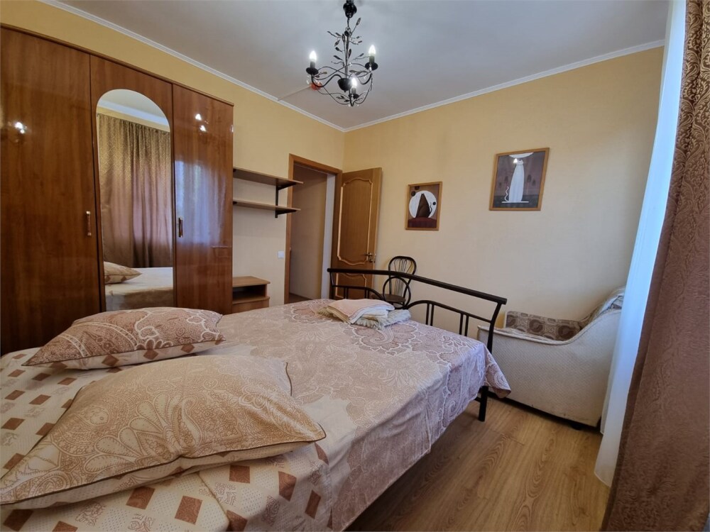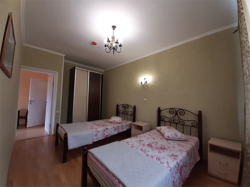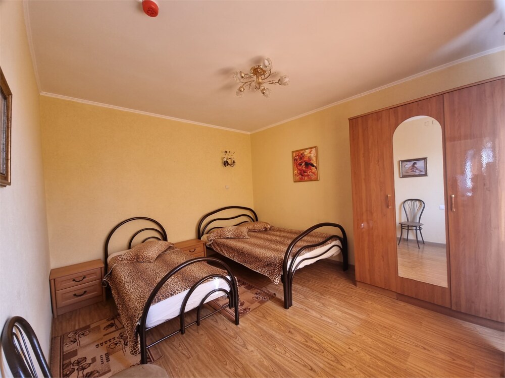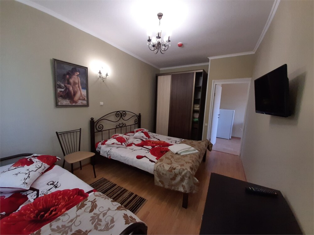 Номер с двумя раздельными комнатами, две двуспальные и односпальная кровати или одна двуспальная и 3 односпальные кровати, хол., TV, с/у с душем, шкаф-купе, мебель, большой балкон с мебелью, сушилка для белья, слит система.
