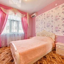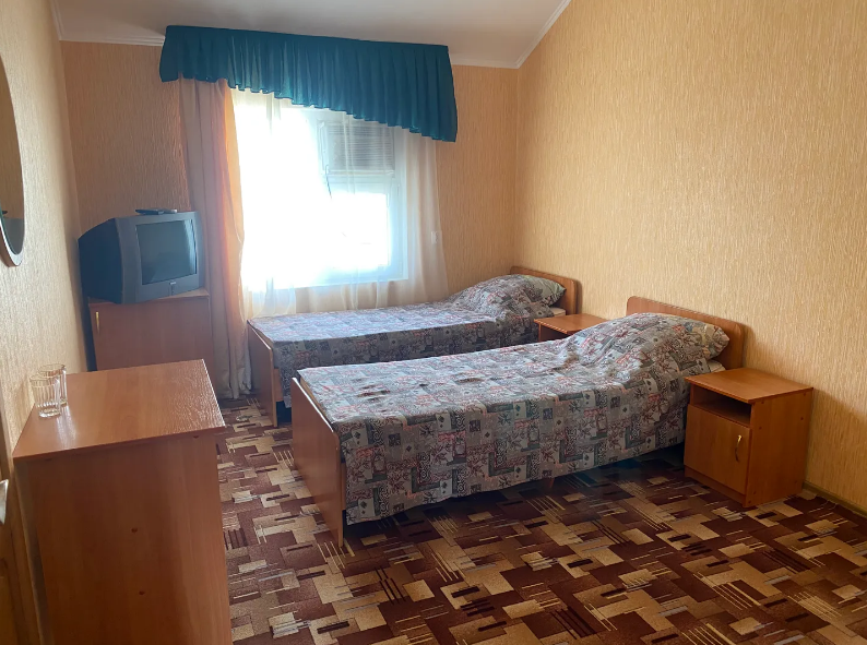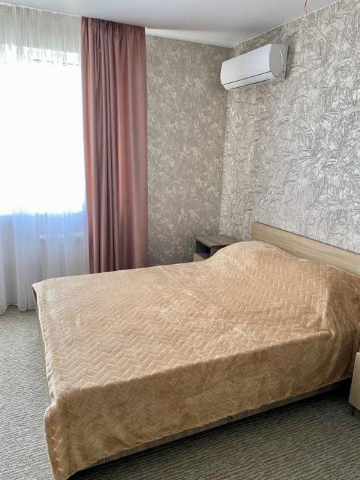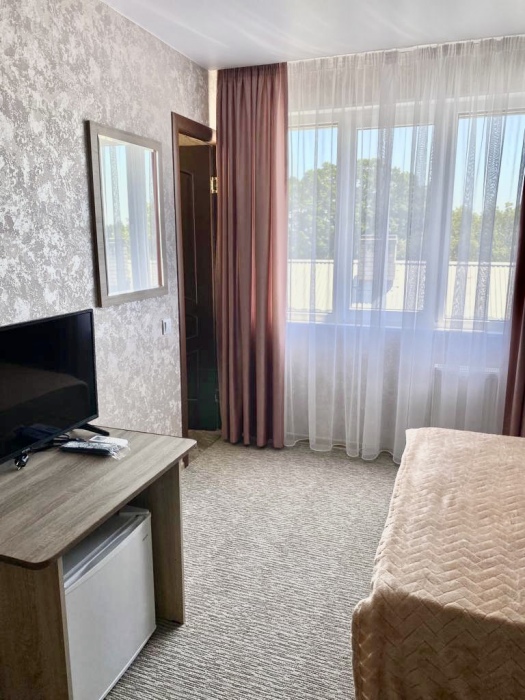 В номере одна двуспальная или две односпальные кровати. Тумбочки, шкаф, стол, ТВ, холодильник, кондиционер, санузел.