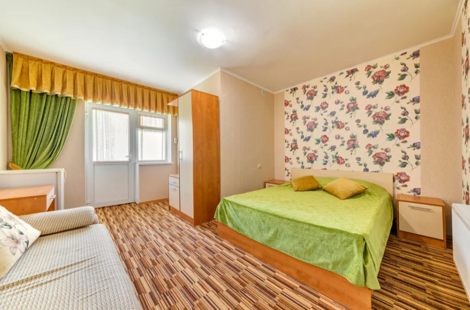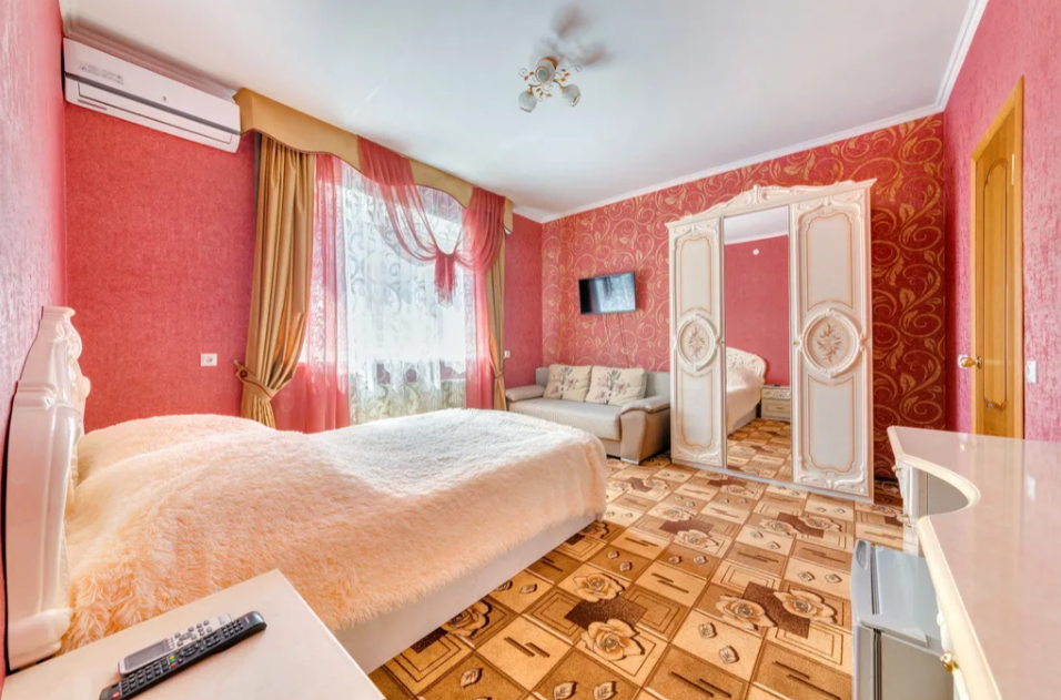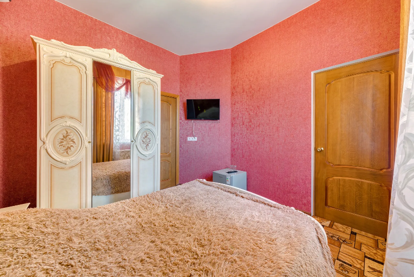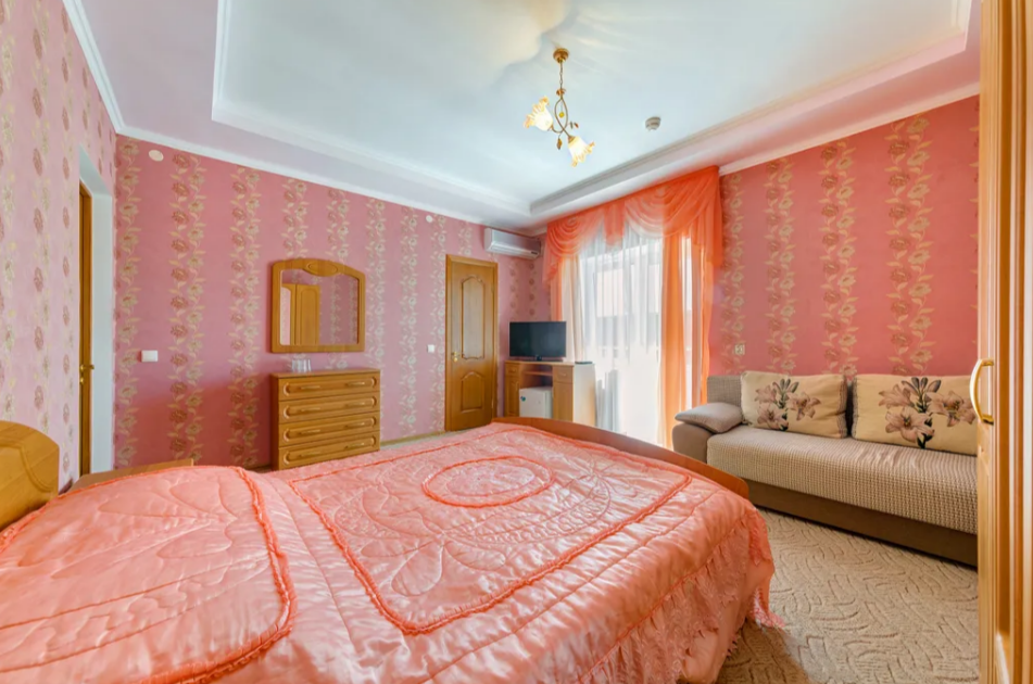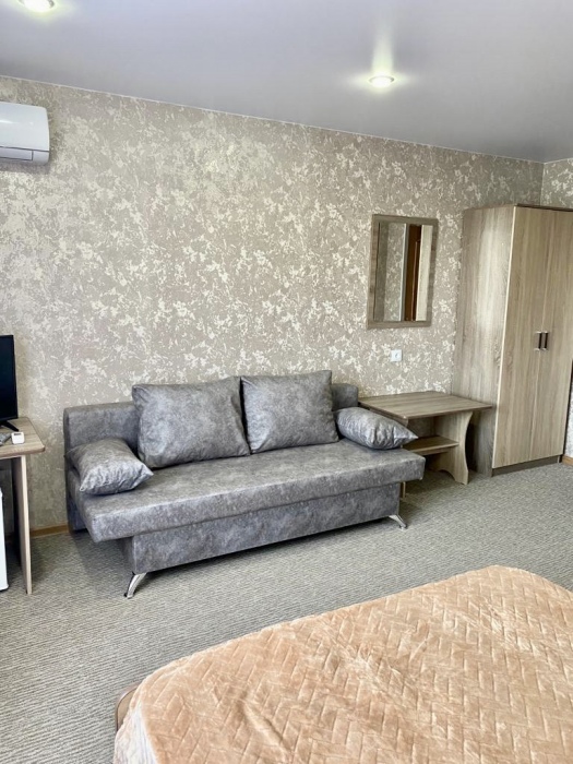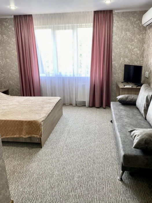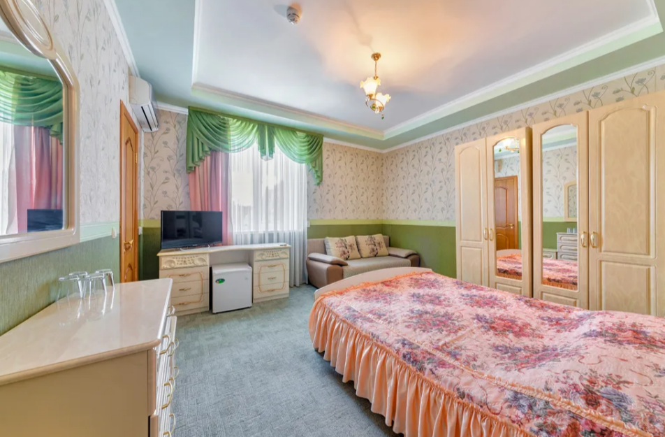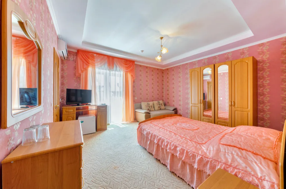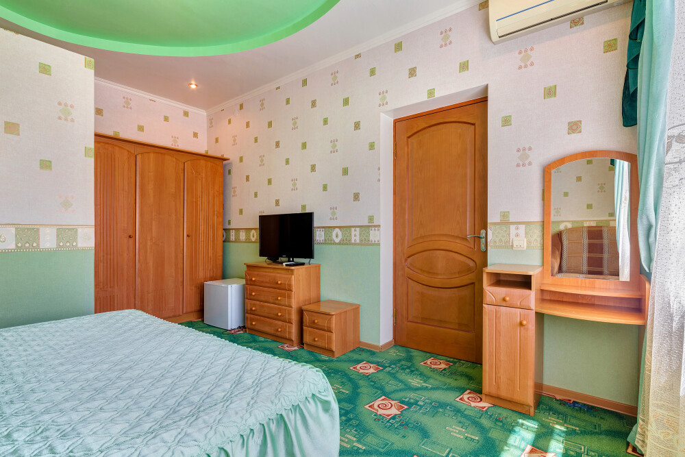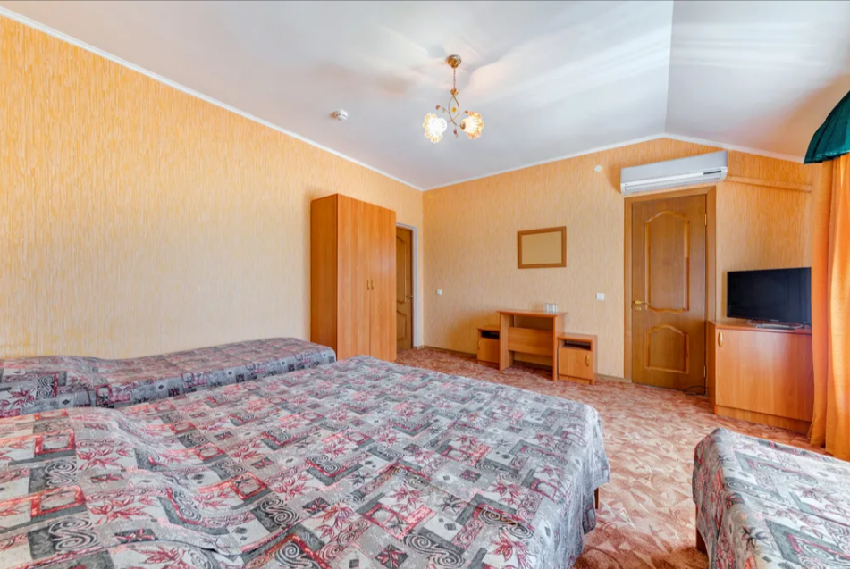 В номере двуспальная кровать, двуспальный раскладной диван 160*200 см, шкаф, прикроватные тумбочки, комод, ТВ, холодильник, сплит-система, сан узел. Некоторые номера с балконом.