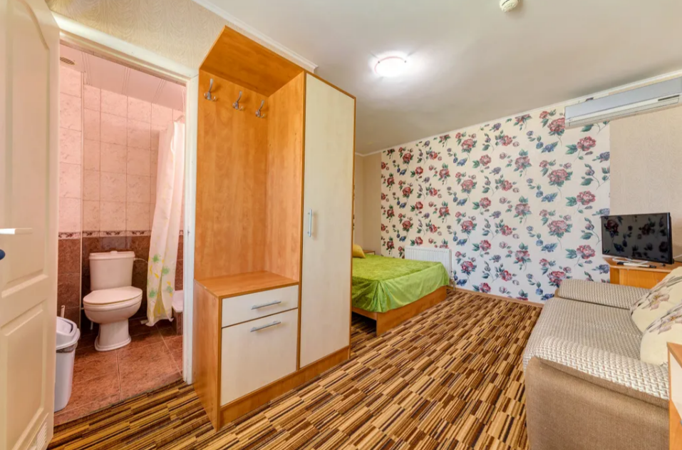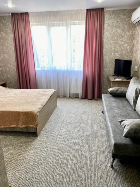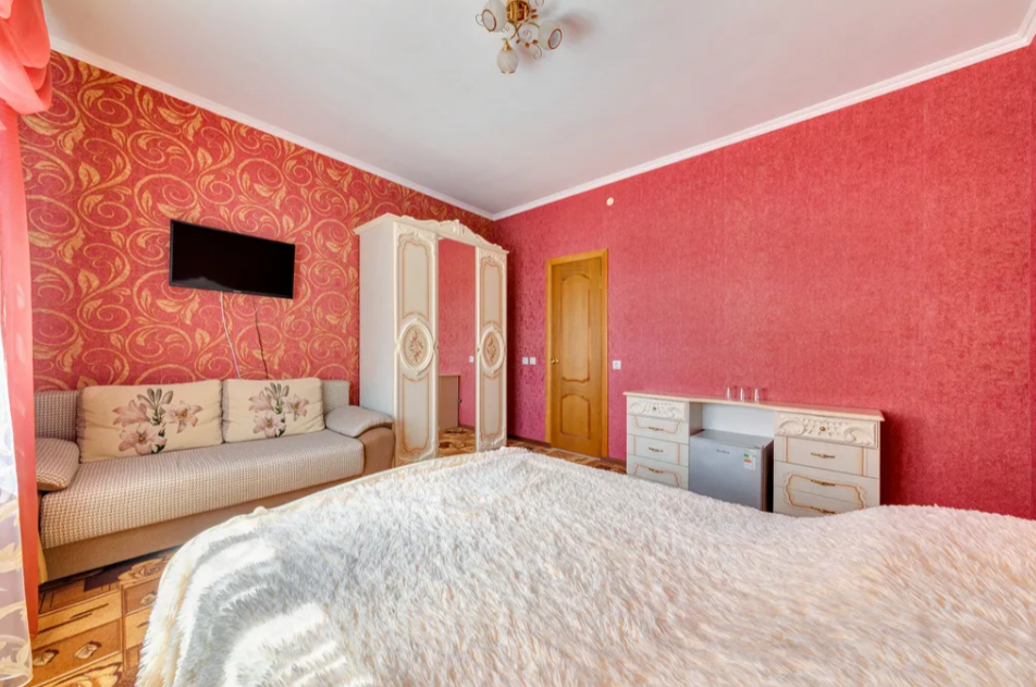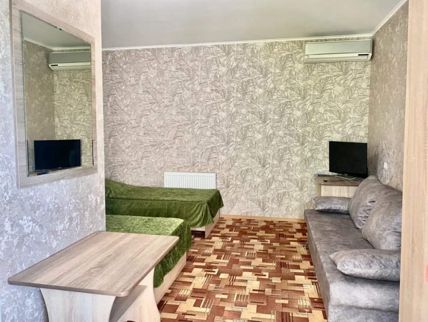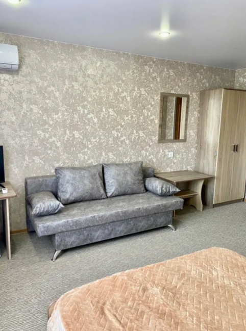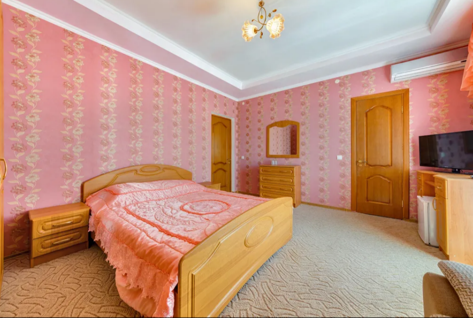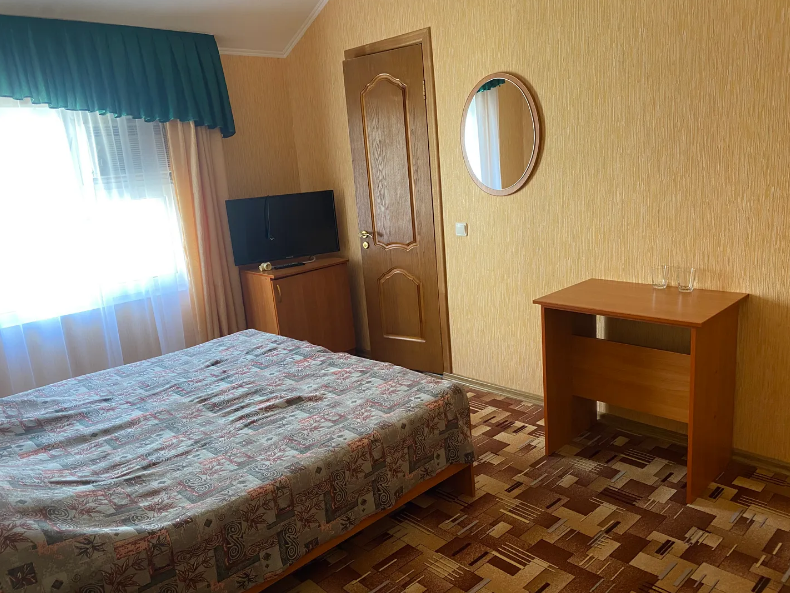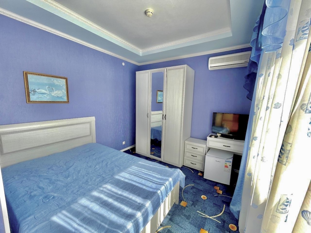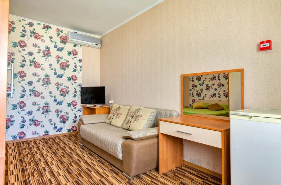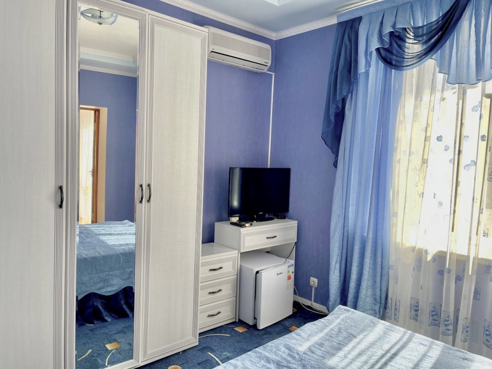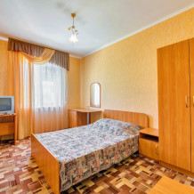 В номере двуспальная кровать, двуспальный раскладной диван 160*200 см, шкаф, прикроватные тумбочки, комод, ТВ, холодильник, сплит-система, сан узел. Некоторые номера с балконом.