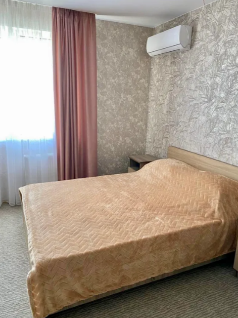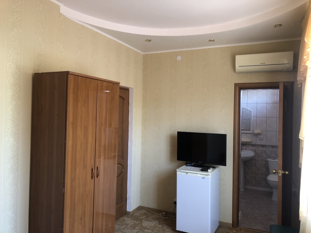 В номере одна двуспальная кровать. Тумбочки, шкаф, ТВ, холодильник, кондиционер, санузел.