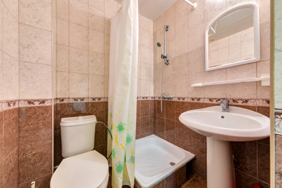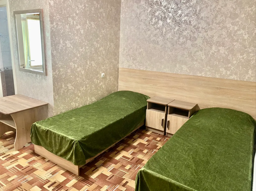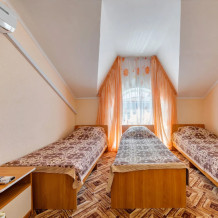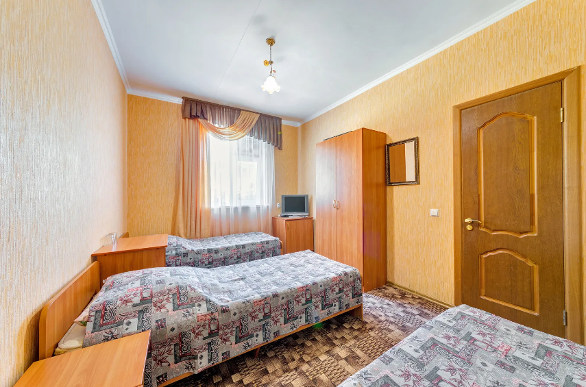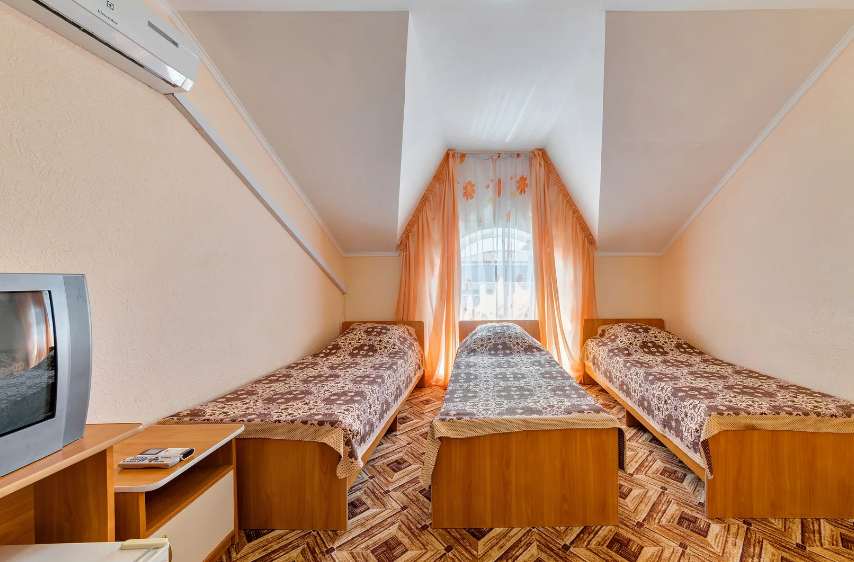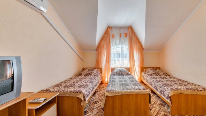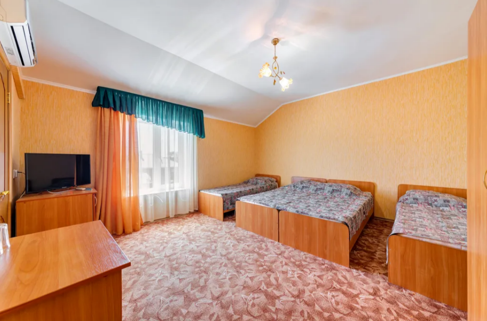 В номере три односпальные кровати, можно сдвинуть. Тумбочки, шкаф, стол, ТВ, холодильник, кондиционер, санузел.