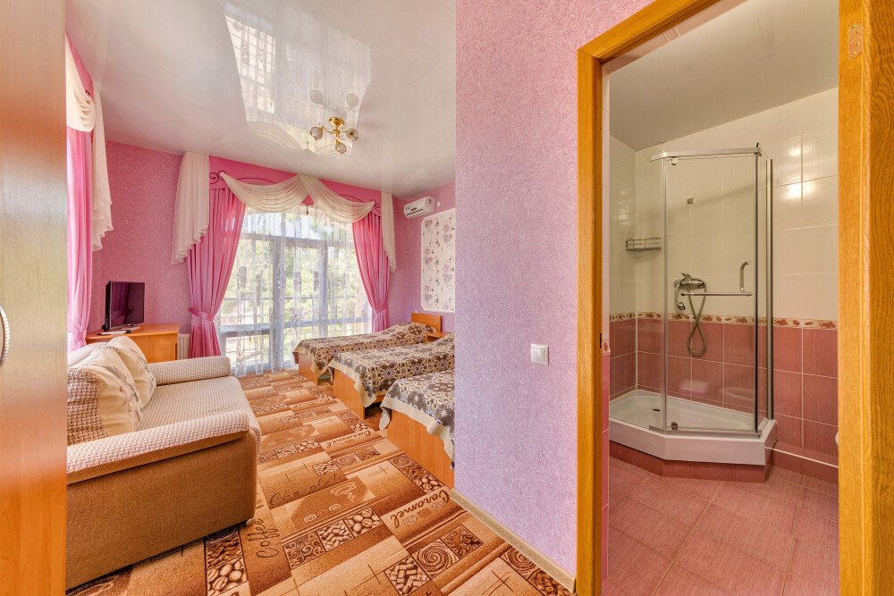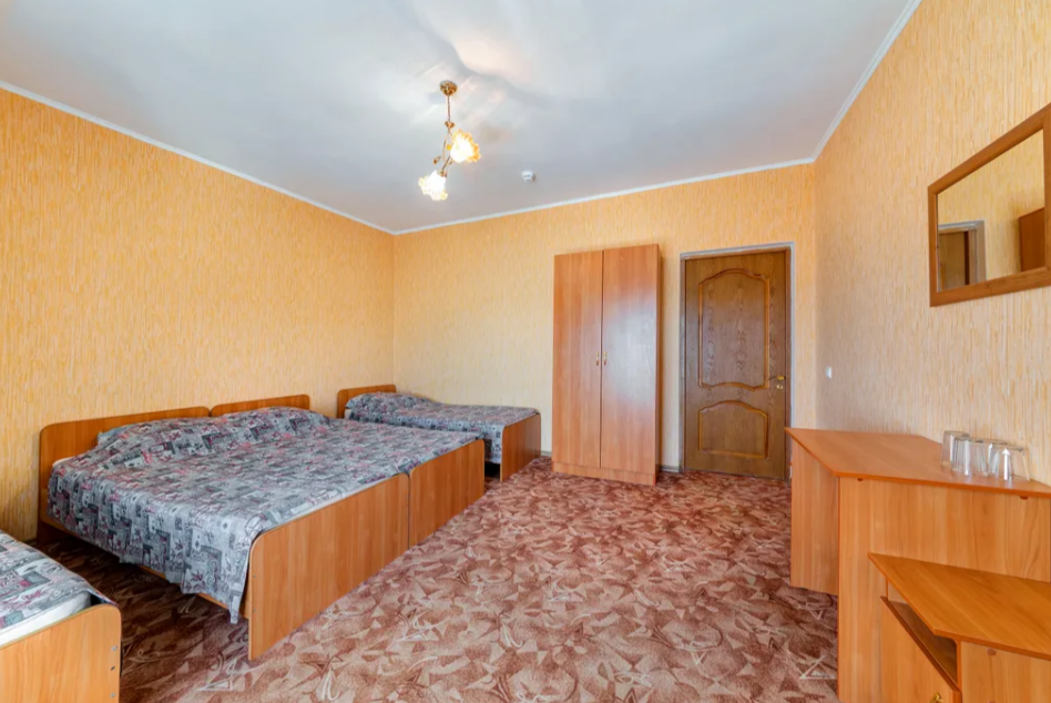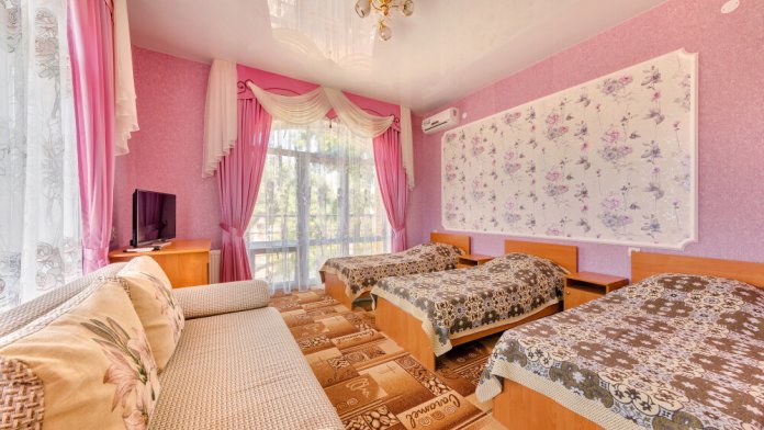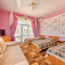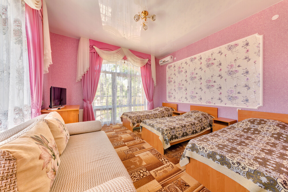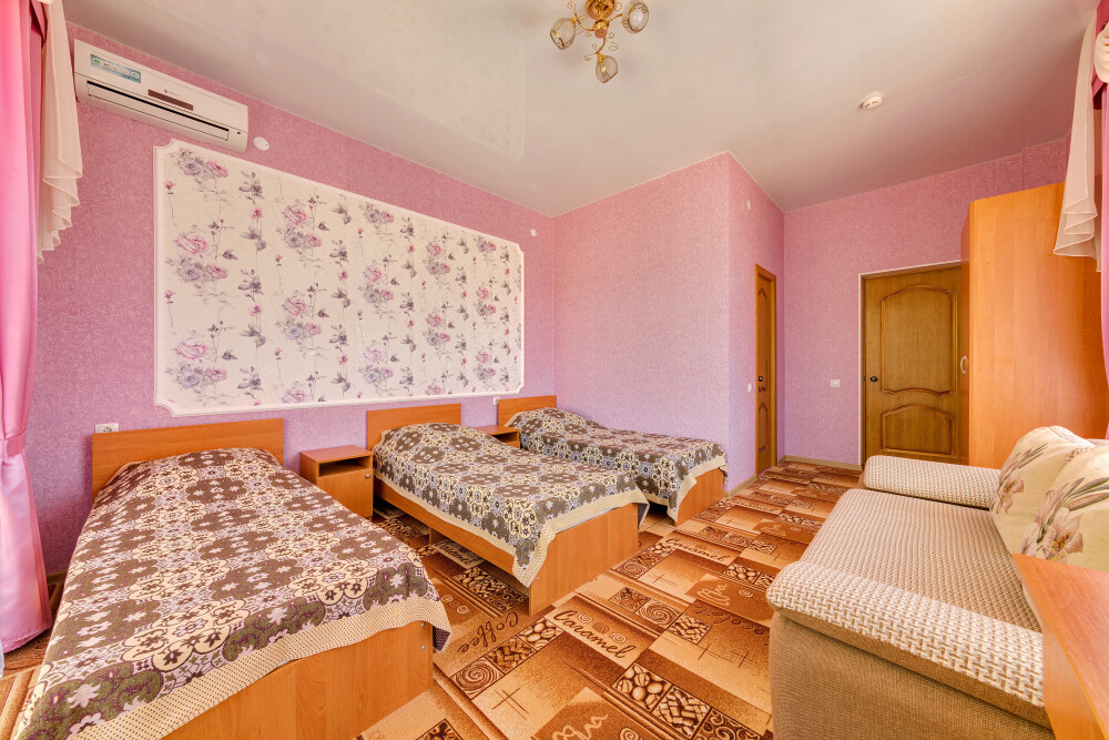 Номер для размещения 5 человек. Комплектация: три односпальные кровати+двуспальный диван 160*200 см; либо двуспальная кровать+односпальная кровать+двуспальный диван 160*200 см. Каждый номер оснащен тумбочками, шкафом, столиком, ТВ, холодильником, сплит-системой и санузлом.