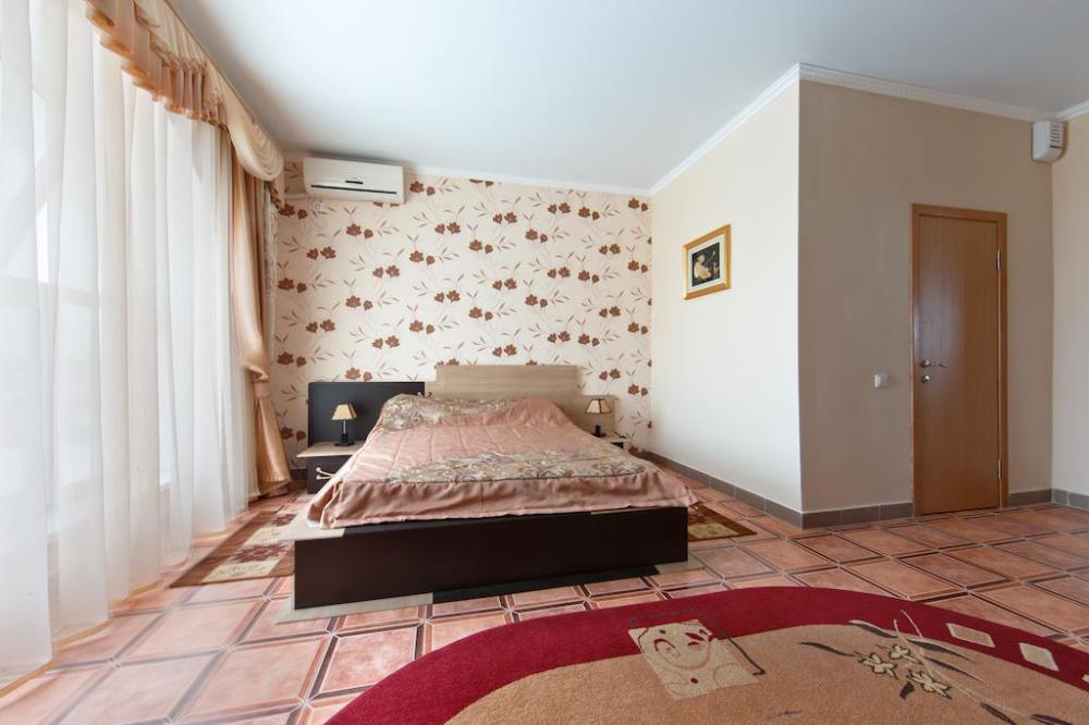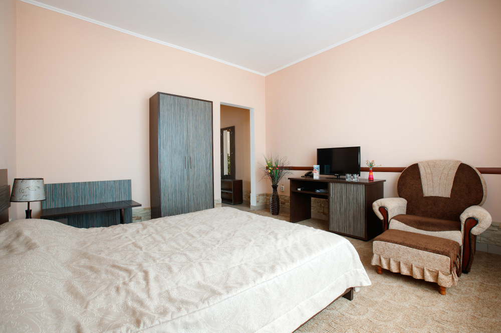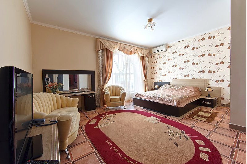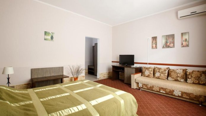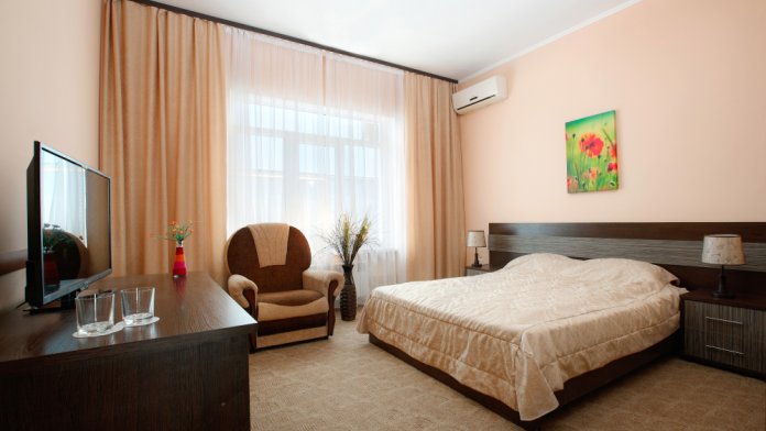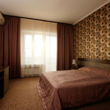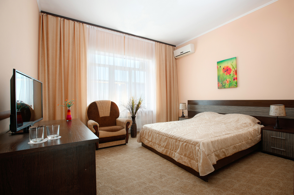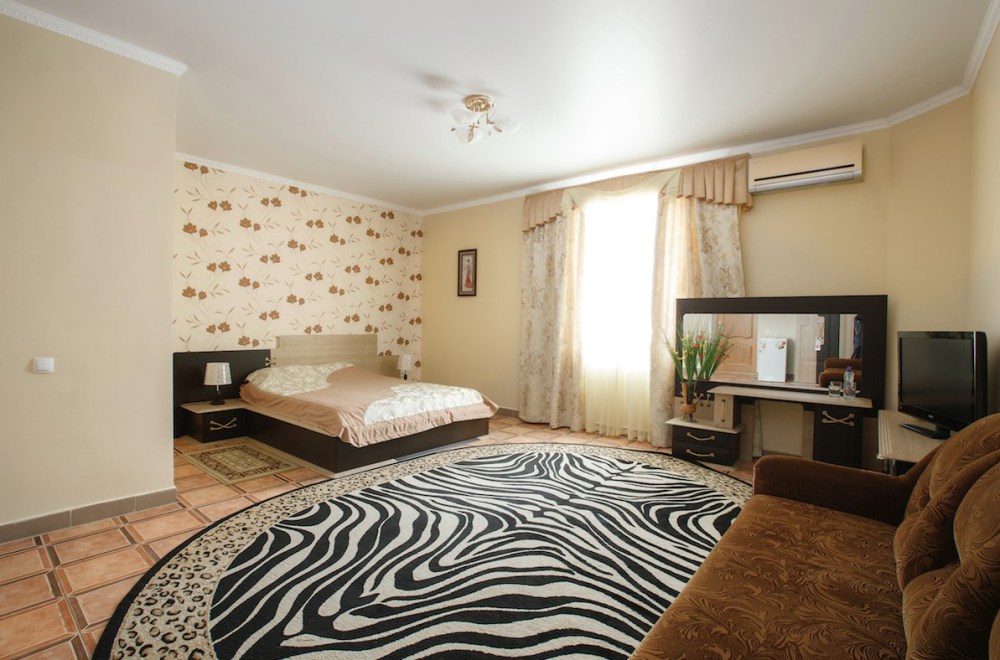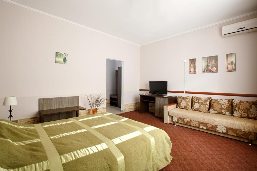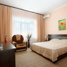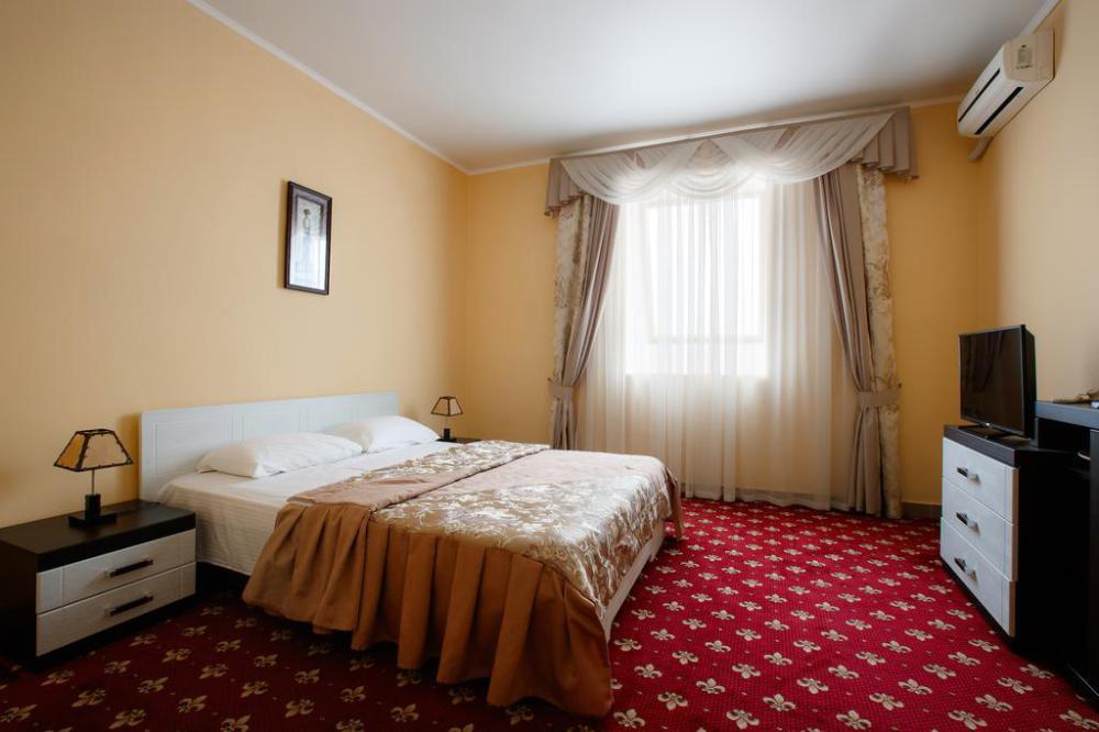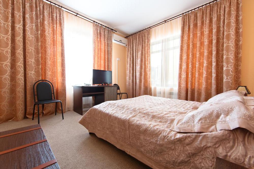 Просторный однокомнатный номер с широкой двуспальной кроватью общей площадью 34 м2 оборудован телевизором, сплит-системой, интернетом (WI-FI), мини-холодильником, шкафом, телефоном, трюмо.