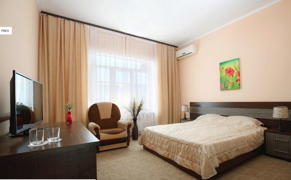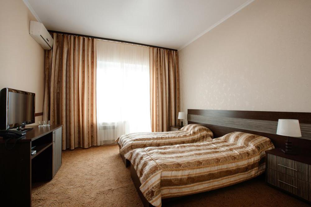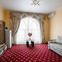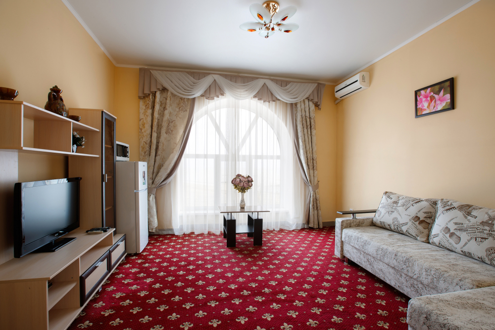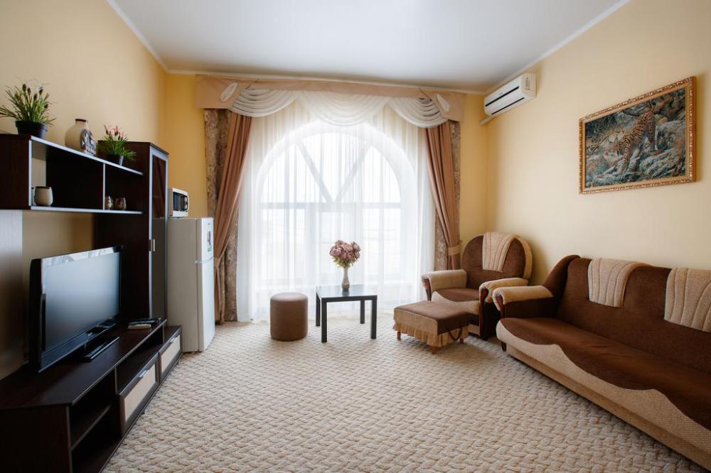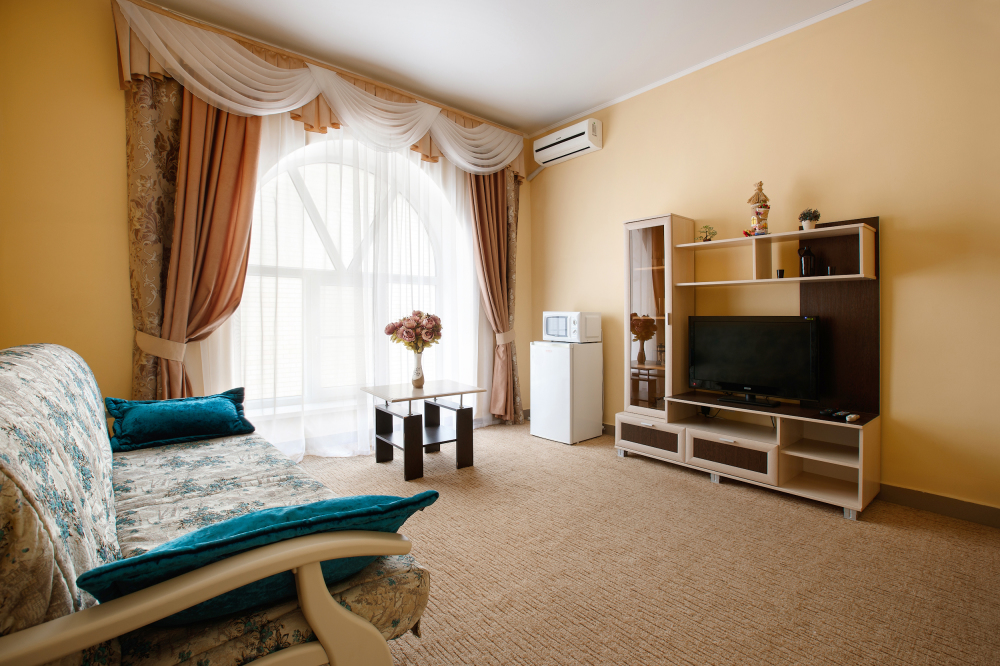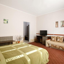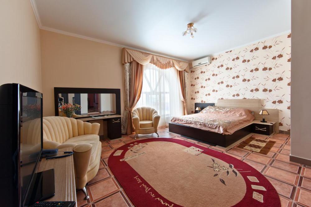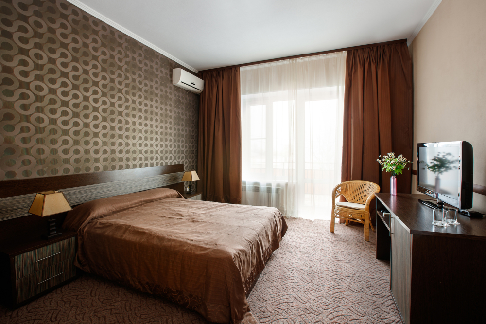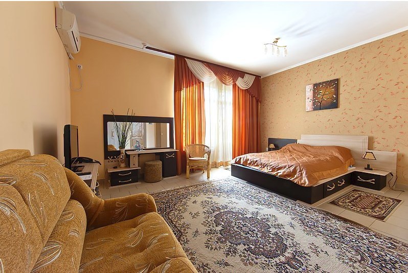 Просторный однокомнатный номер с широкой двуспальной кроватью общей площадью 34 м2 оборудован телевизором, сплит-системой, интернетом (WI-FI), мини-холодильником, шкафом, телефоном, трюмо.