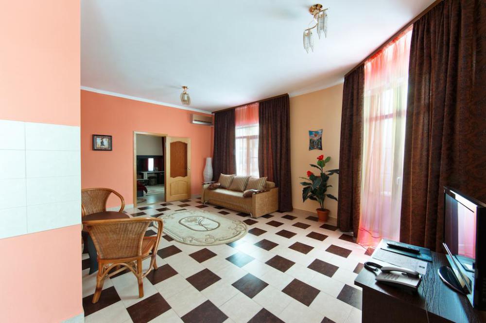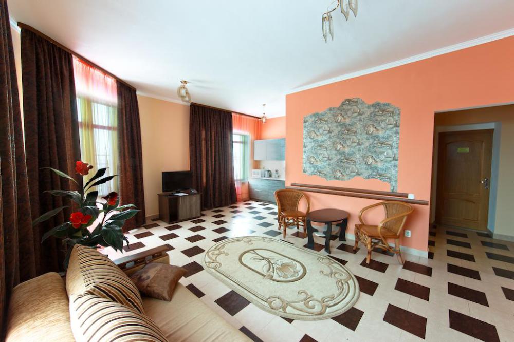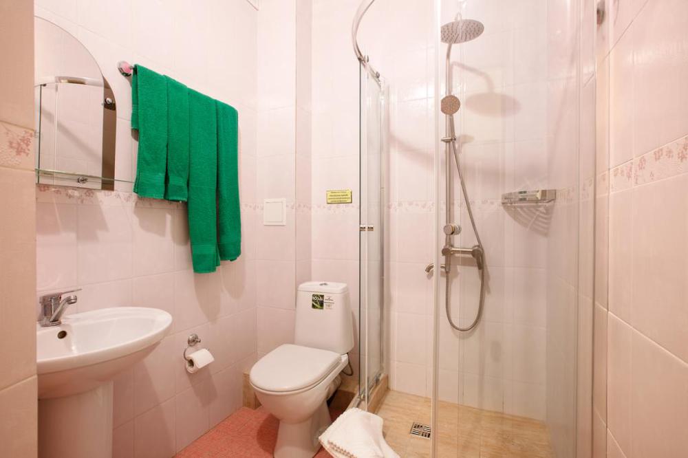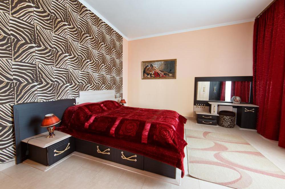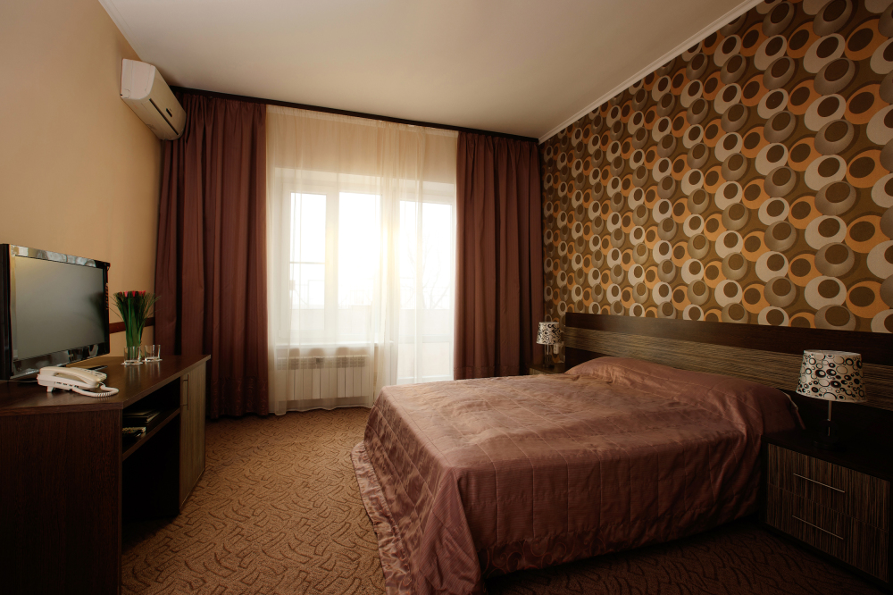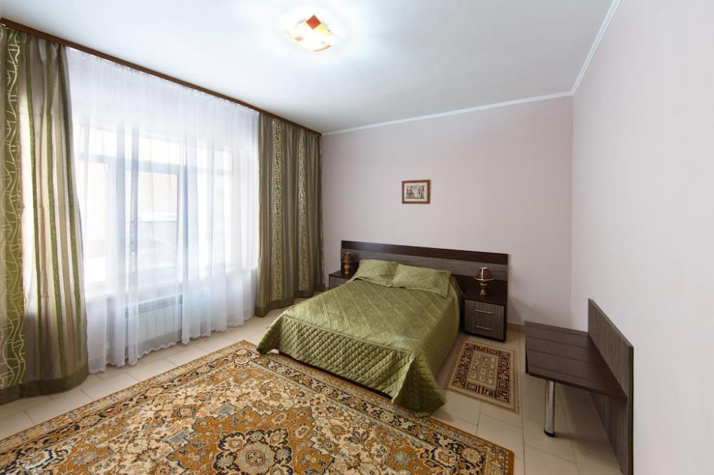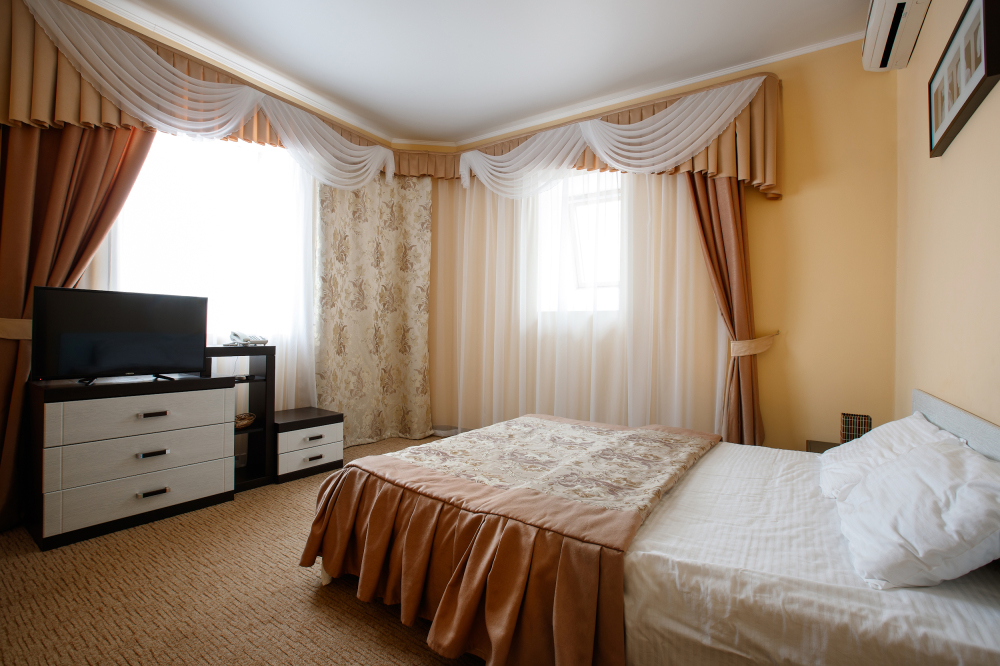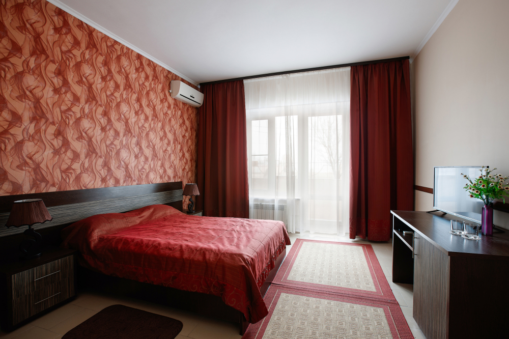 Просторный однокомнатный номер с широкой двуспальной кроватью общей площадью 34 м2 оборудован телевизором, сплит-системой, интернетом (WI-FI), мини-холодильником, шкафом, телефоном, трюмо.