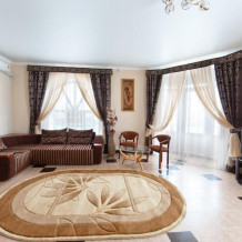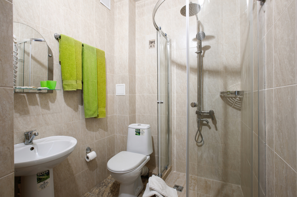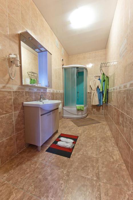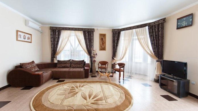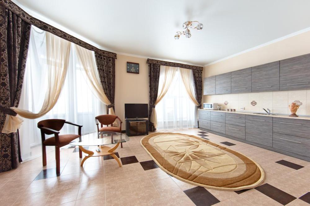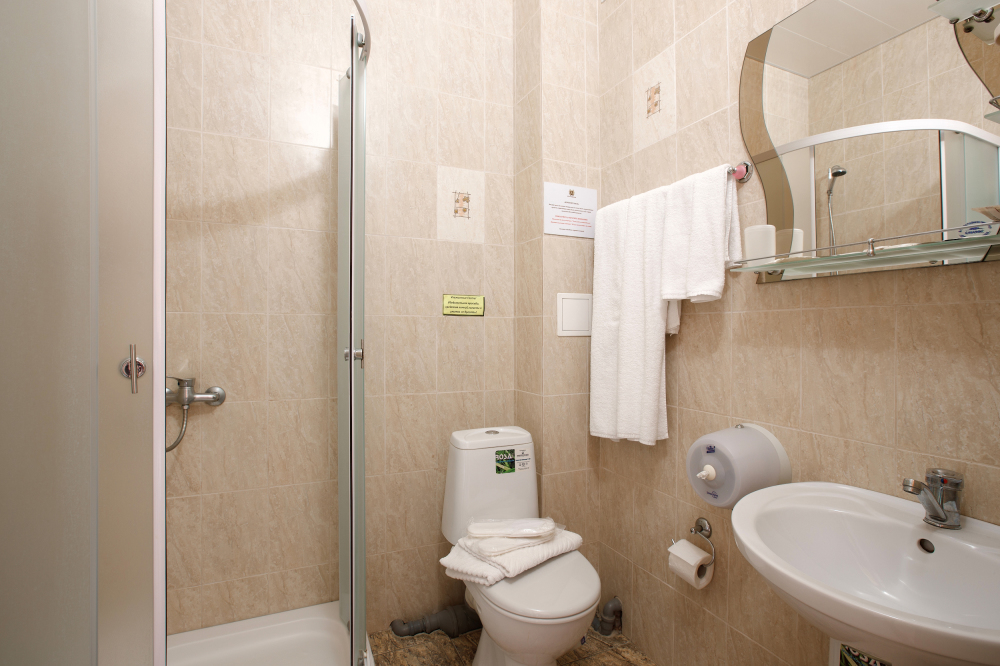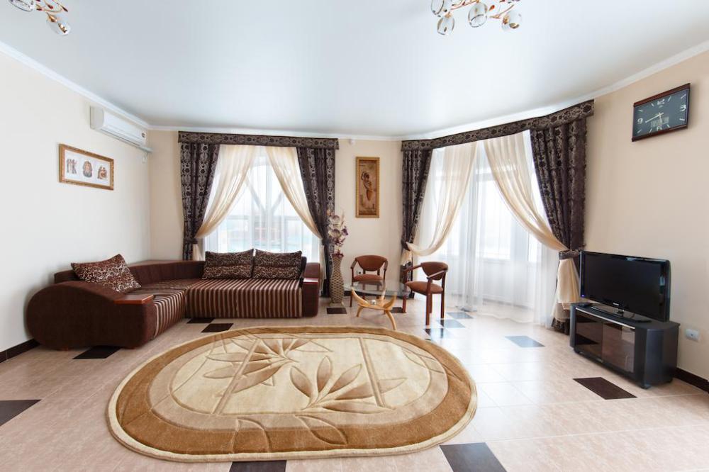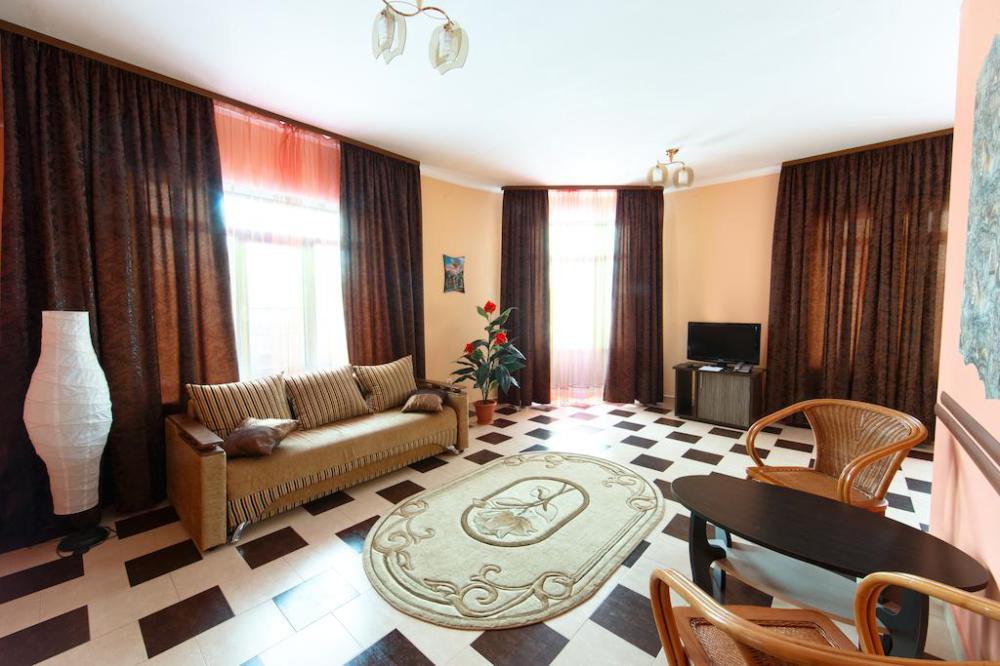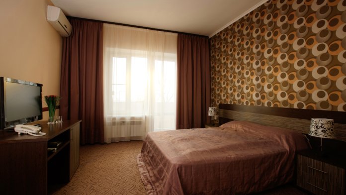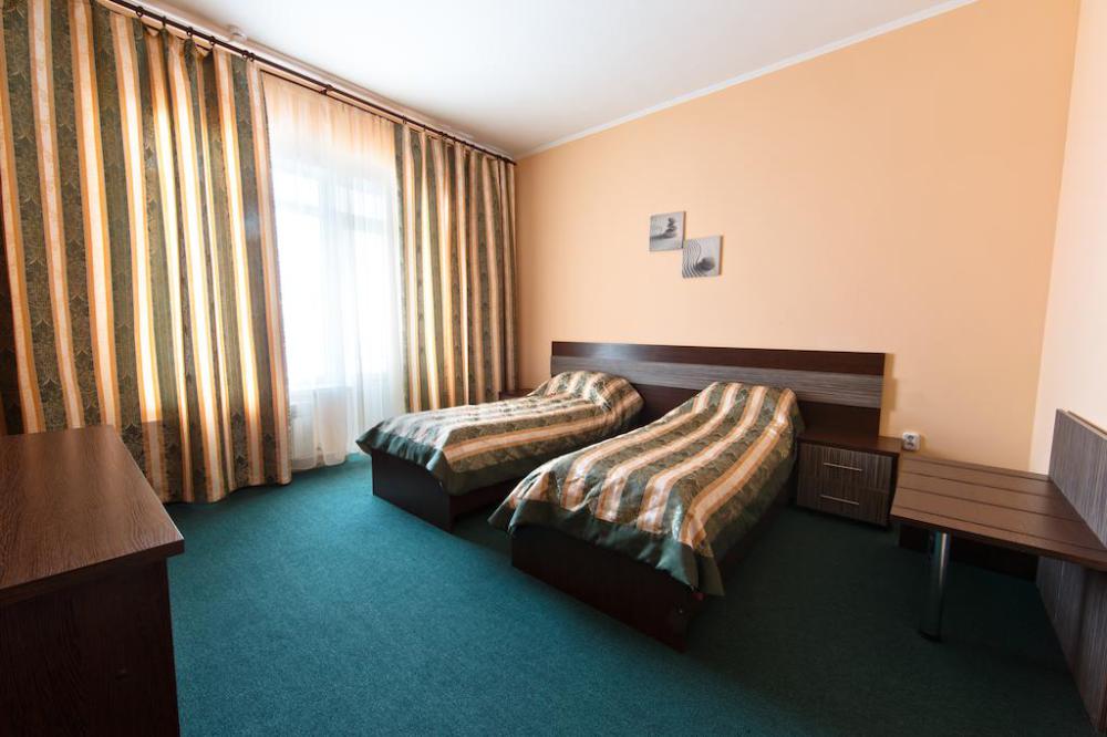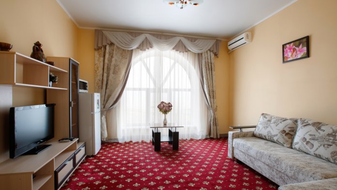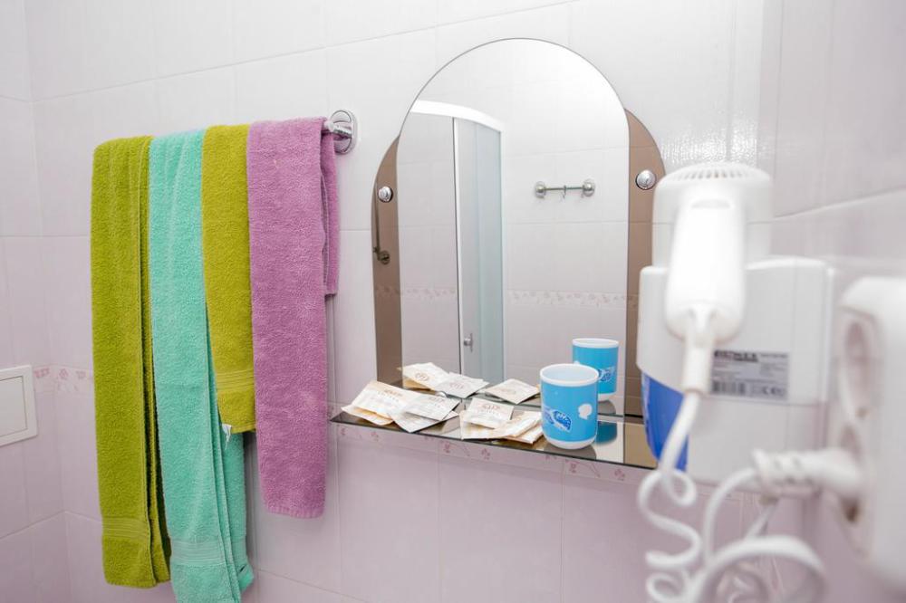 Просторный однокомнатный номер с широкой двуспальной кроватью общей площадью 34 м2 оборудован телевизором, сплит-системой, интернетом (WI-FI), мини-холодильником, шкафом, телефоном, трюмо.