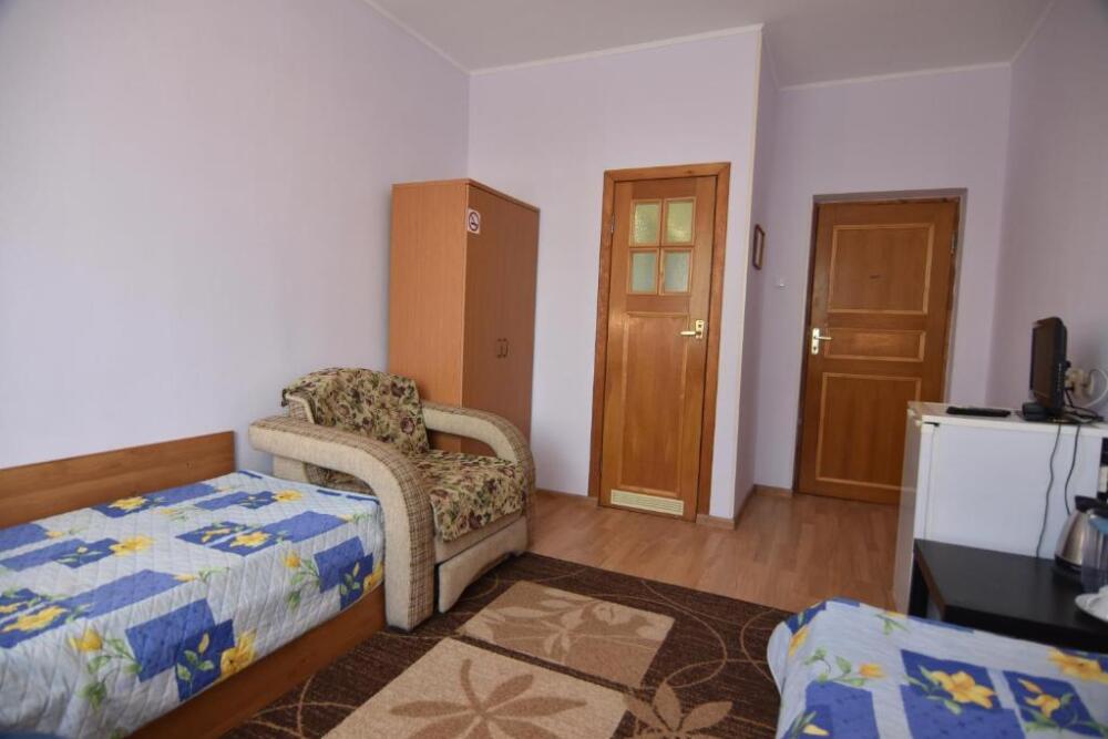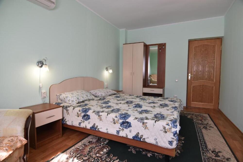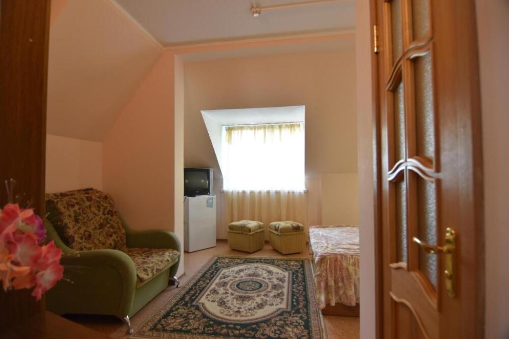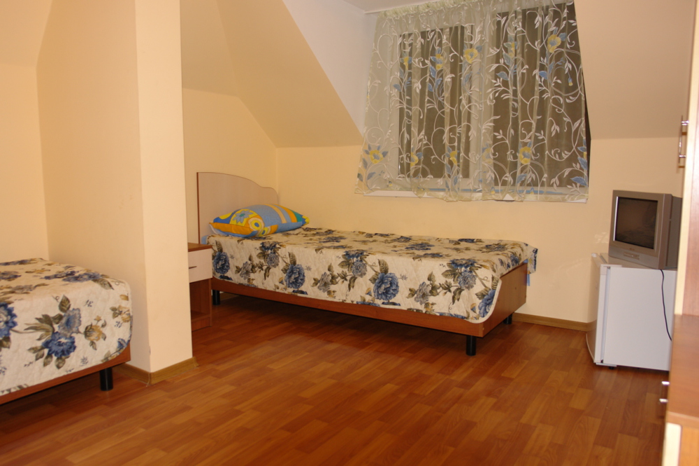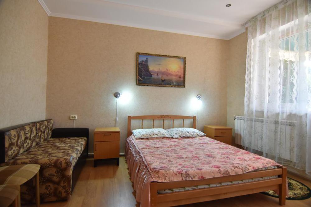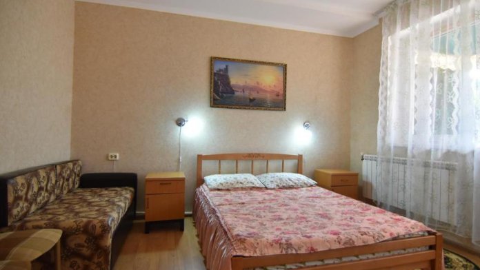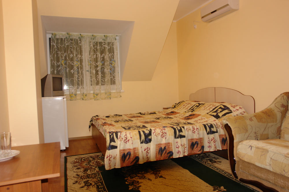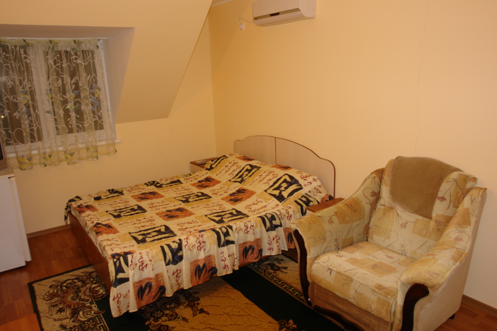 Домашняя комфортная обстановка дома ориентирована на отдых посетителей, к Вашим услугам есть стандартные номера и апартаменты. Просторный зелёный двор, где много цветов даст Вам возможность удобно отдохнуть на качелях-диванах и загореть на шезлонгах вокруг бассейна, наслаждаясь целебным морским воздухом и ласковым солнцем.