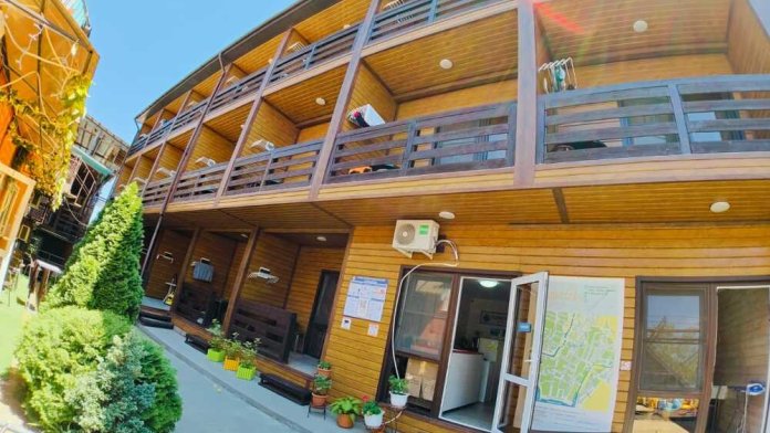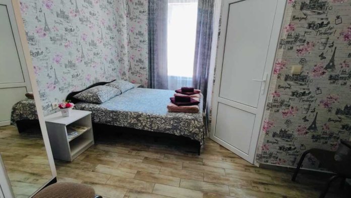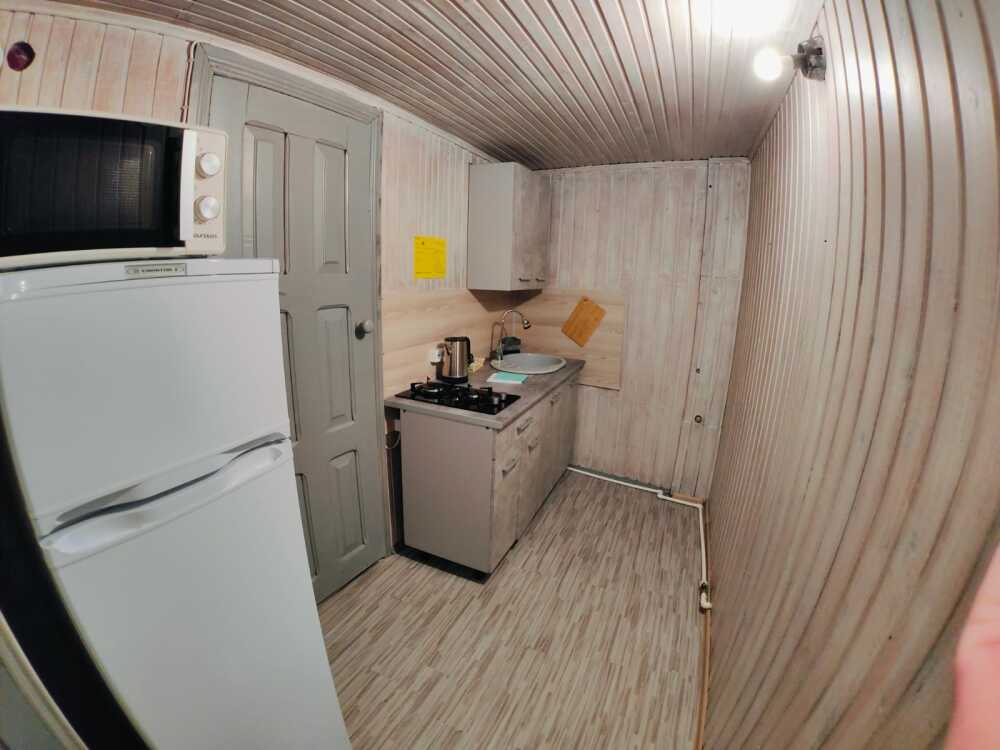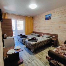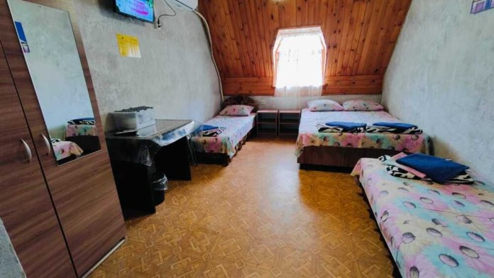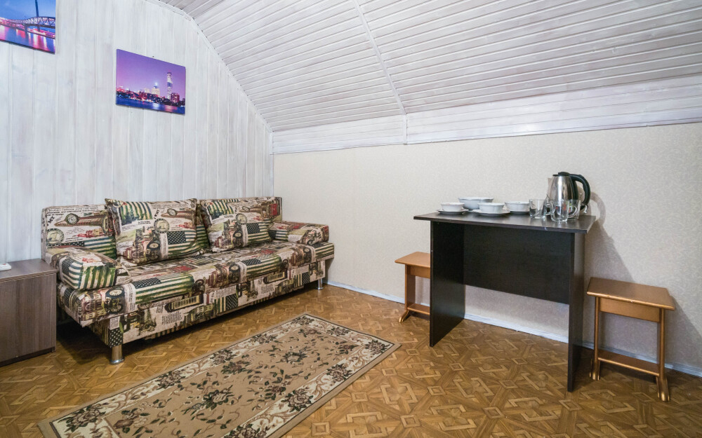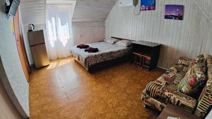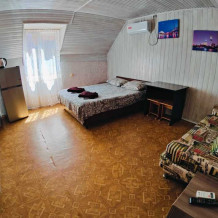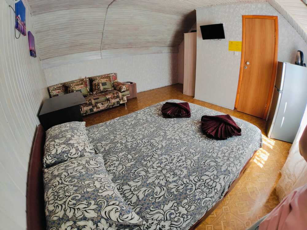 Уютный однокомнатный номер для 3-4 гостей, площадью 16 м² на 2 мансардном этаже, вход по коридору, где расположены- холодильники, гладильная доска, 2 душа и 2 туалета общего пользования, общий балкон и кухня для самостоятельного приготовления.