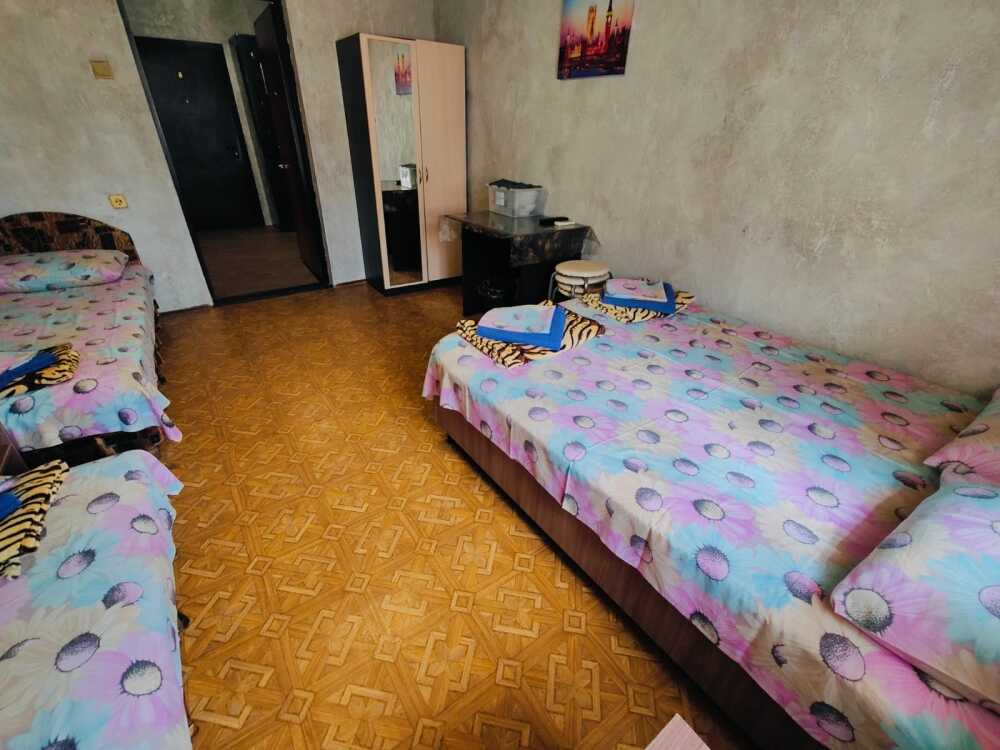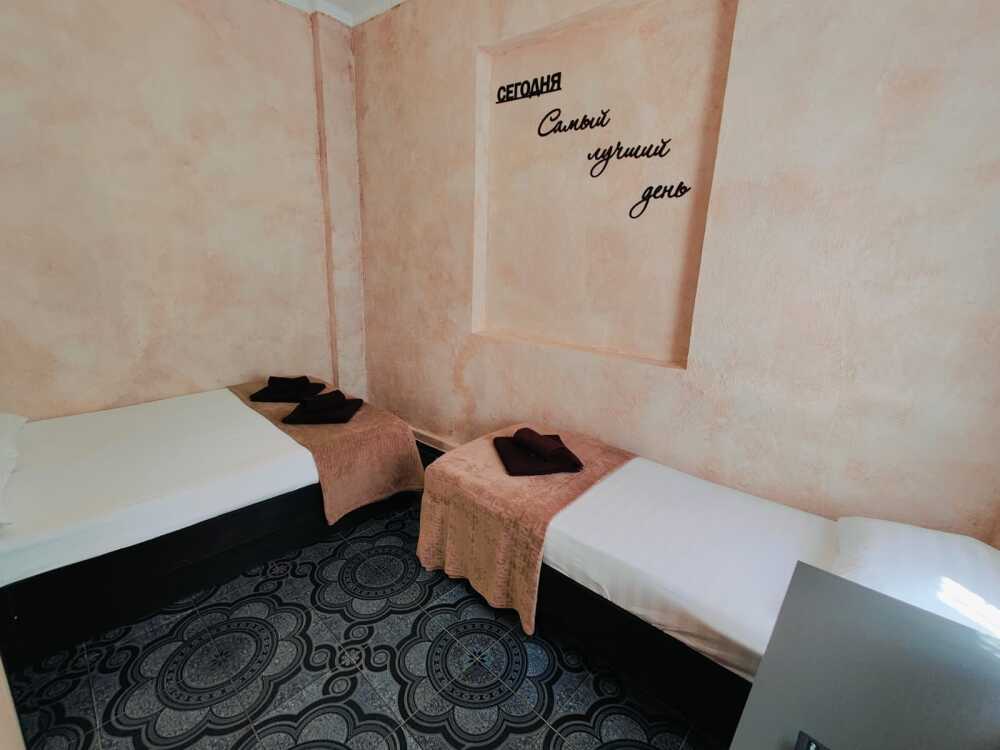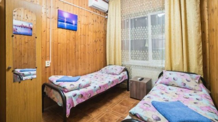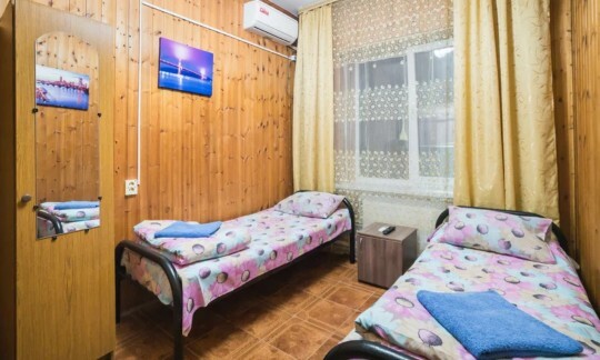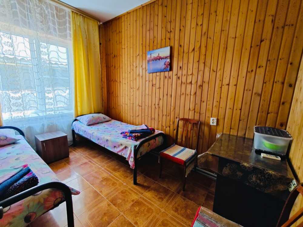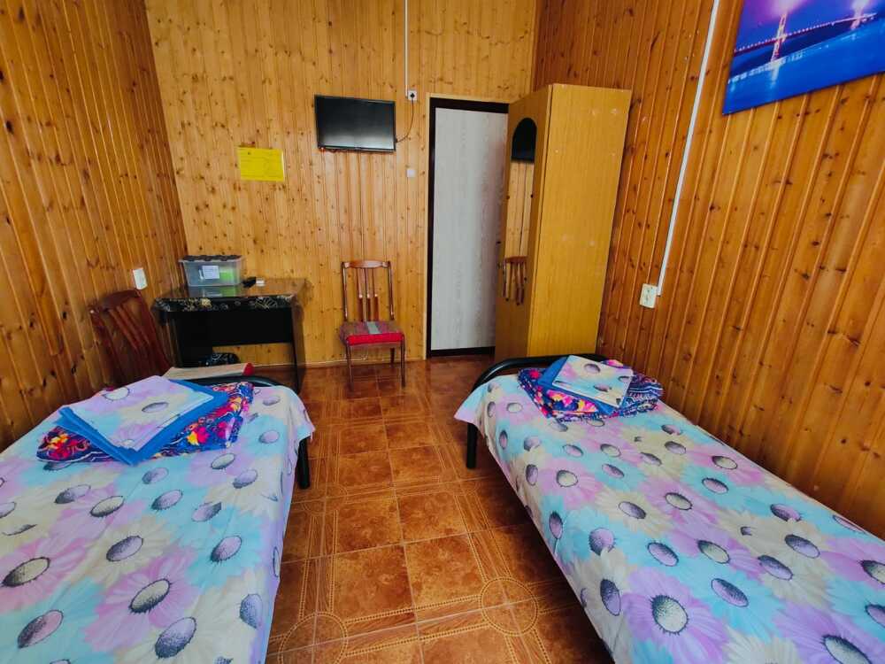 В номере : Две односпальные кровати ,шкаф, стол, стульчики, посуда на каждого гостя .Сплит система ,телевизор . Душ и туалет общий, на этаже.