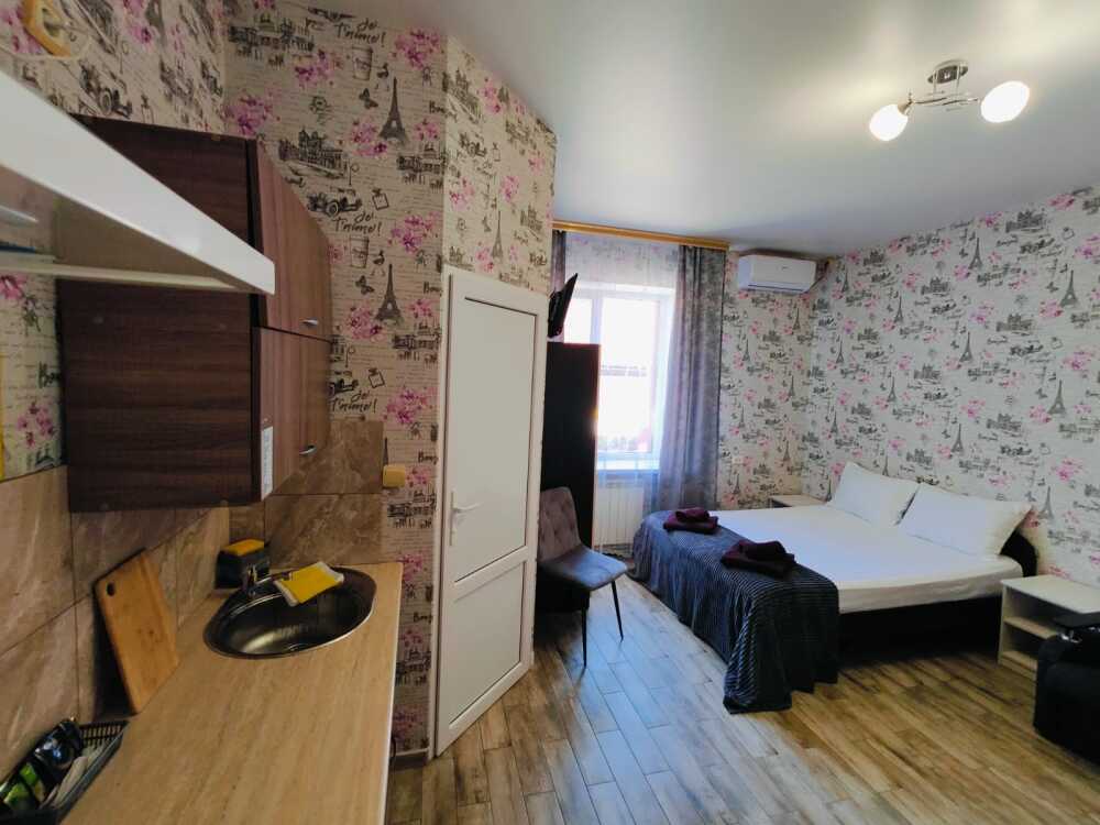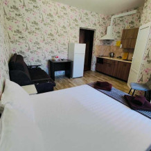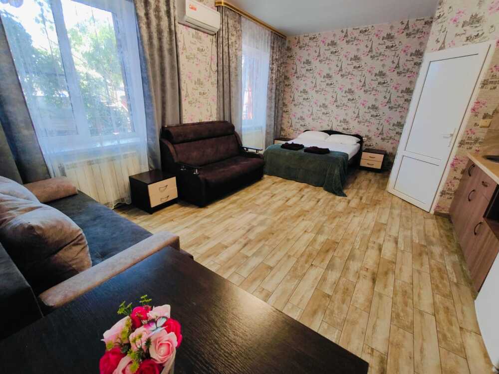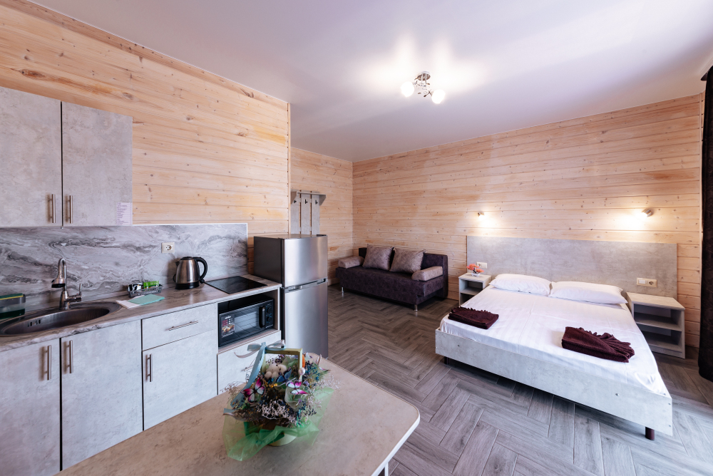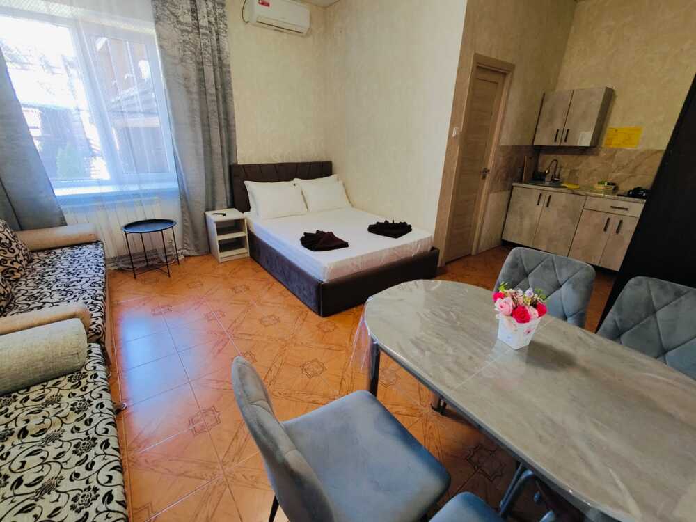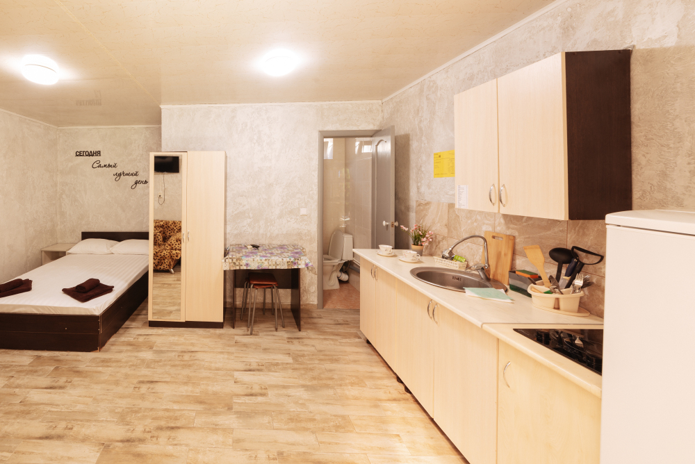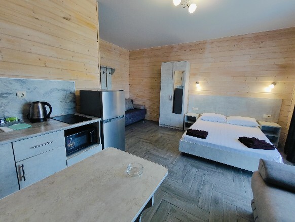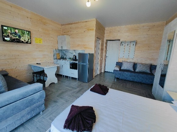 В номере есть все необходимое: кухонная зона, двухспальная кровать 1,4 м и диван-кровать 1.4 м, шкаф, прикроватная тумба, обеденная зона, tv, холодильник, сплит - система, фен, чайник, микроволновая печь, варочная панель, набор посуды, набор полотенец, совмещённый санузел и косметика для ванны. Гладильная доска, утюг.