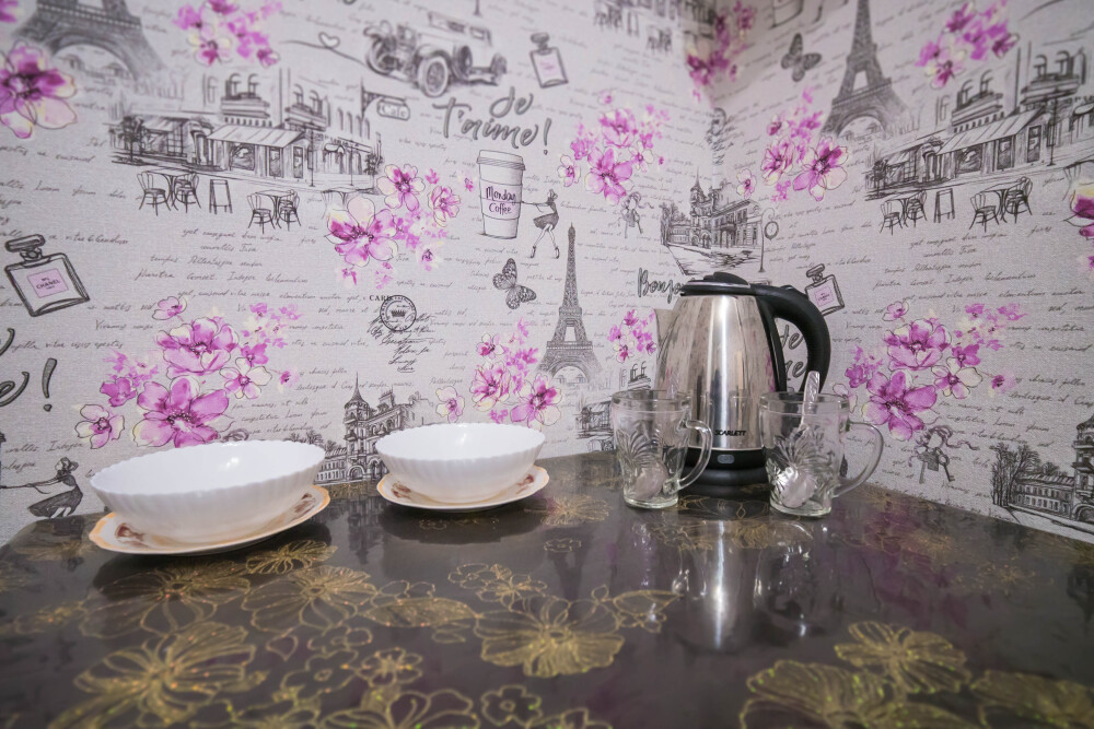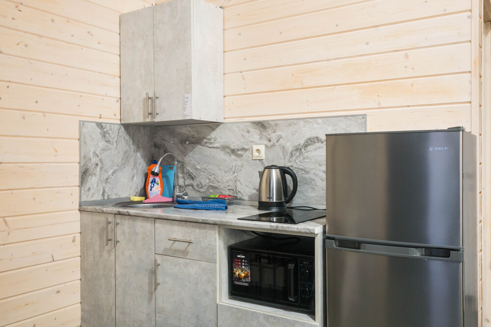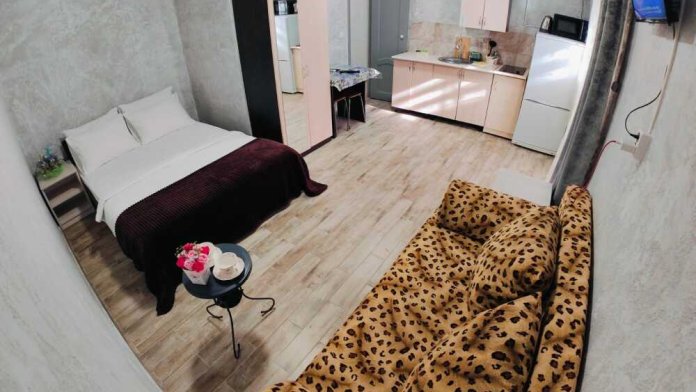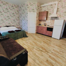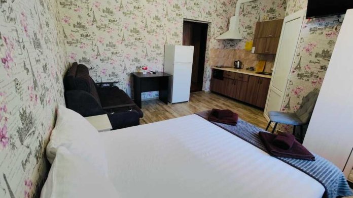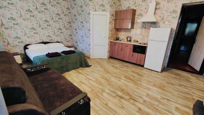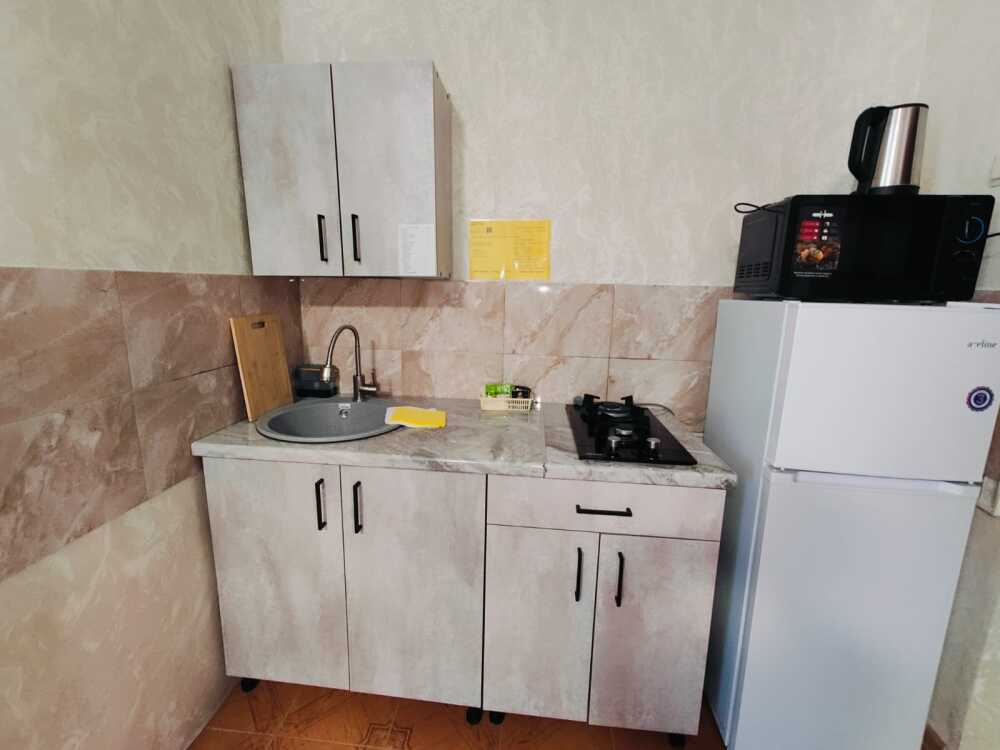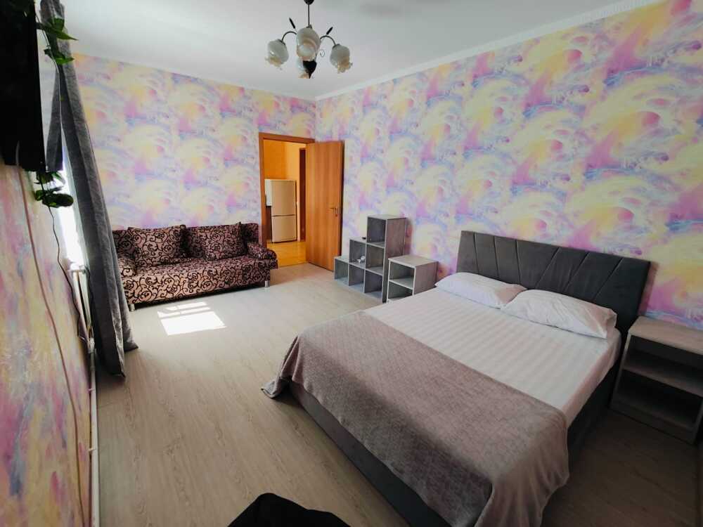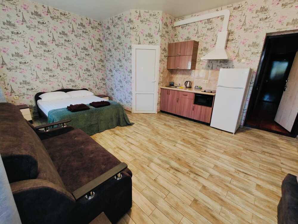 В номере есть все необходимое: кухонная зона, двухспальная кровать 1,4 м и диван-кровать 1.4 м, шкаф, прикроватная тумба, обеденная зона, tv, холодильник, сплит - система, фен, чайник, микроволновая печь, варочная панель, набор посуды, набор полотенец, совмещённый санузел и косметика для ванны. Гладильная доска, утюг.