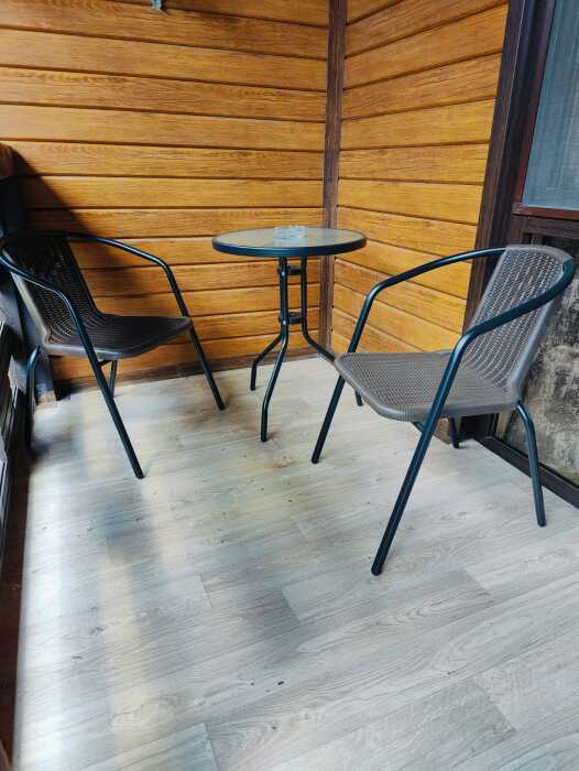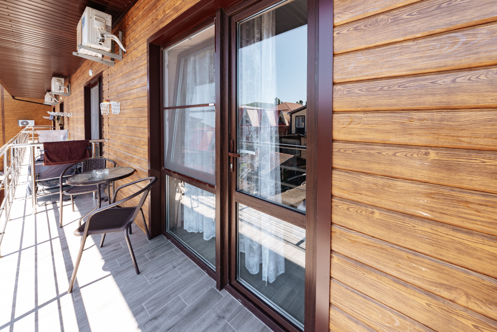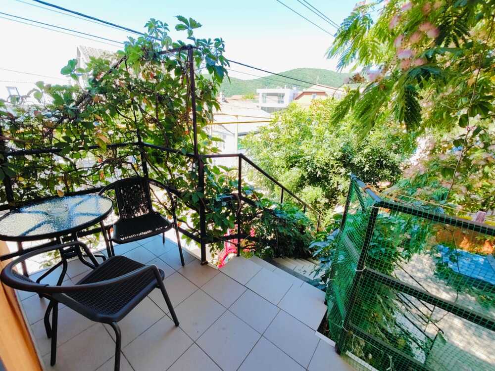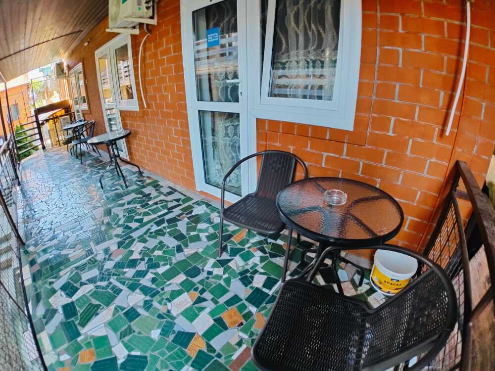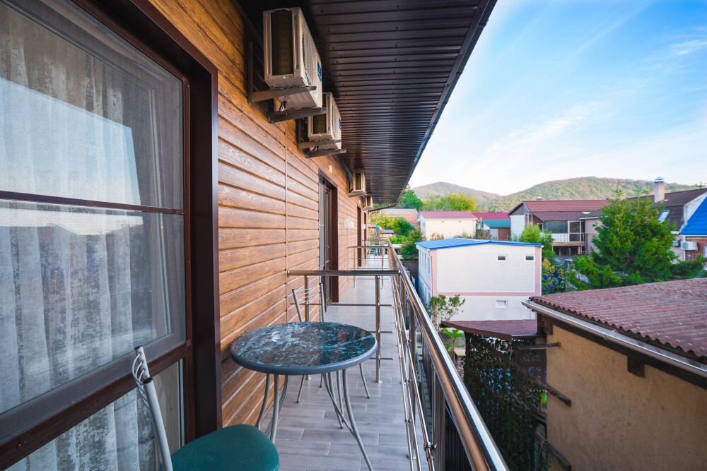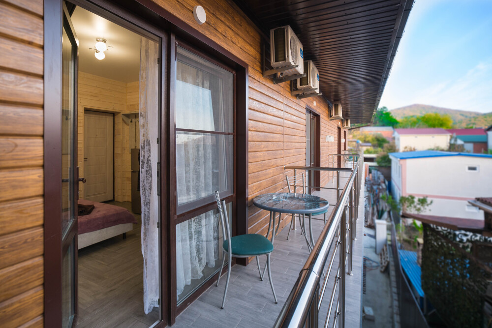 Уютный однокомнатный номер для 3-5 гостей, площадью 23 кв. м на 2-3 этаже, с балконом и столиком на нем.