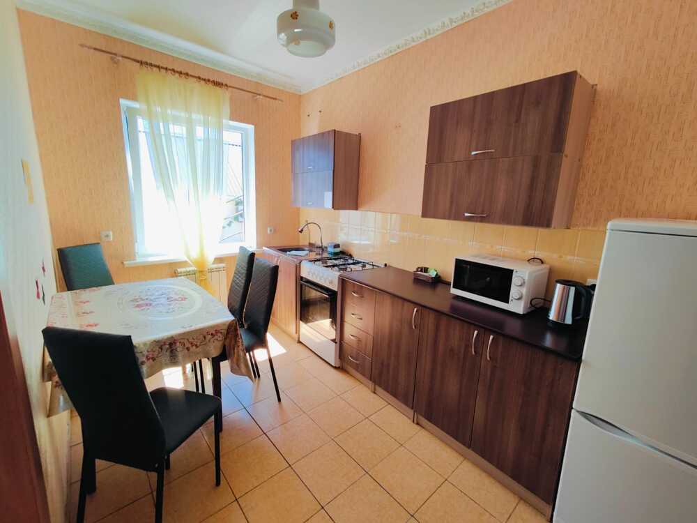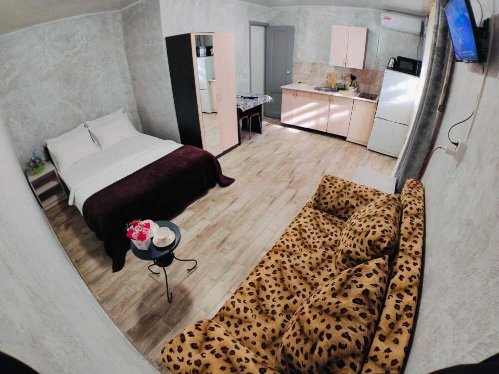 В номере есть все необходимое: кухонная зона, двухспальная кровать 1,4 м и диван- кровать 1.4 м, шкаф, прикроватная тумба, стол, TV, холодильник,сплит - система, фен,чайник, микроволновая печь,варочная панель,набор посуды ,набор полотенец, совмещённый санузел и косметика для ванны.