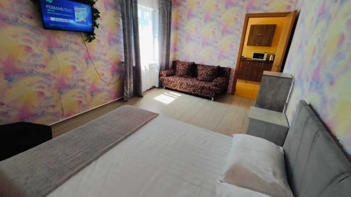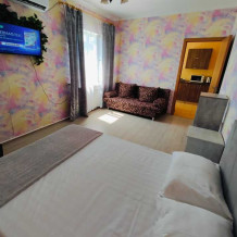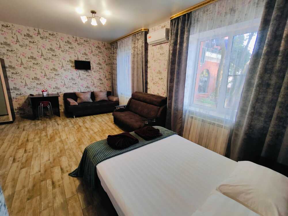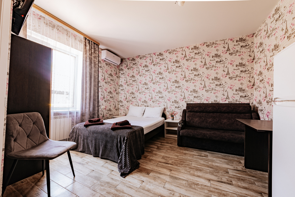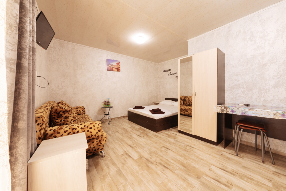 В номере есть все необходимое: двухспальная кровать 1, 4 м и диван - кровать 1. 4 м, шкаф, прикроватная тумба, письменный стол, tv, холодильник, сплит - система, фен, чайник, микроволновая печь, набор посуды, набор полотенец, совмещённый санузел и косметика для ванны.