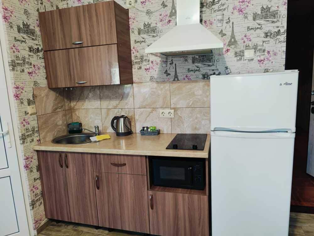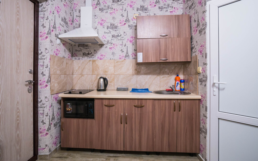 Уютный однокомнатный номер с кухней для 4-6 гостей, площадью 25 м² на 1 этаже, вход по коридору.