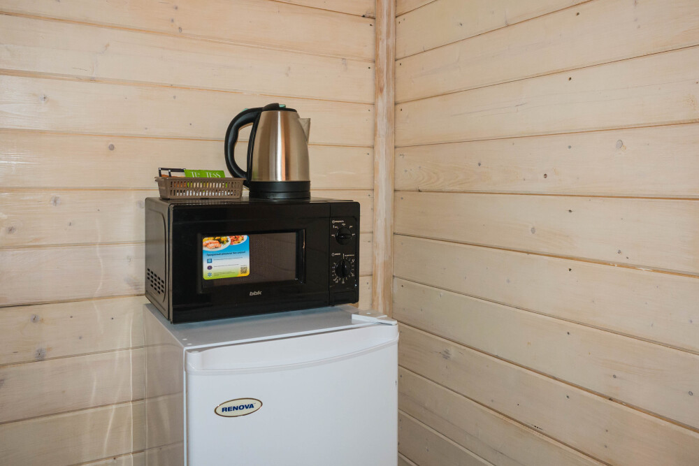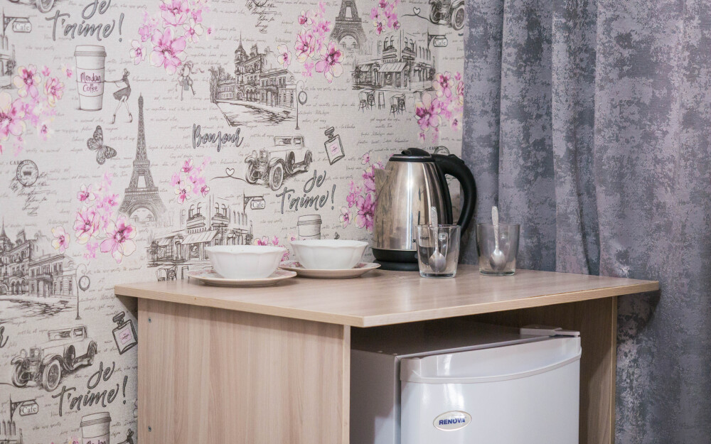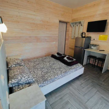 Комплектация номера: двуспальная кровать размером 140*200 см , шкаф для одежды с плечиками, сплит система ; телевизор с дистанционным управлением, холодильник и чайник, набор посуды.
