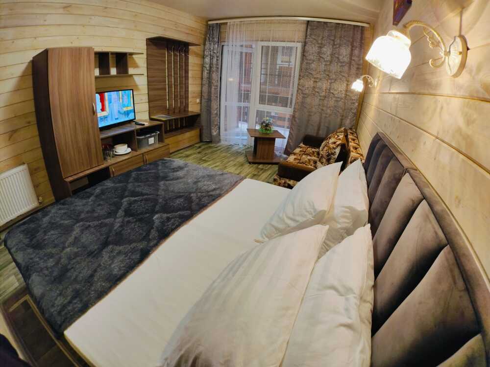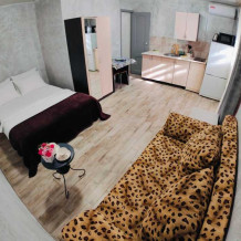 В номере есть все необходимое: кухонная зона, двухспальная кровать 1,4 м и диван- кровать 1.4 м, шкаф, прикроватная тумба, стол, TV, холодильник,сплит - система, фен, чайник, микроволновая печь,варочная панель, набор посуды, набор полотенец, совмещённый санузел и косметика для ванны.