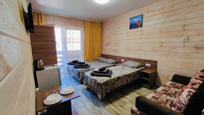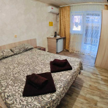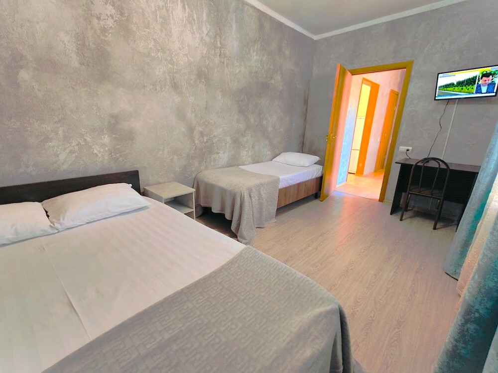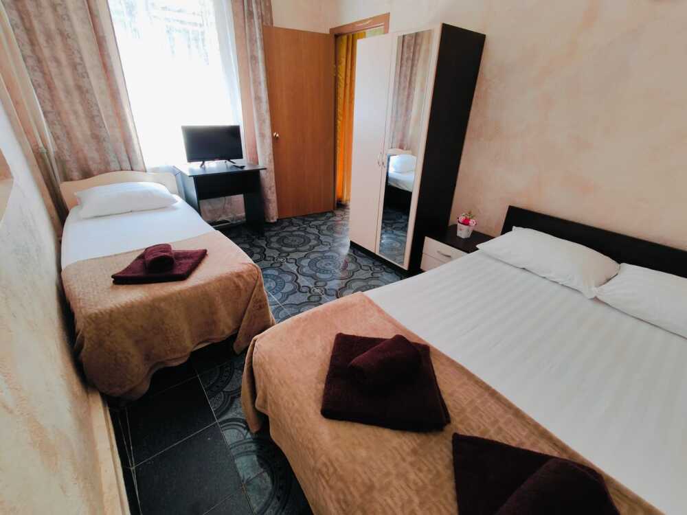 В номере есть все необходимое: двухспальная кровать 1,4 м, односпальная кровать 80 см и диван — кровать 1.4 м, шкаф, прикроватная тумба, письменный стол, TV, холодильник, сплит-система, фен, чайник, набор посуды, набор полотенец, совмещённый санузел и косметика для ванны.