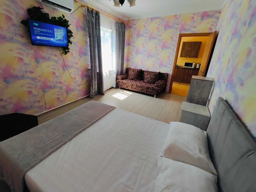 В номере есть все необходимое: кухонная зона, двухспальная кровать 1,4 м и два дивана- кровать 1.4 м, шкаф, прикроватная тумба, стол, tv, холодильник, сплит - система, фен, чайник, микроволновая печь, варочная панель, набор посуды, набор полотенец, совмещённый санузел и косметика для ванны.