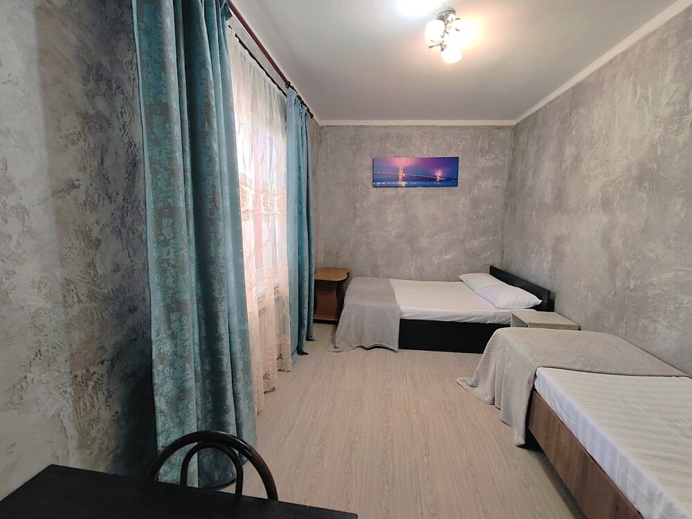 В номере есть все необходимое: 4 односпальные кровати, шкаф, прикроватная тумба, письменный стол, tv, сплит - система, набор посуды, набор полотенец, совмещённый санузел рядом в коридоре.