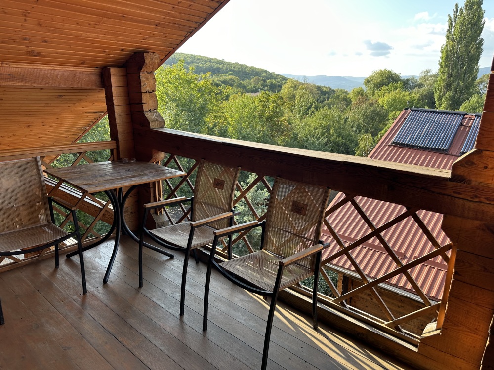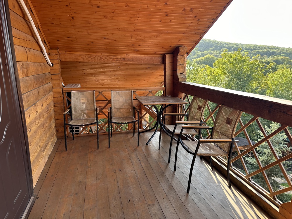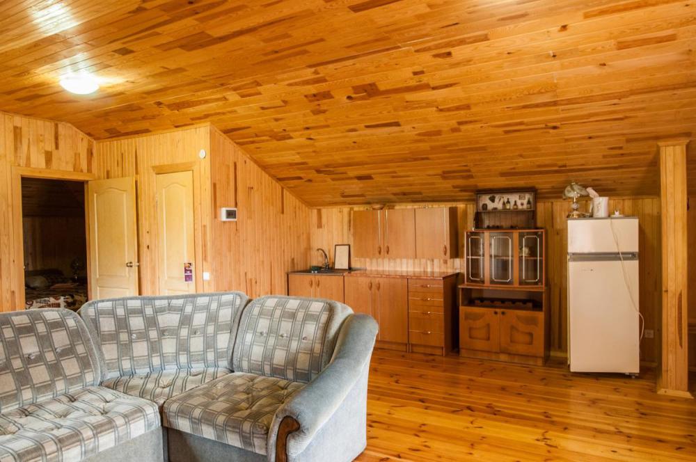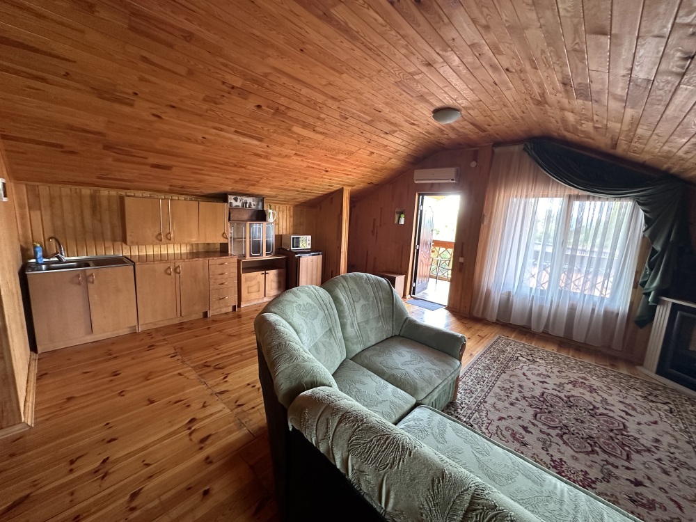 Трехкомнатный семейный номер находится на третьем этаже (мансардный). В номере две спальни с двуспальными кроватями и большой зал. В зале раскладной диван двухместный, мягкий уголок, камин, обеденный стол, небольшой кухонный уголок с раковиной, чайником и микроволновкой. Также в номере есть кондиционер, холодильник, телевизор и электро обогреватели. Перед номером небольшая терраса со столом и стульями.