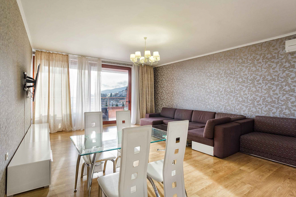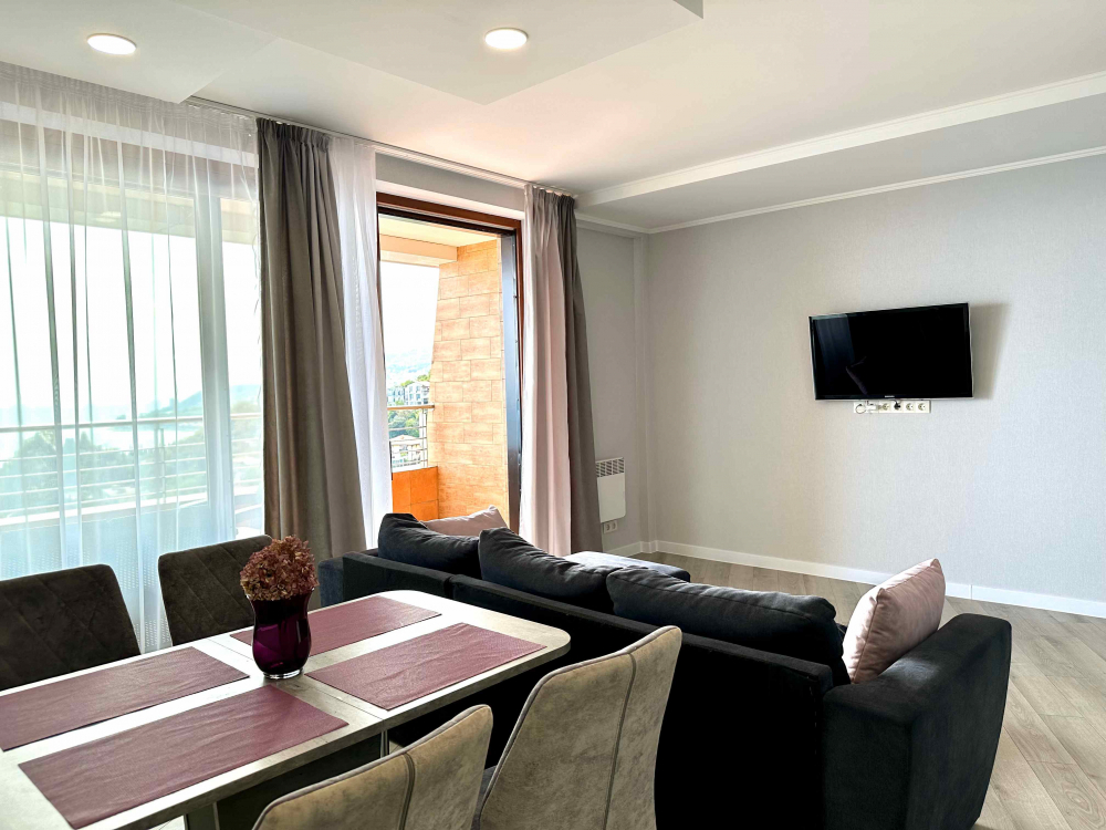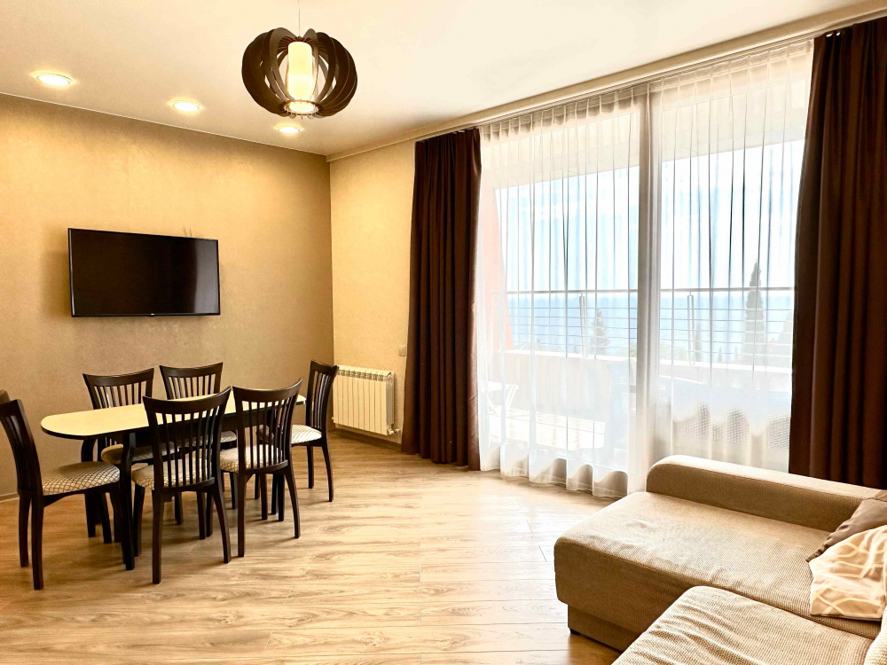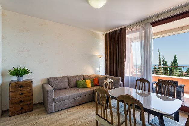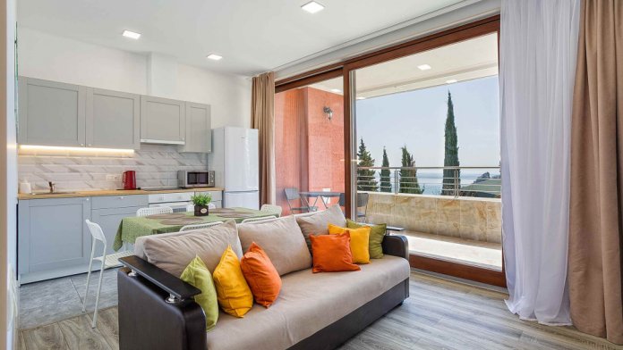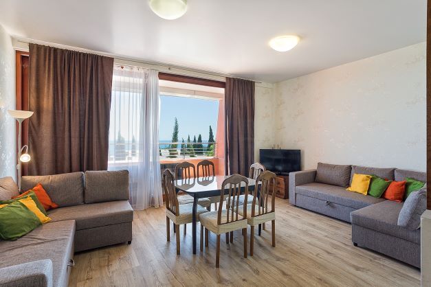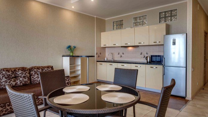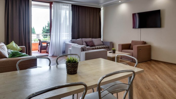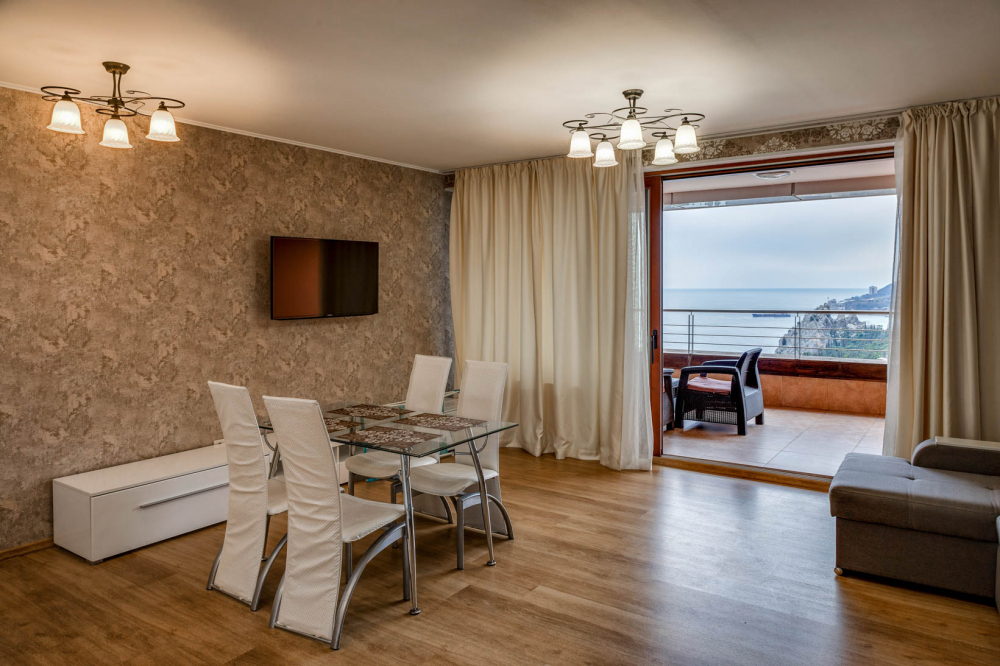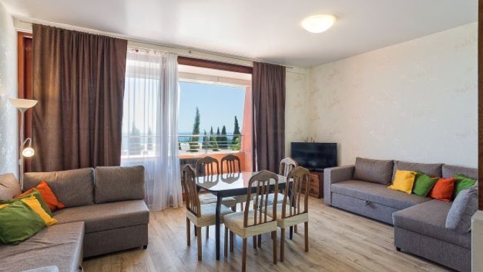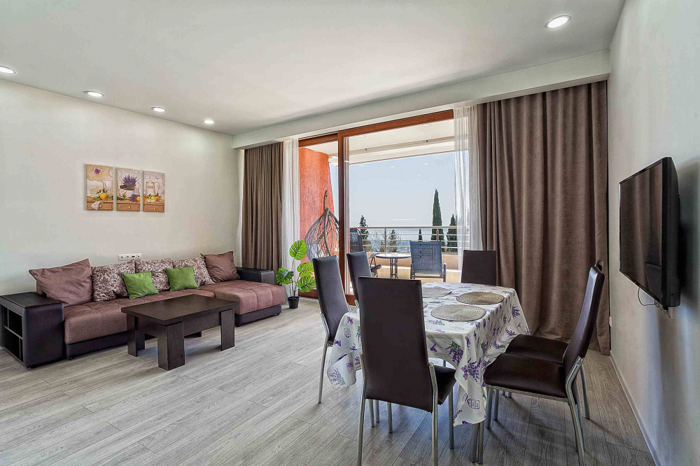 Все апартаменты укомплектованы современной бытовой техникой. В каждых апартаментах имеются постельные принадлежности - белье и полотенца, а так же необходимый набор кухонных принадлежностей и посуды. Комплектация апартаментов отвечает самым высоким требованиям. Из всех апартаментов открывается незабываемый вид на море и горы.