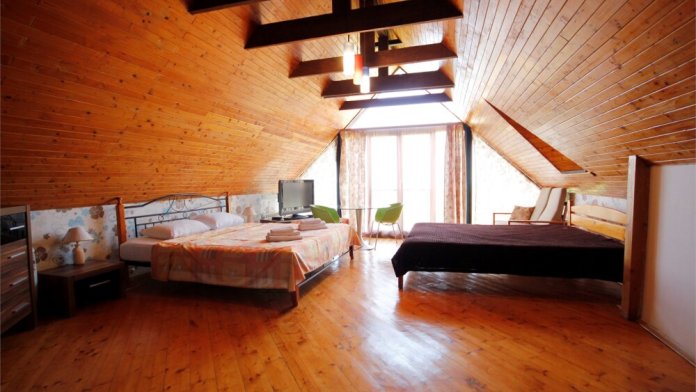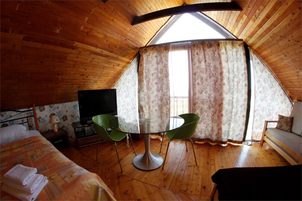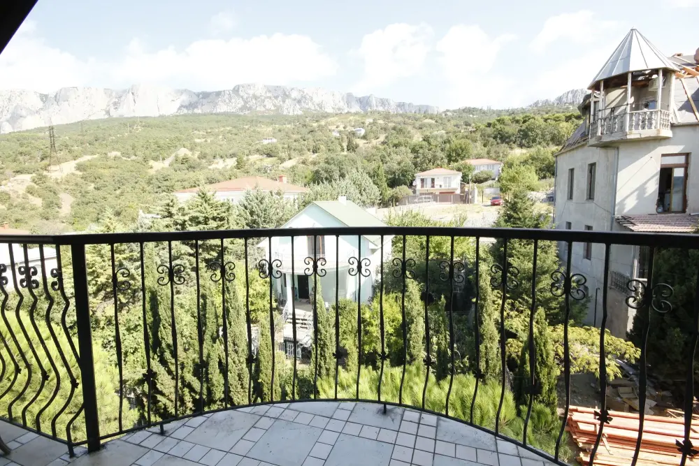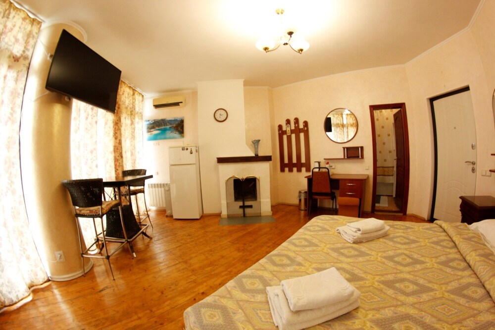 Уютный семейный номер с камином и огромным балконом с видом на море и горы.
